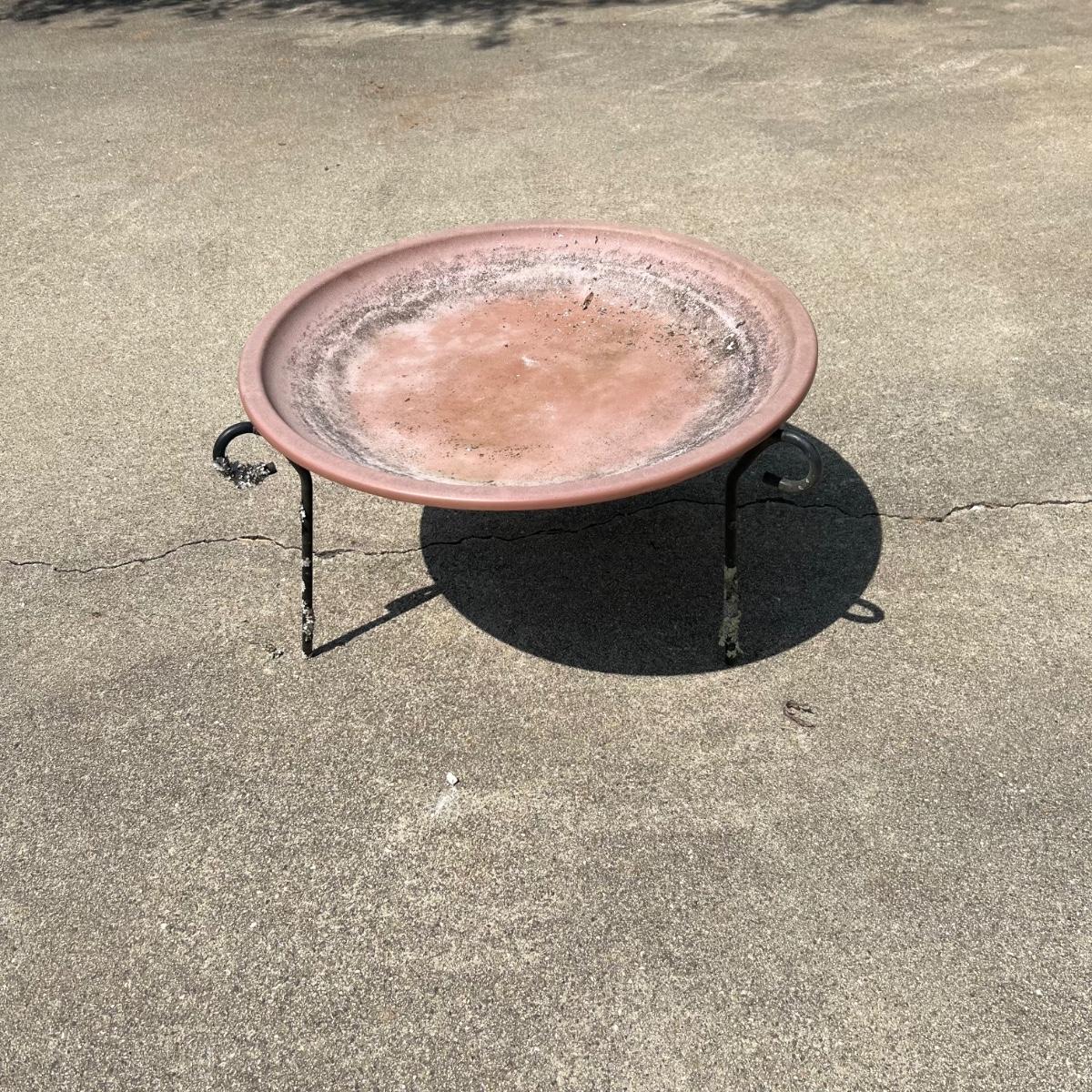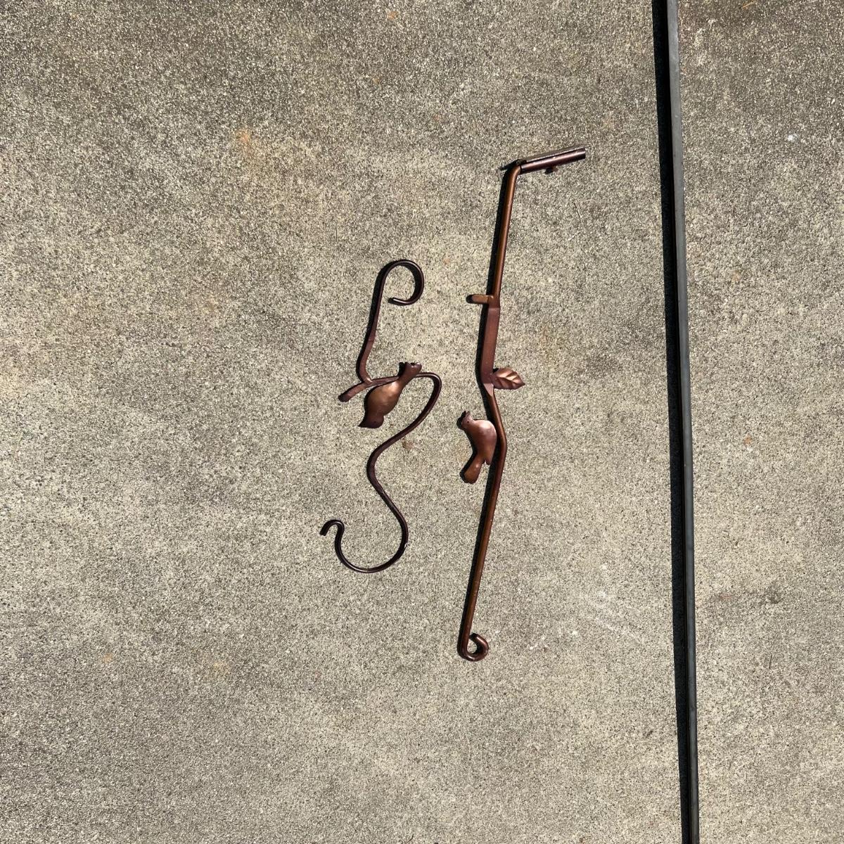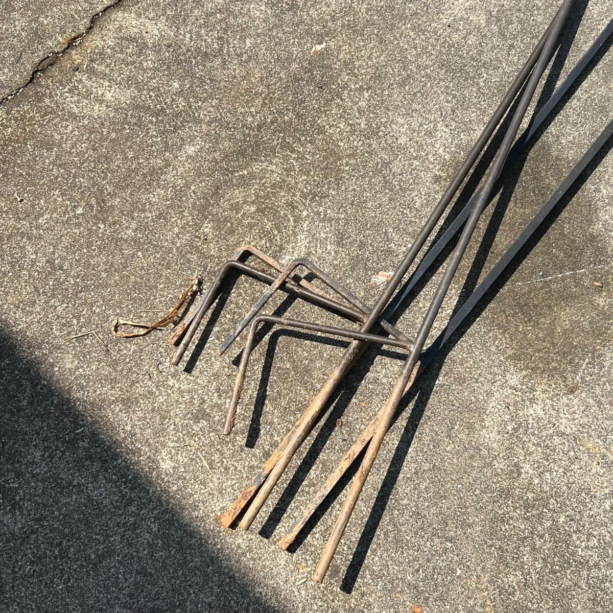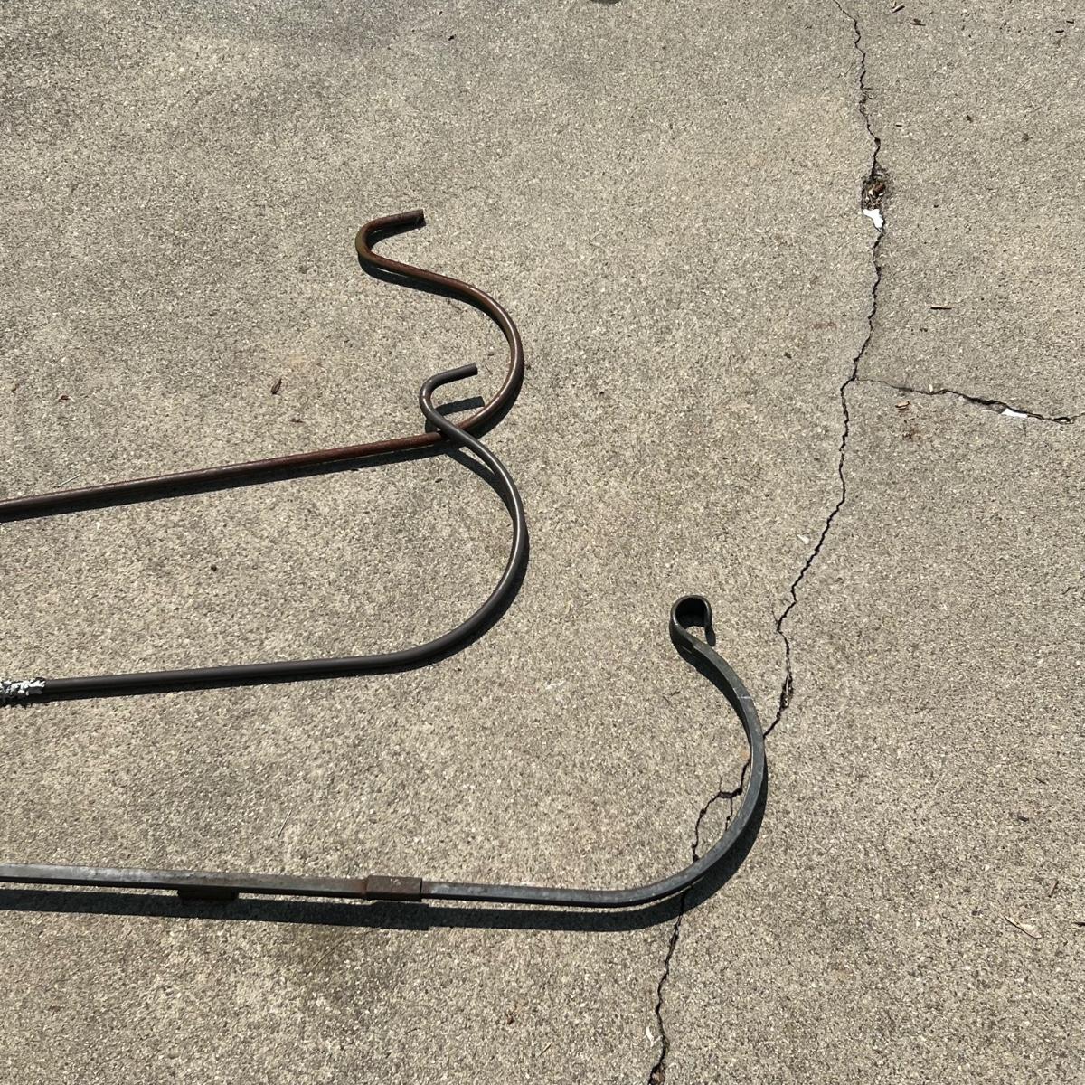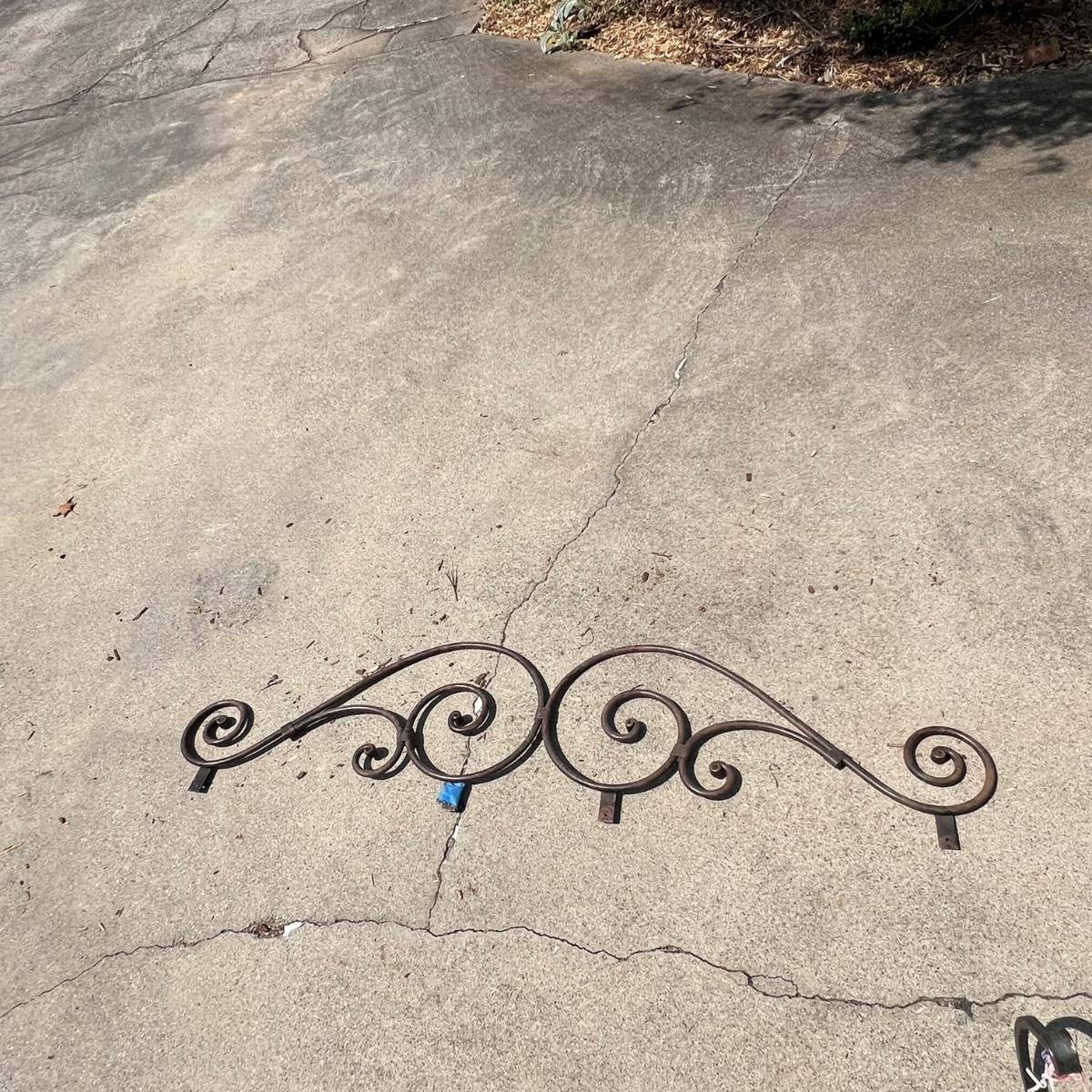 This metal lot includes seven shepherds hooks and five smaller stakes for hanging flags etc. lot also includes a few bracket hooks for the wall and a vintage metal long bracket that has a swirled scroll design which measures 58” wide x 18” H; screws are included. The pot stand has a plastic dish which is 21”D with 11” H metal stand.