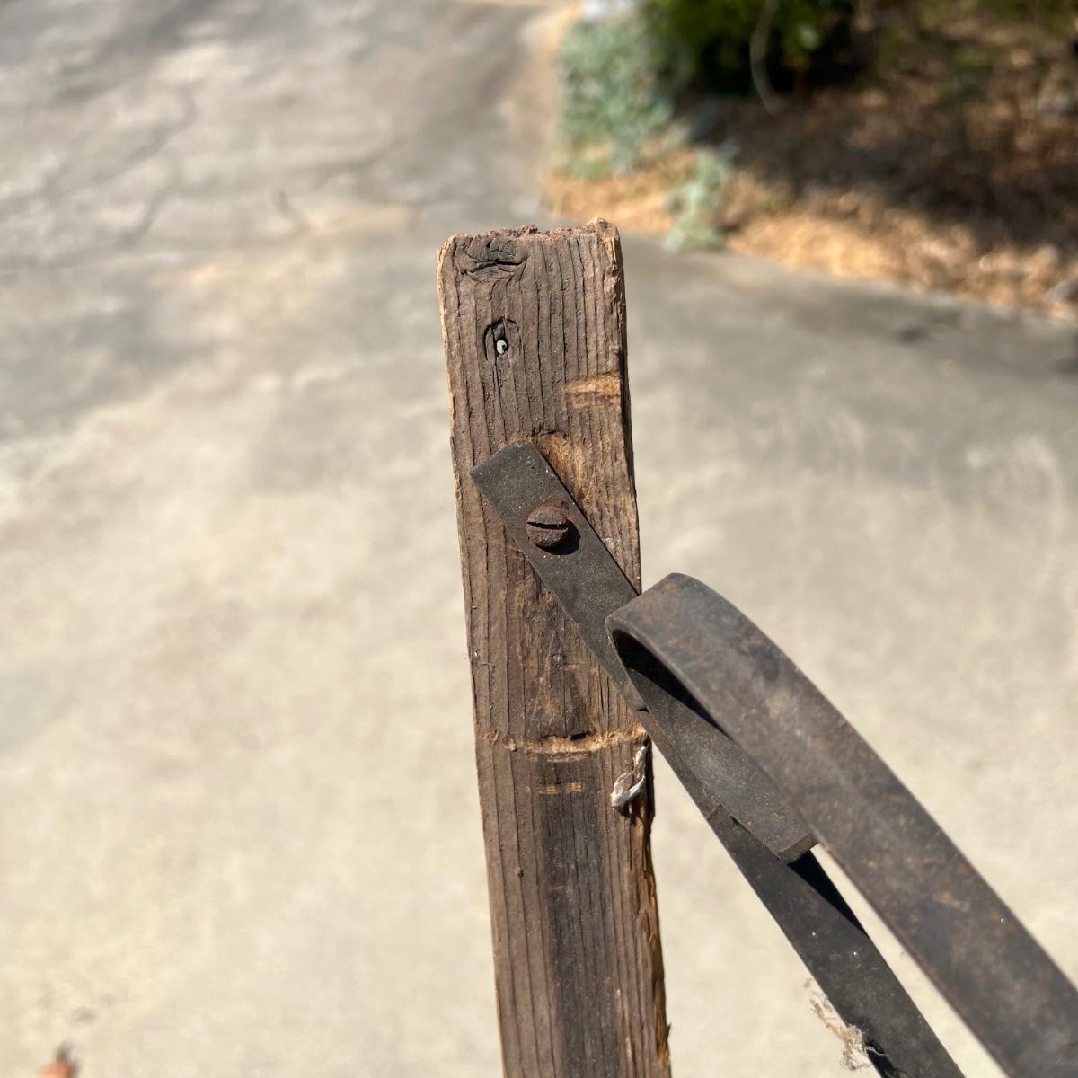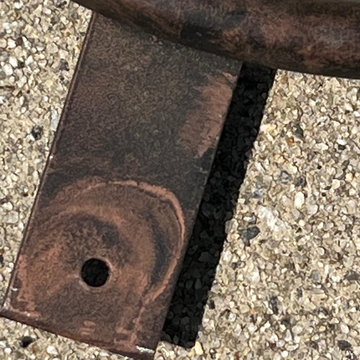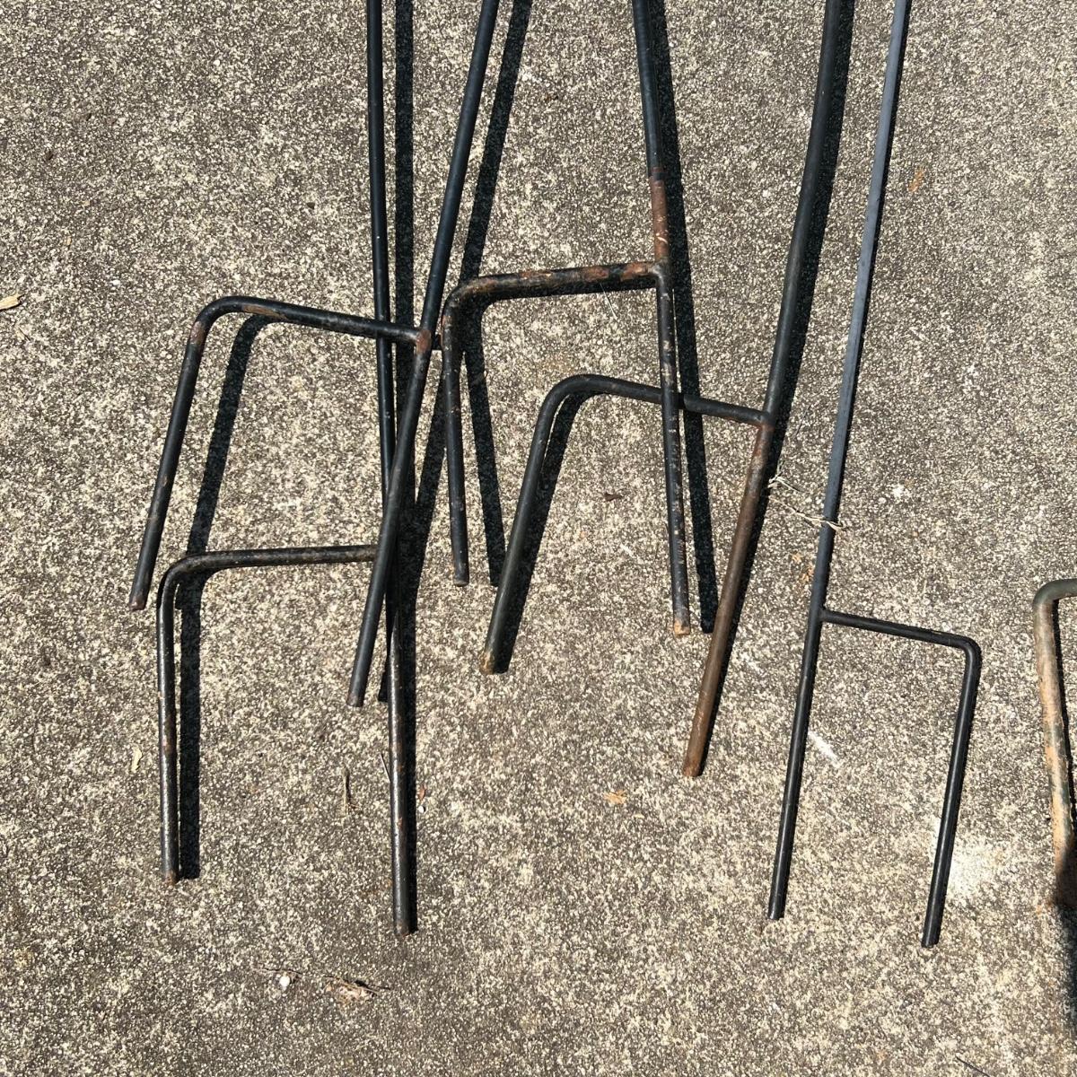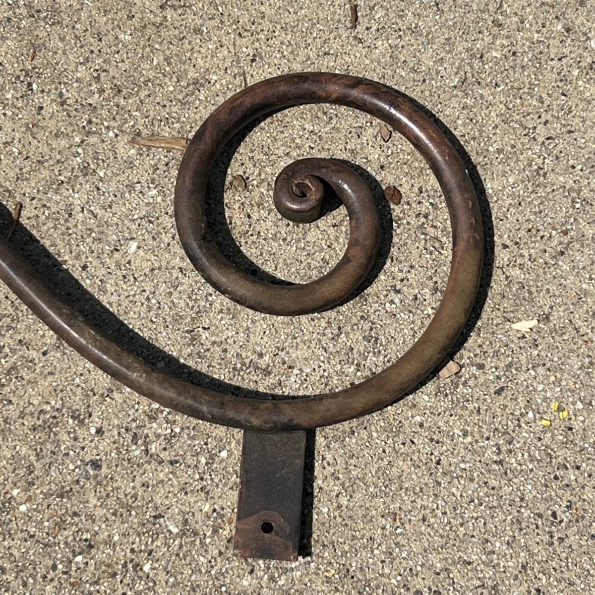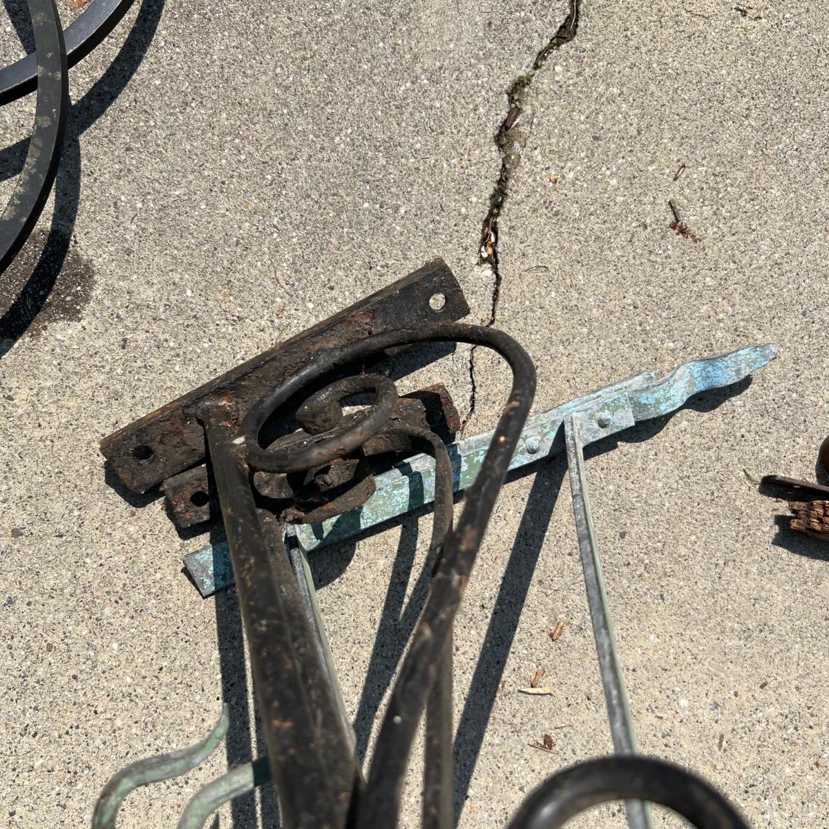 This metal lot includes seven shepherds hooks and five smaller stakes for hanging flags etc. lot also includes a few bracket hooks for the wall and a vintage metal long bracket that has a swirled scroll design which measures 58” wide x 18” H; screws are included. The pot stand has a plastic dish which is 21”D with 11” H metal stand.