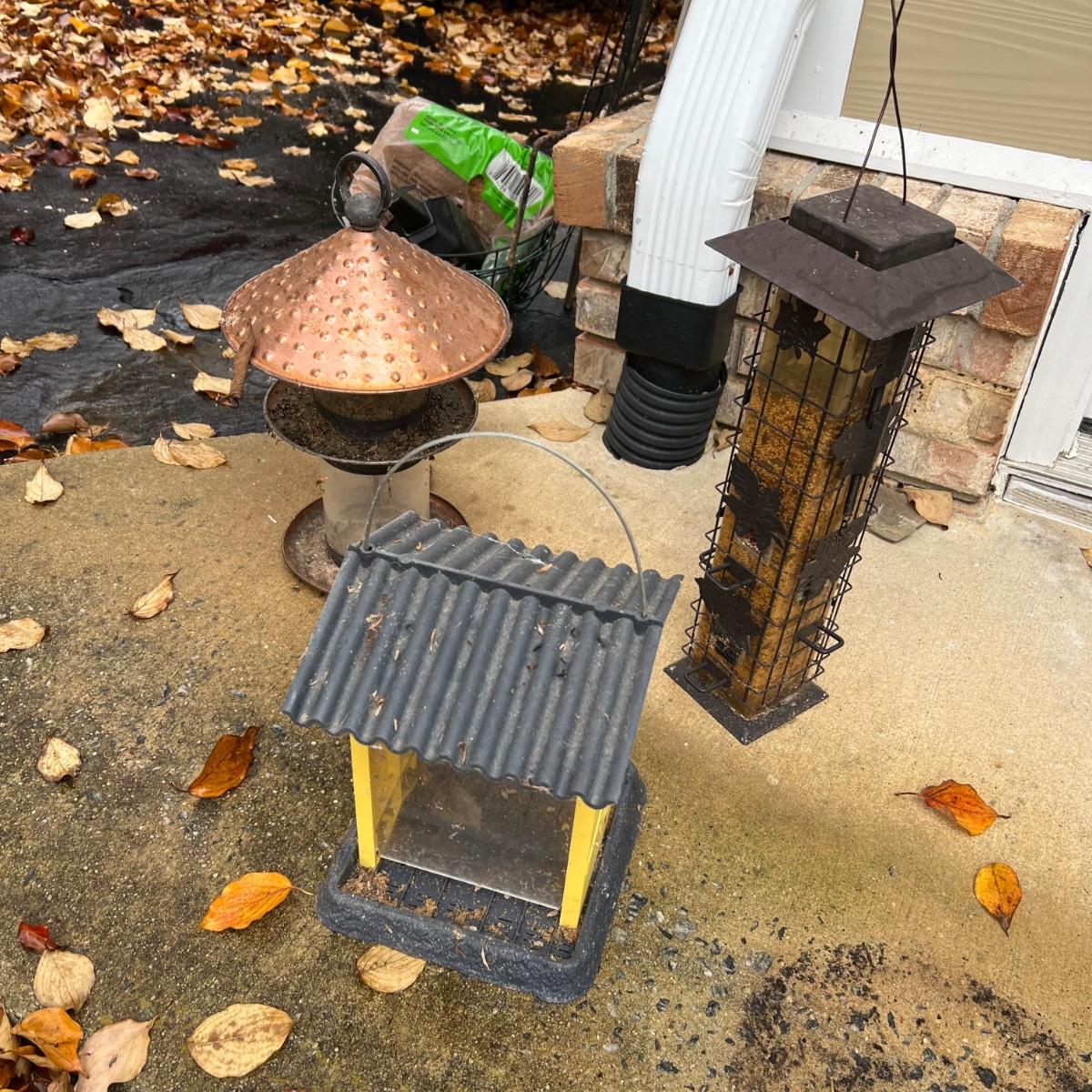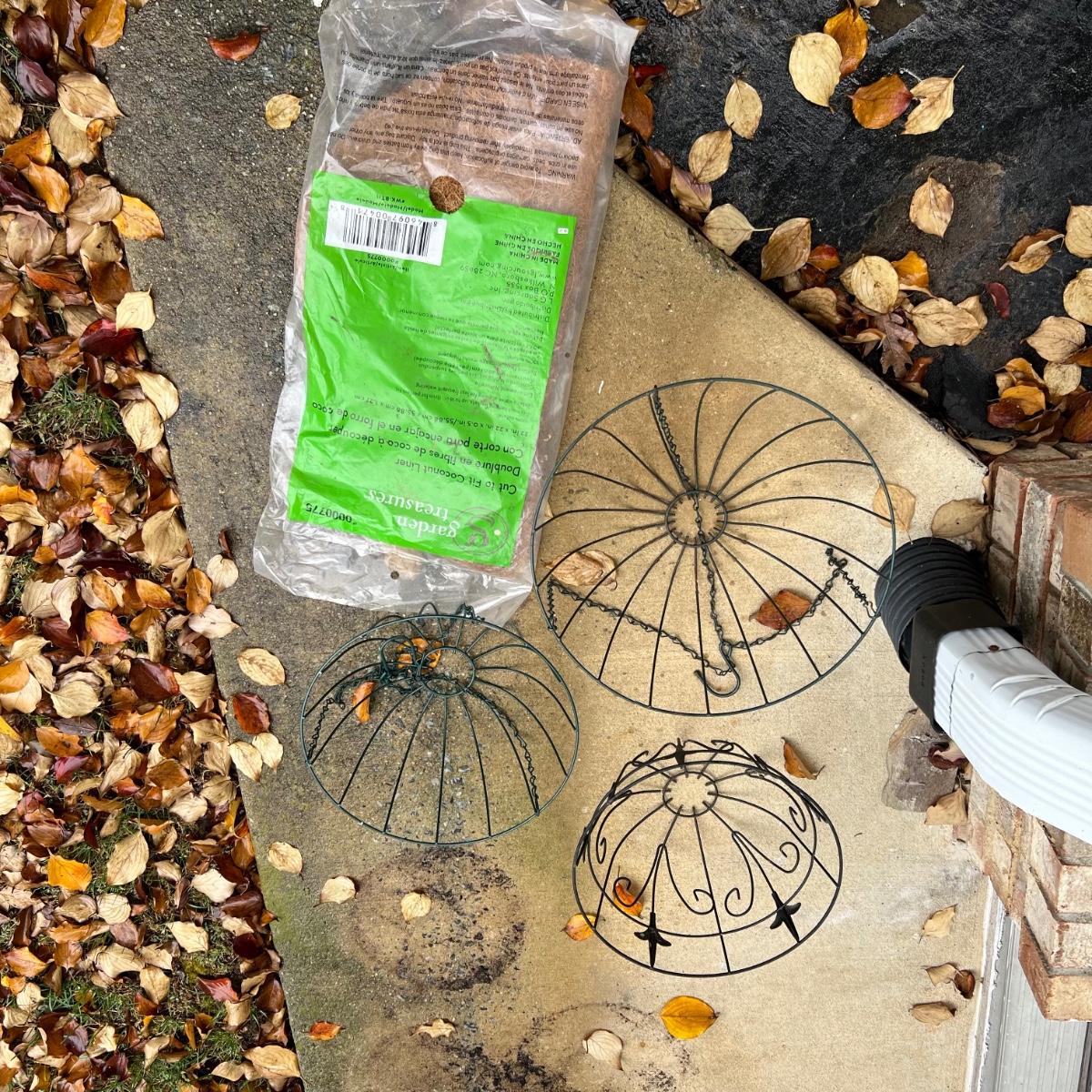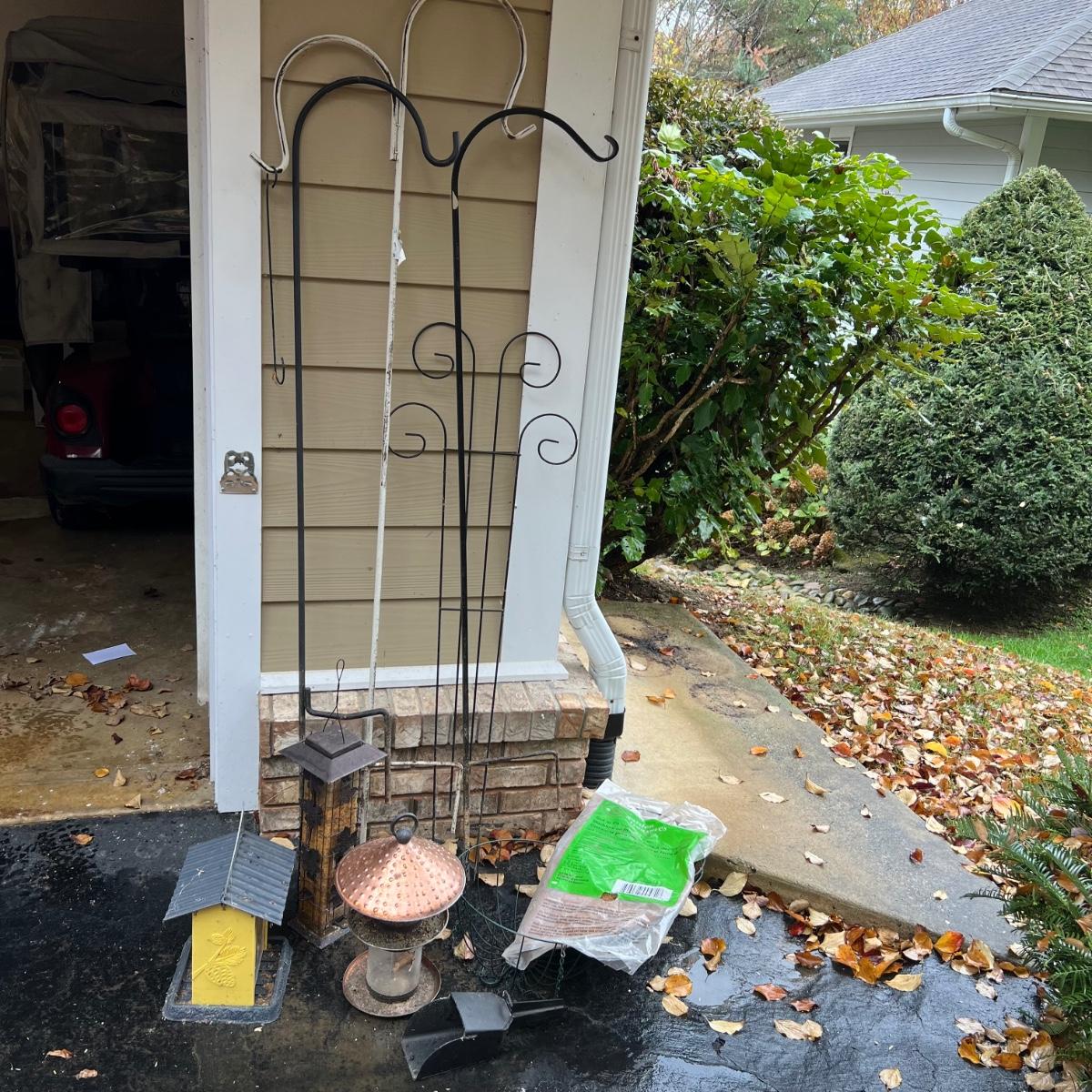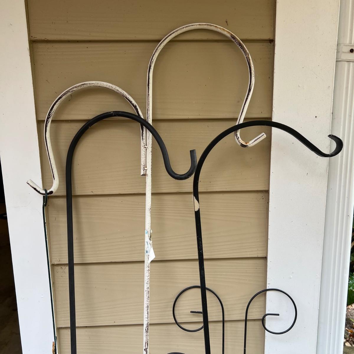 Three shepherd's hooks, white one is 72“H. Lot also includes three wire hanging baskets and some coir lining, bird feeders and scoop. Of the three feeders, they are a combination of plastic seed holders with metal tips. Copper colored feeder measures 9”D x 14”H.