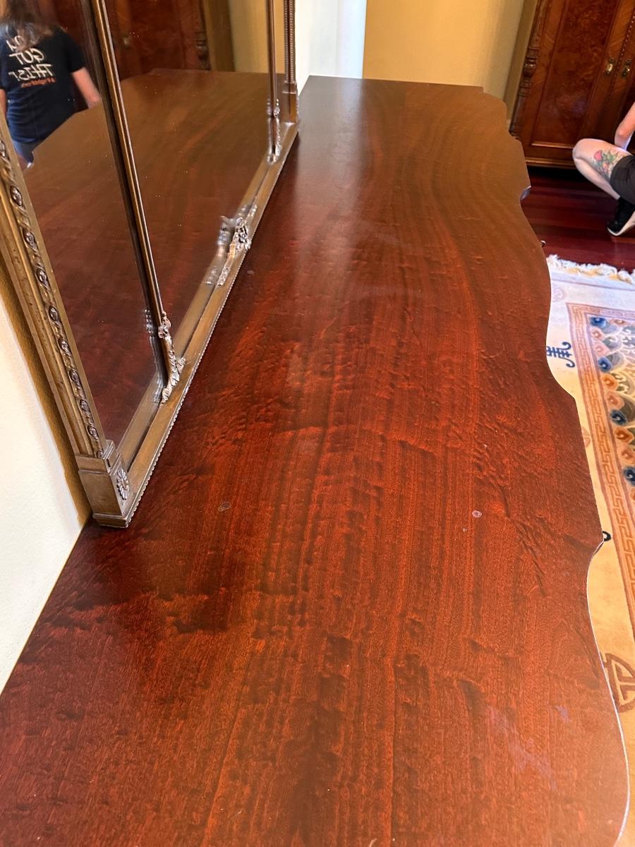 Inlaid ~ has normal wear and surfaces scratches ~ top has wear (see photo) ~ 8 legs ~ 39” H x 78” W x 23” D ~ Has a key