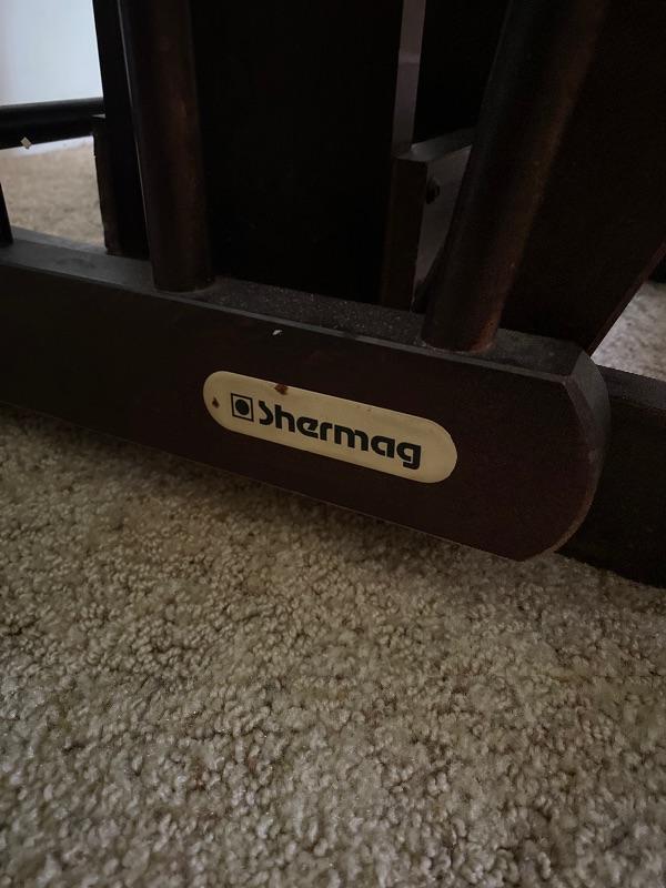 Dark wood glider rocker with ottoman. Made by Shermag. Moves smoothly. Cushions on seat can be removed. Missing original seat cushion. Some wear to finish by armrest. Stands 38” at the back. 23” wide.
