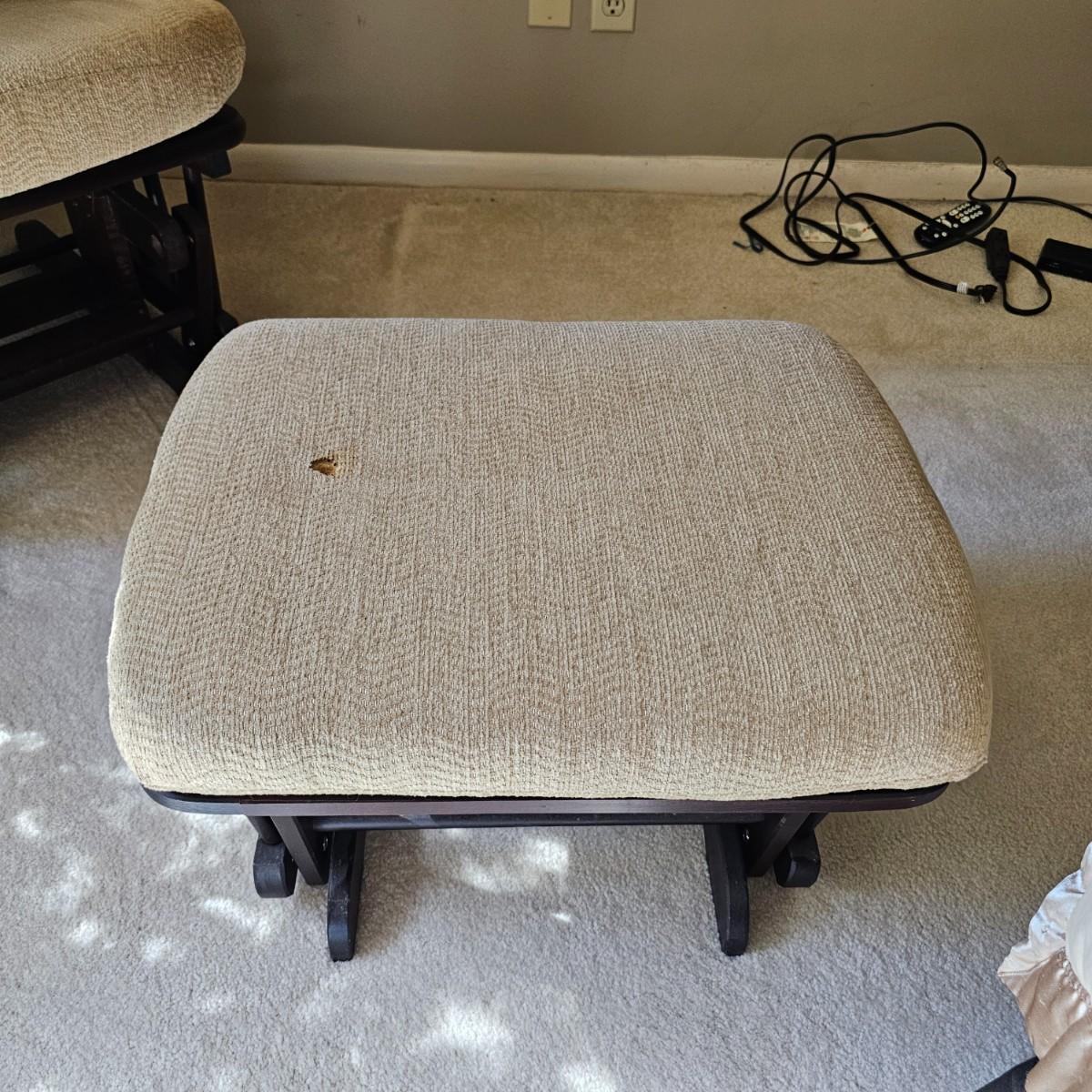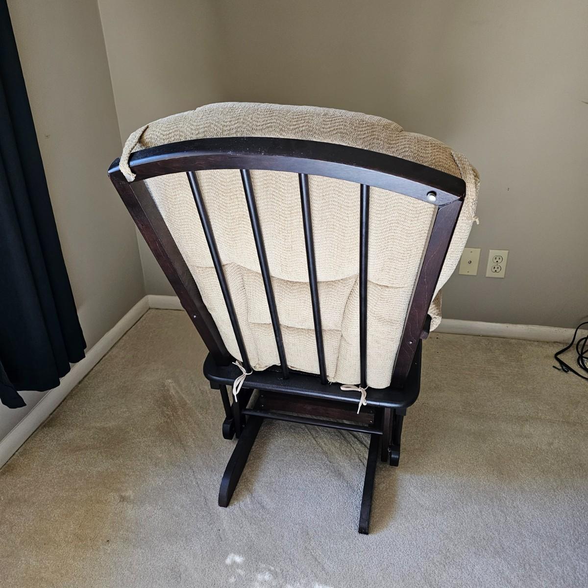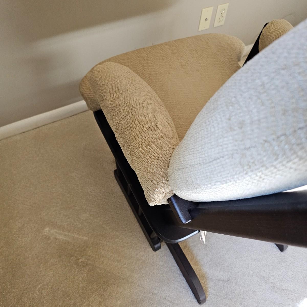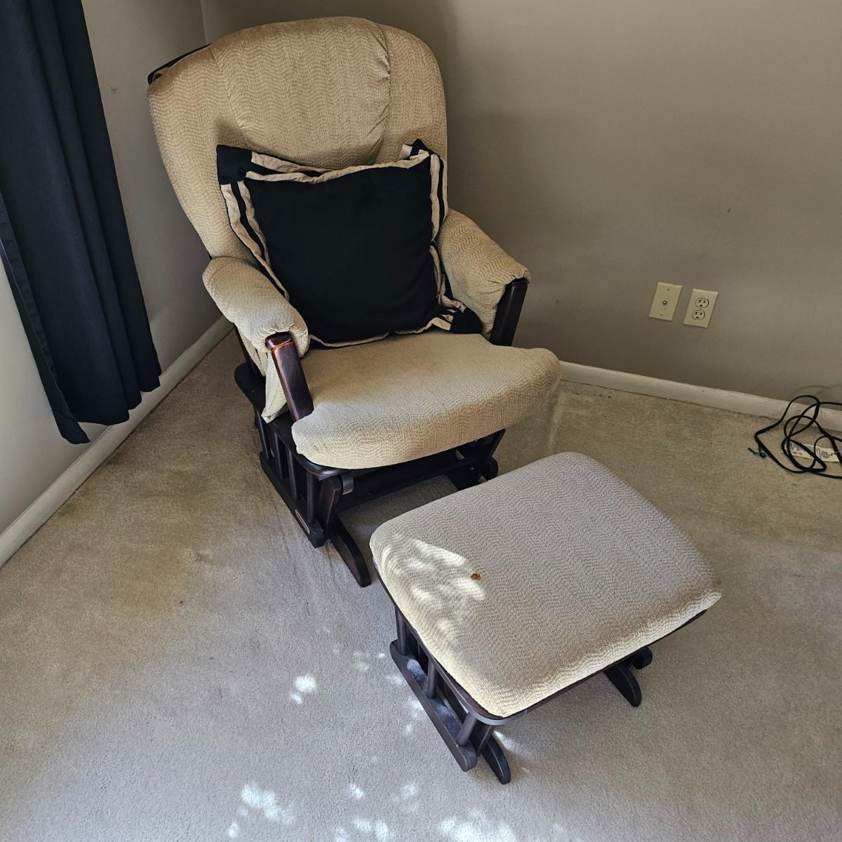 Comfy platform style rocker and ottoman by Shermag of Canada. Tan upholstery and black wood frame and components. Rocker measures 28" x 32" x 38"H, ottoman is 21.5" x 16.5" x 14.5"H. Also has matching pillow included. Ottoman has burn spot on top. See photos for details.