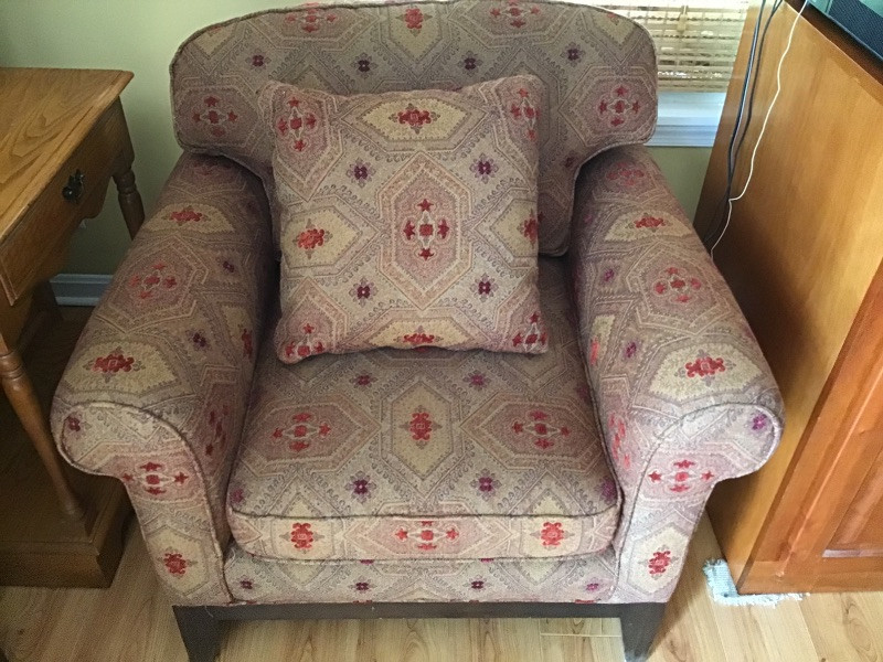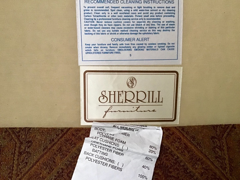 GORGEOUS SHERRILL CUSTOM FABRIC CHAIR. NEVER SAT ON. SOLID WOOD LEGS, 36 W x 34 D.