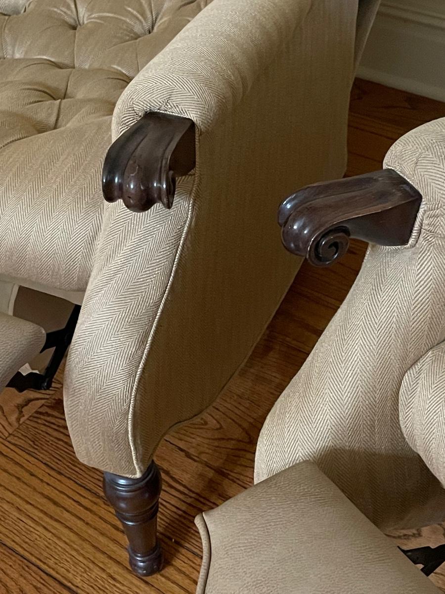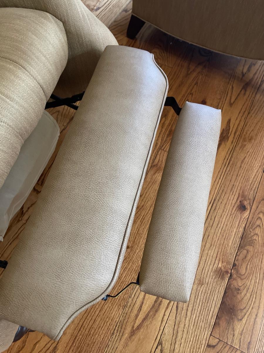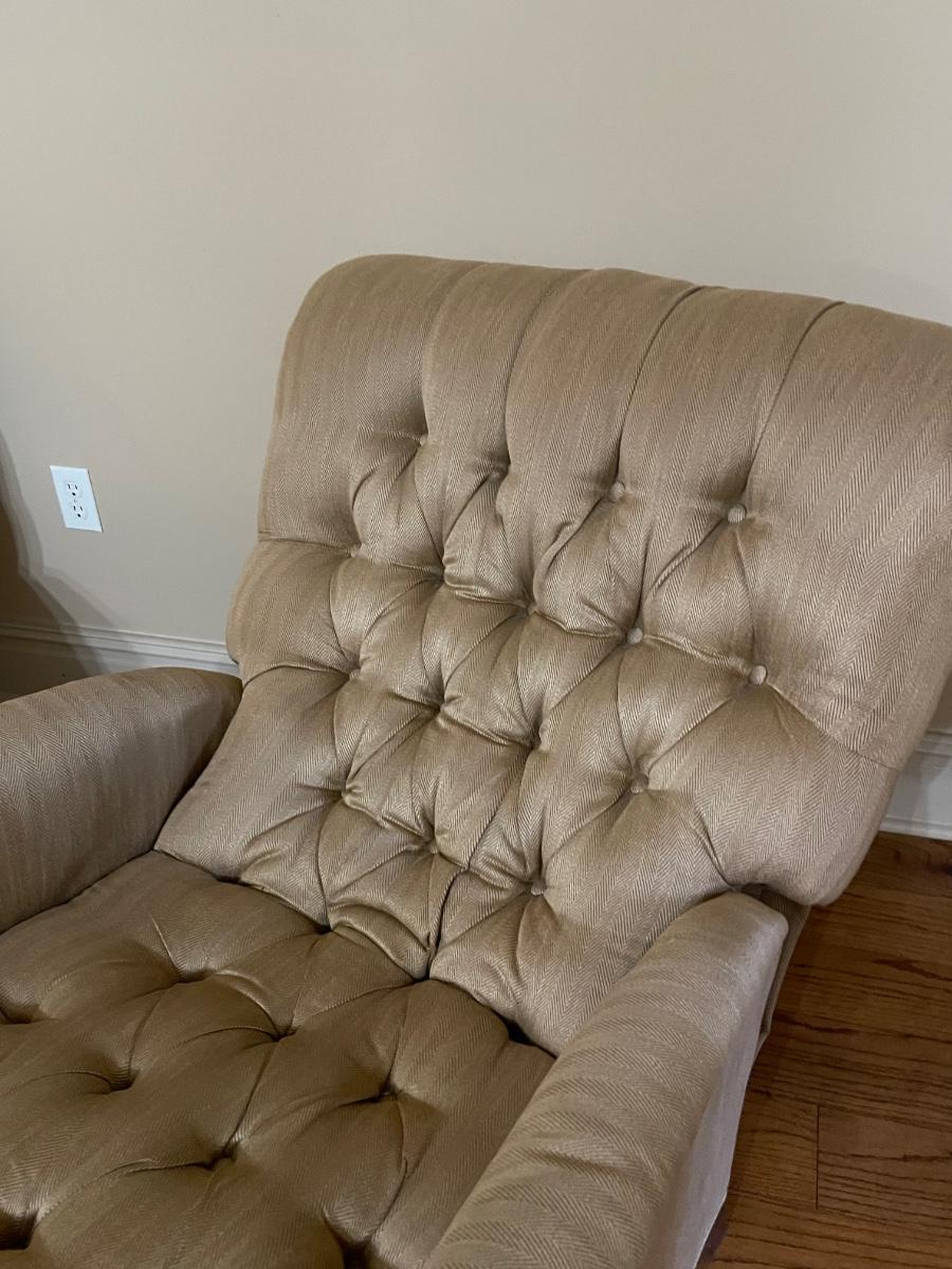 Scotch-guarded ~ Excellent ~ Leather footrest ~ 41” H x 33.5” W x 43” D ~ No Pets, No Smoking ~ Wall Sconces not for sale
