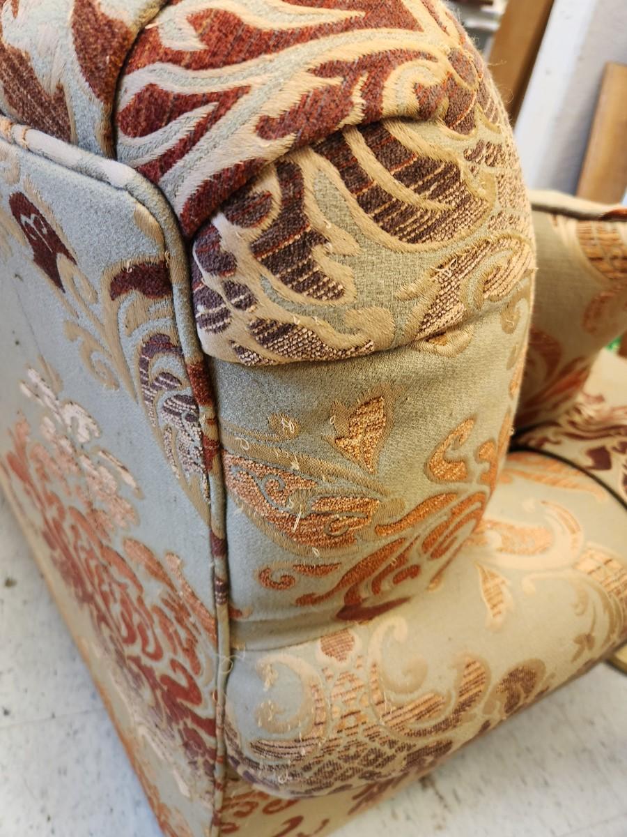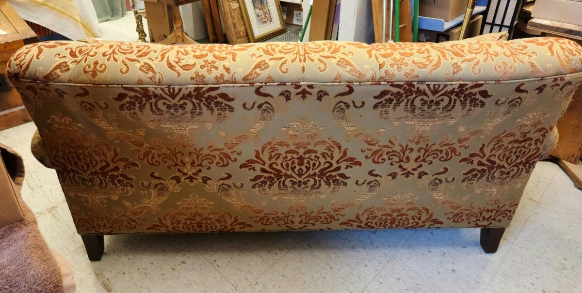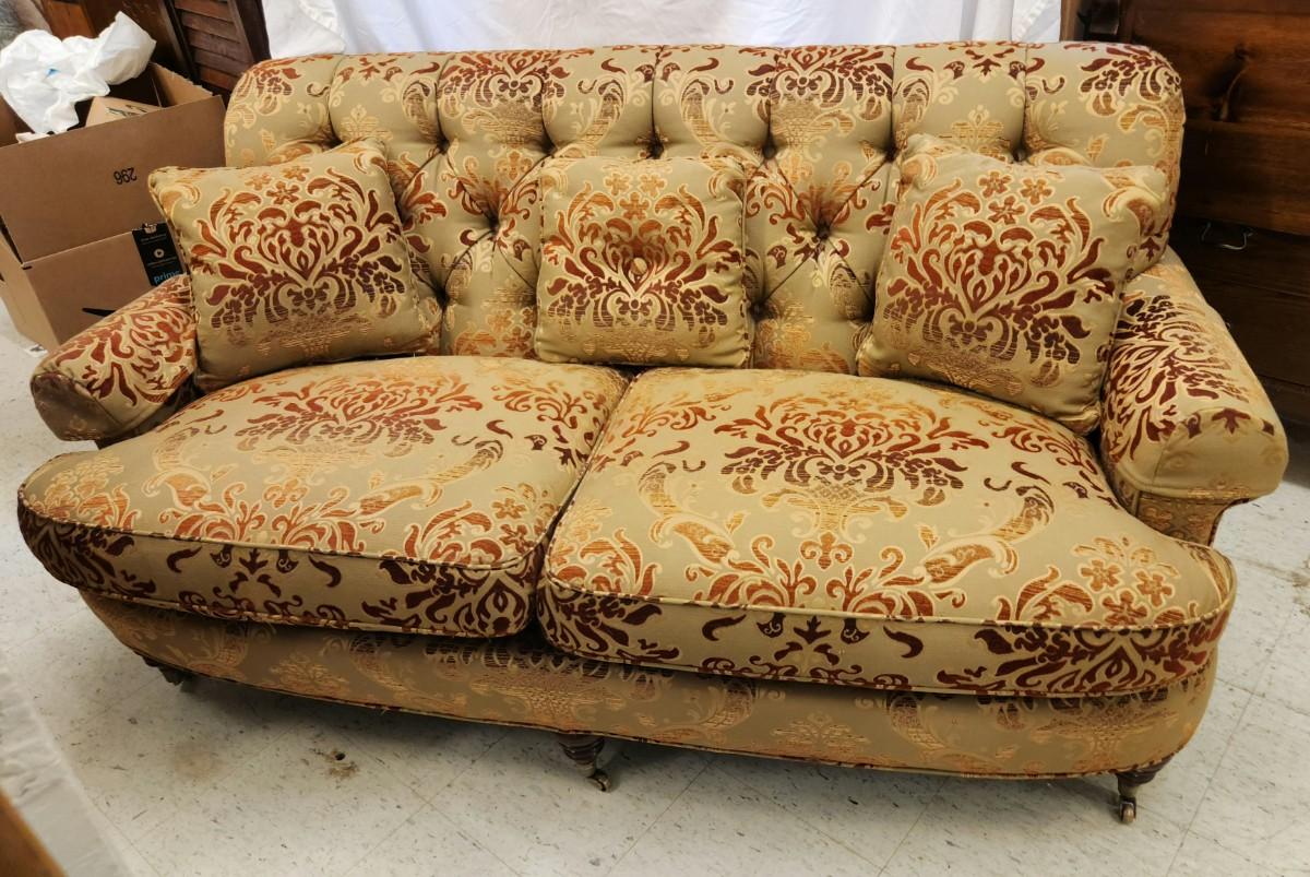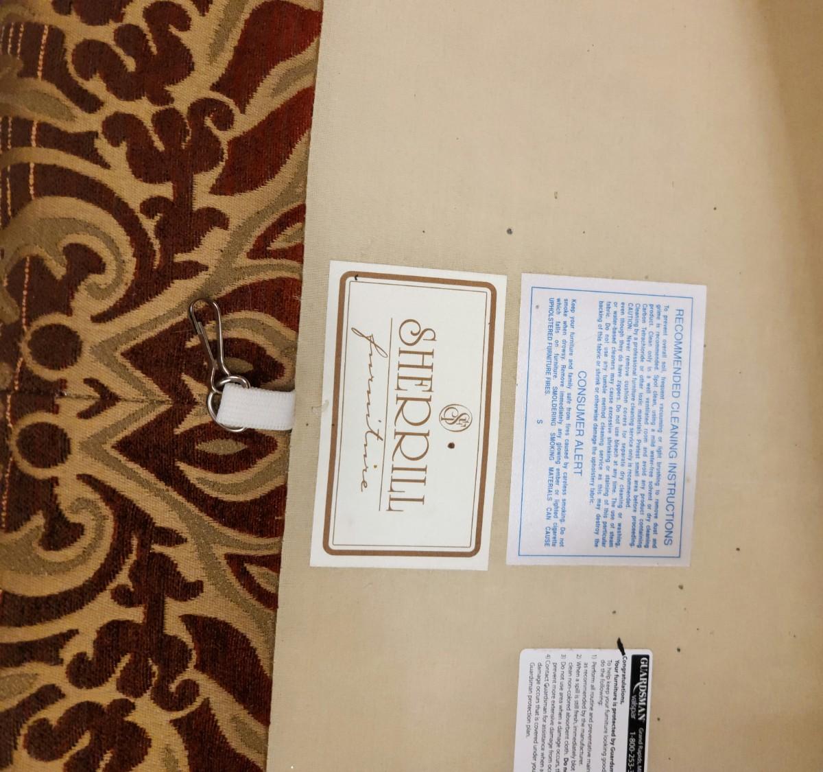 Beautiful lightly used Sherrill sofa. Down filled cushions with clips and 3 matched pillows. Front legs have wheels 72"x40"x35"