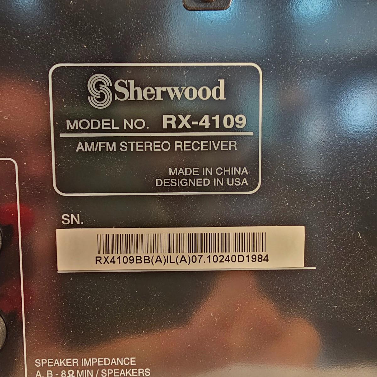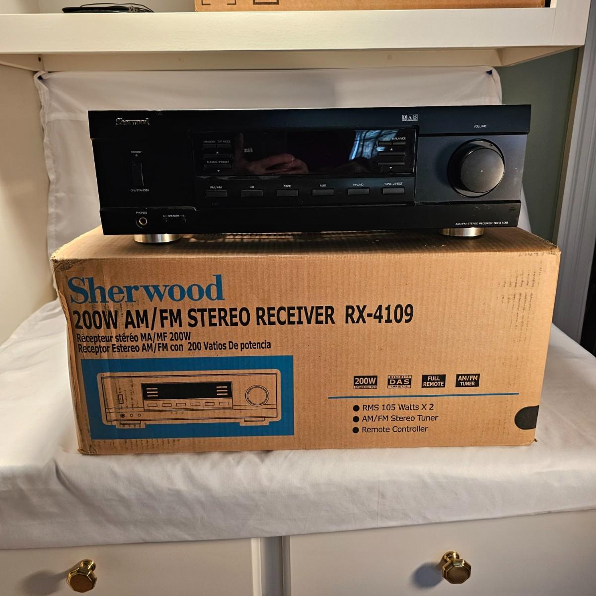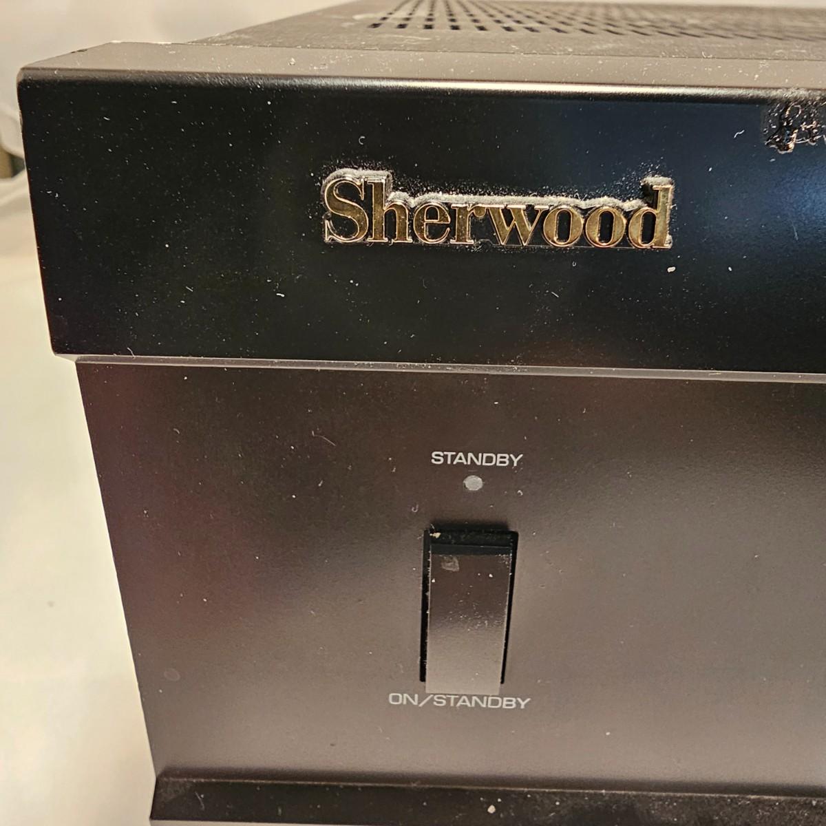 200W Sherwood stereo receiver. AM/FM, CD, Tape, Phono, Aux inputs. Will handle two sets of speakers. Includes two antennas and original box. Measures 13" x 17.5" x 5.5"H. Unit powered on when plugged in. See photos for details. Shipping available.