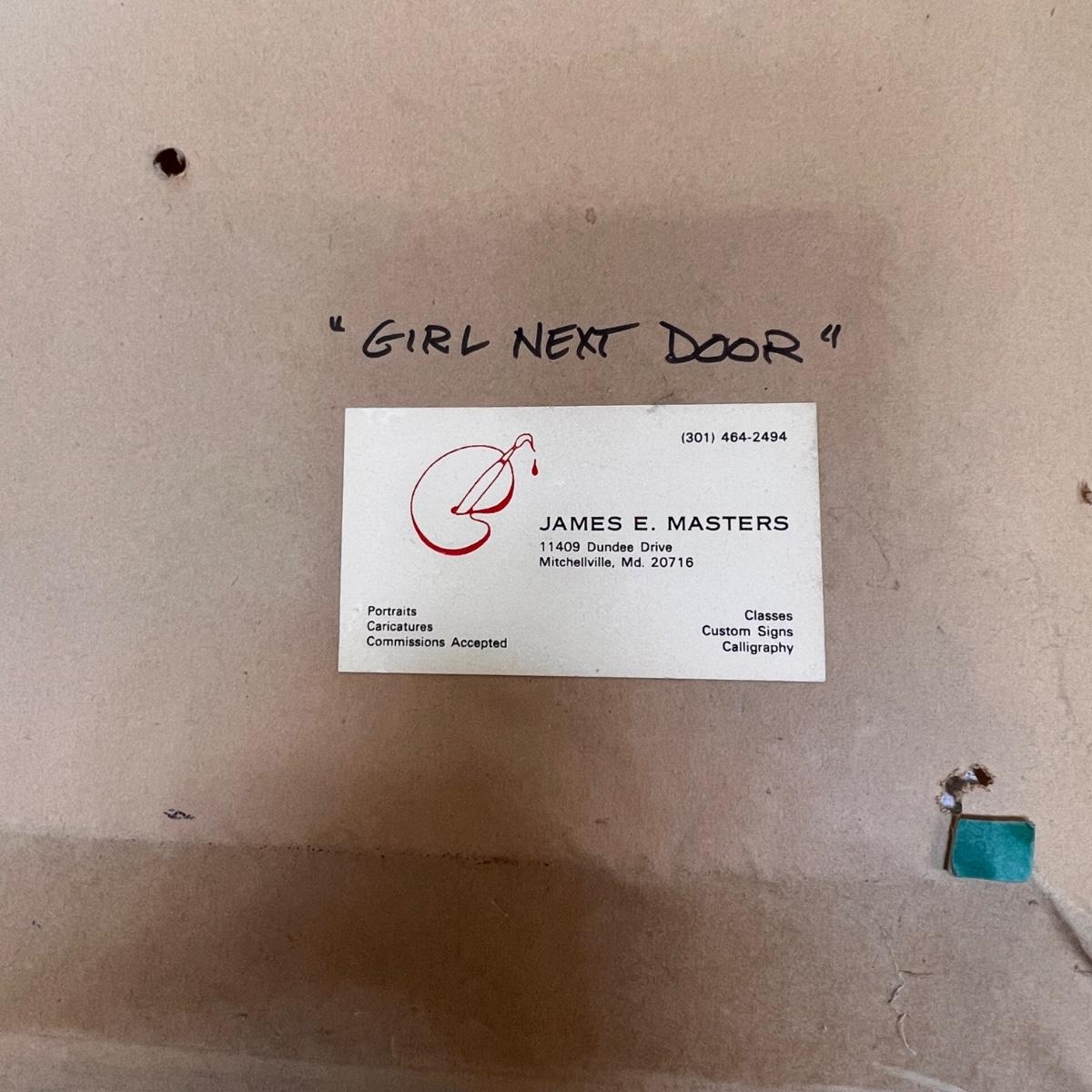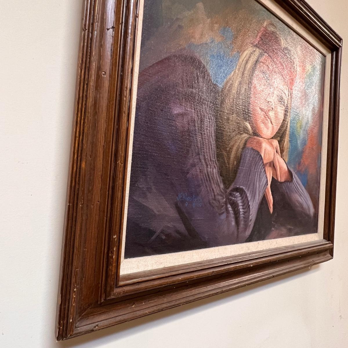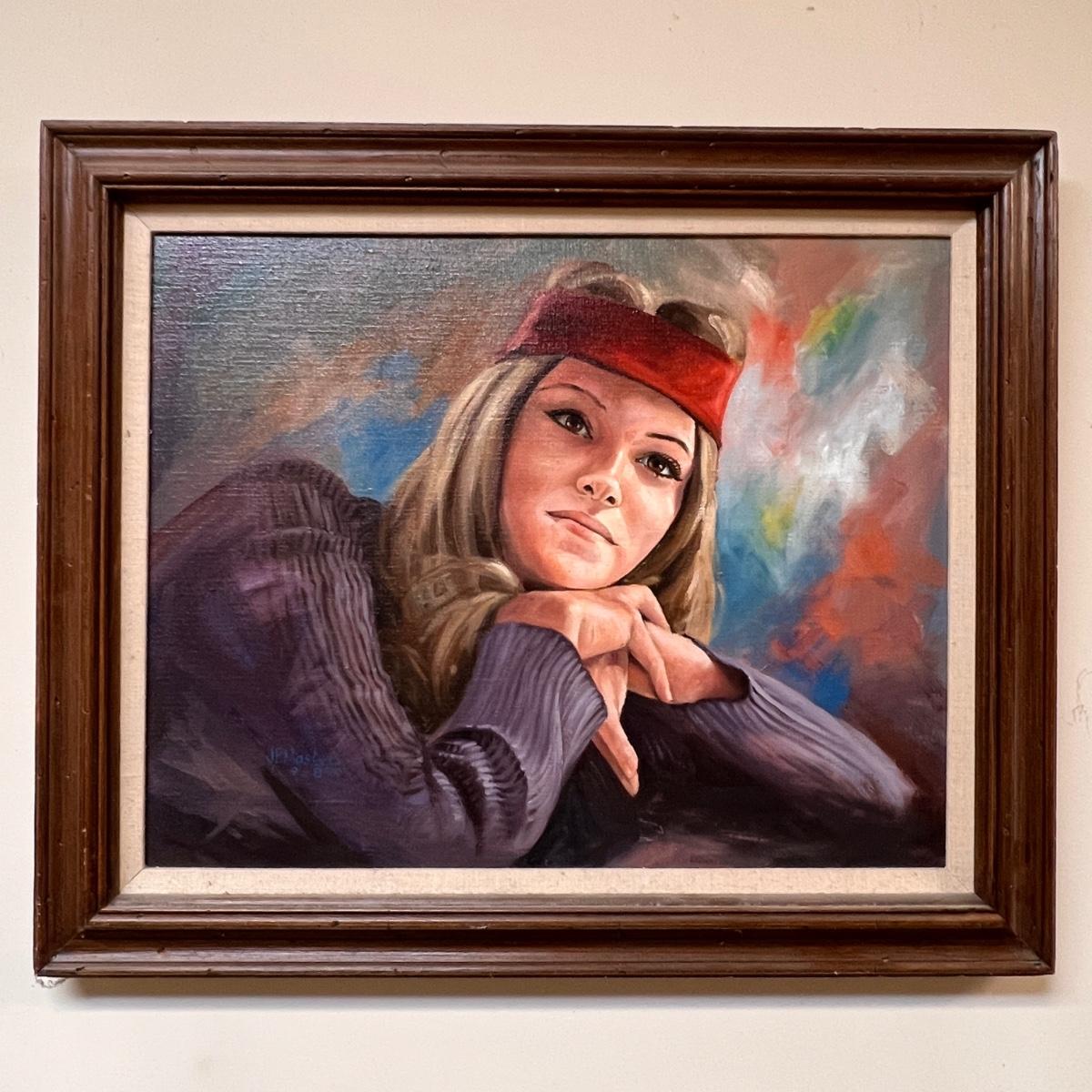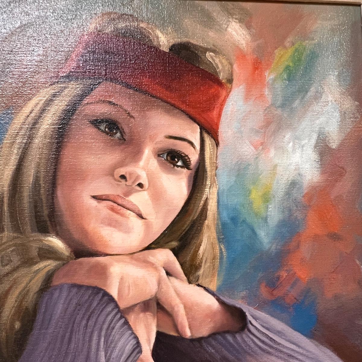Professionally framed with linen liner matting portrait oil painting entitled "Girl Next Door". Vibrant colors and a wooden frame.