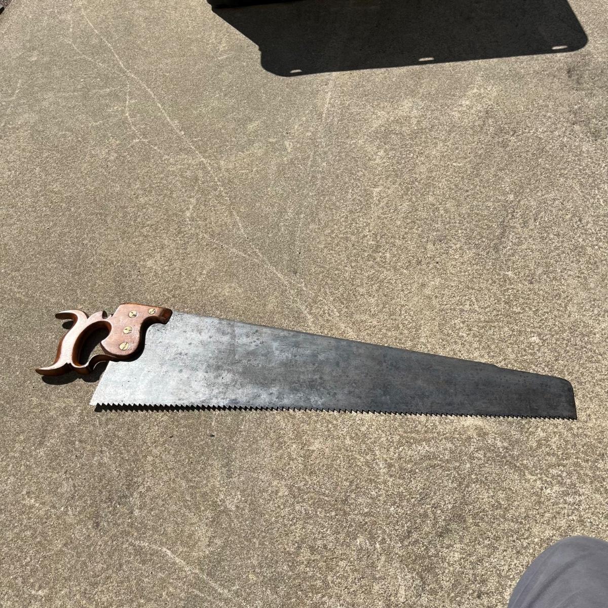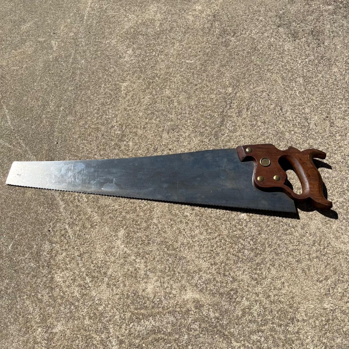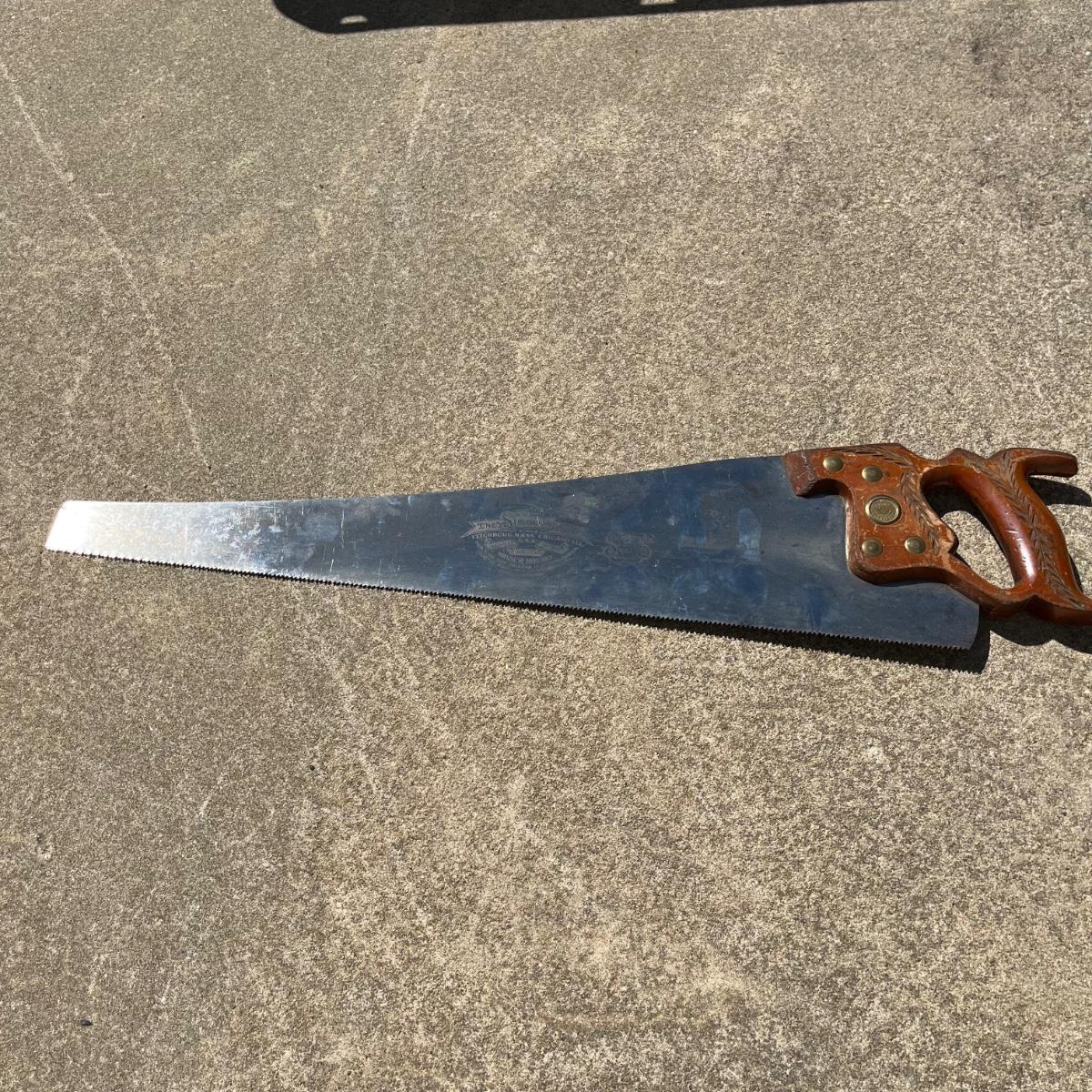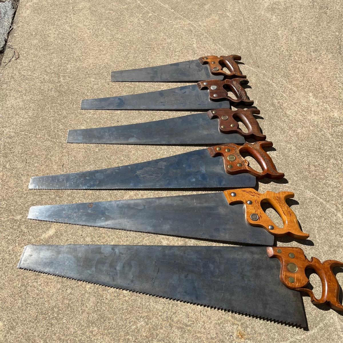 Lot includes a Shields and Miller 28” blade saw, Simonds 26” blade saw, Craftsman 26” blade saw and three Disston saw with blades of 16”, 20” and 22”