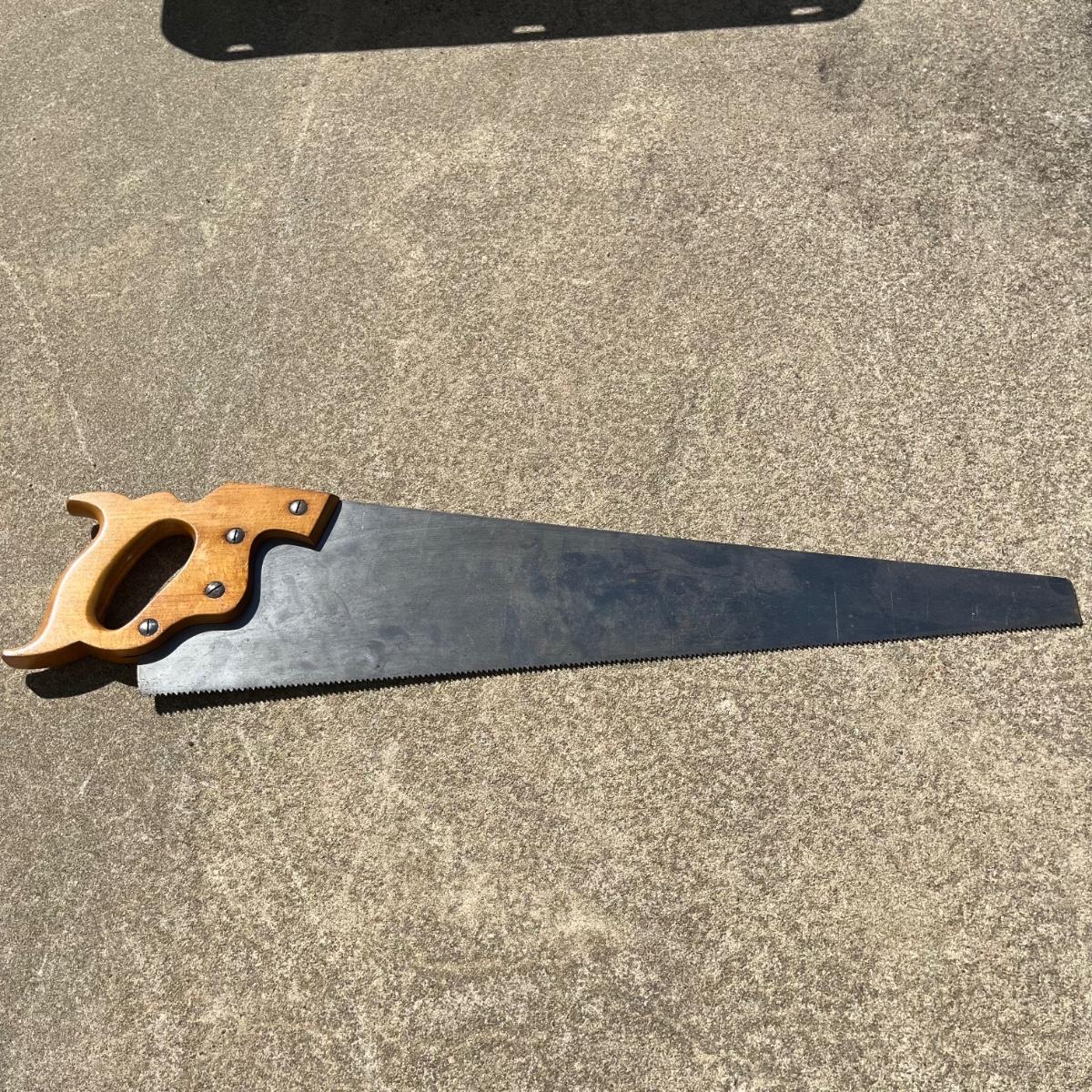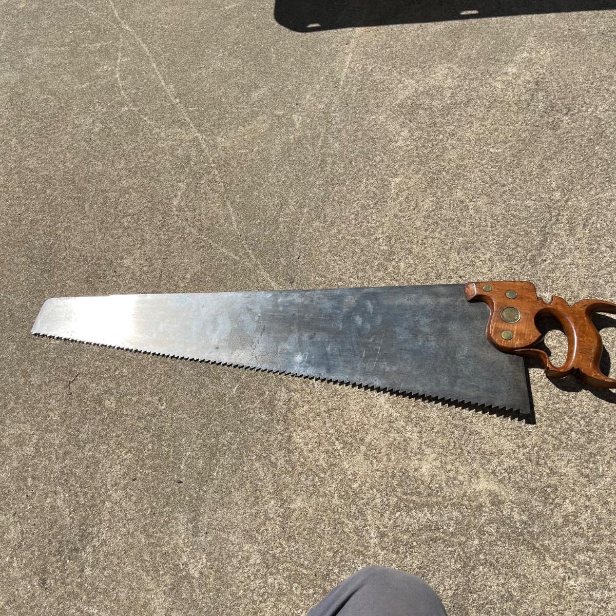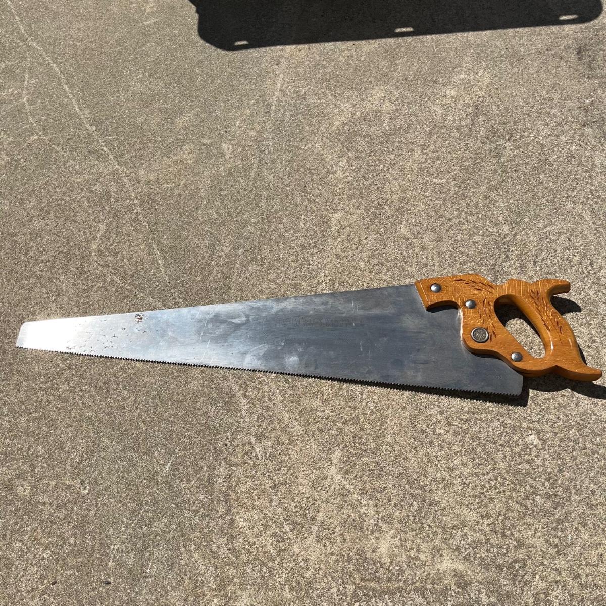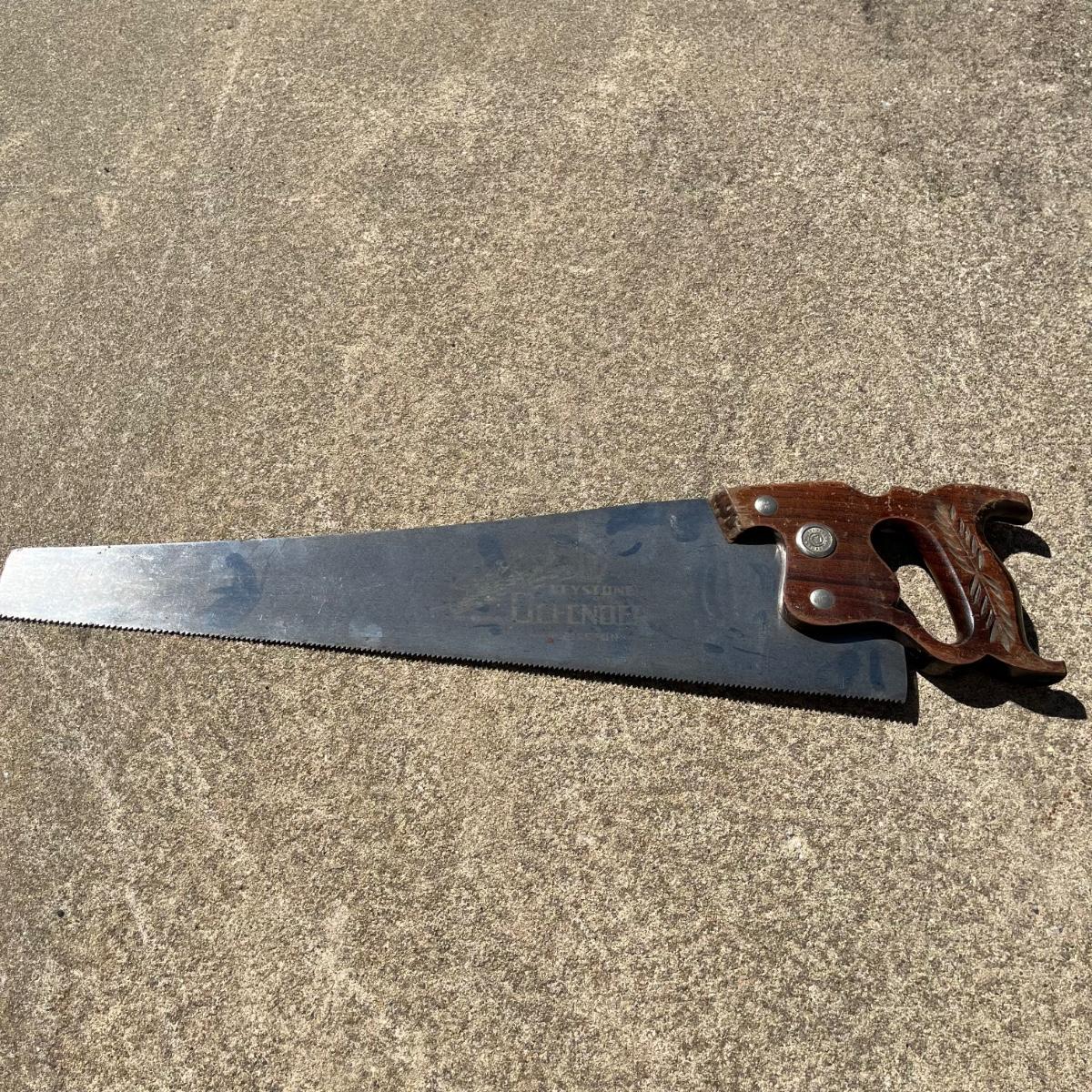 Lot includes a Shields and Miller 28” blade saw, Simonds 26” blade saw, Craftsman 26” blade saw and three Disston saw with blades of 16”, 20” and 22”