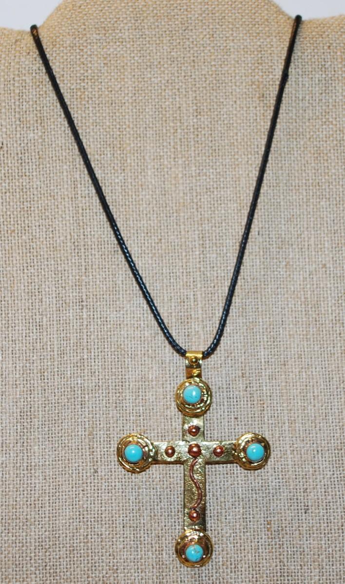 Shiny Gold Tone Cross PENDANT (3" x 2¼") with 4 Jade Style Globes on a Black Rope Necklace Chain 18"