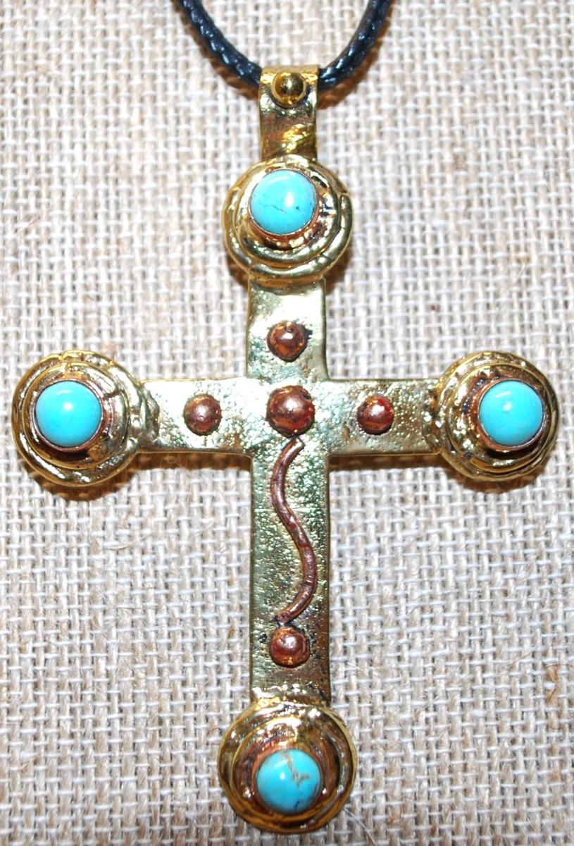 Shiny Gold Tone Cross PENDANT (3" x 2¼") with 4 Jade Style Globes on a Black Rope Necklace Chain 18"