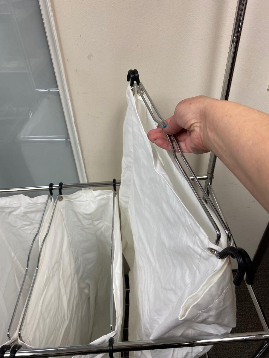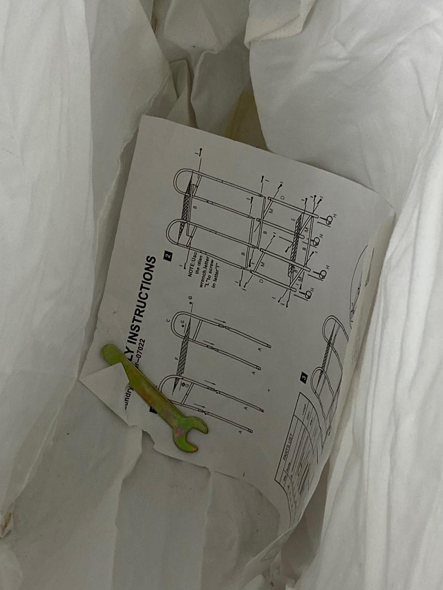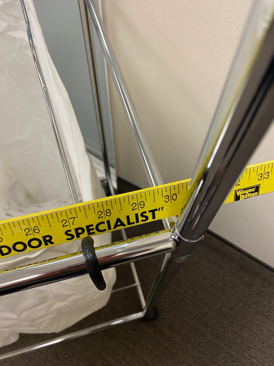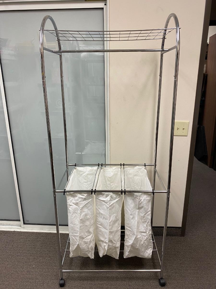 Metal laundry sorter drying rack on wheels. Has 3 removeable laundry bags, high shelf and a clothes rod. Comes with instruction manual and small tools to tighten or take apart. About 6' tall and 30" wide. 20" deep. One laundry bag has a stain in bottom, bags can be washed. On wheels, may be able to remove wheels if needed.