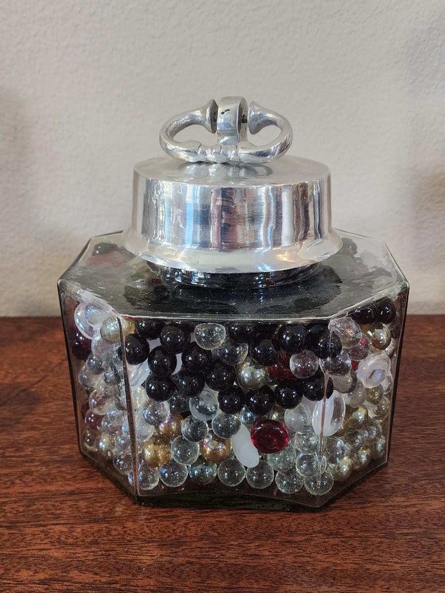 7" x 6.5: jar with pewter lid, full of marbles.