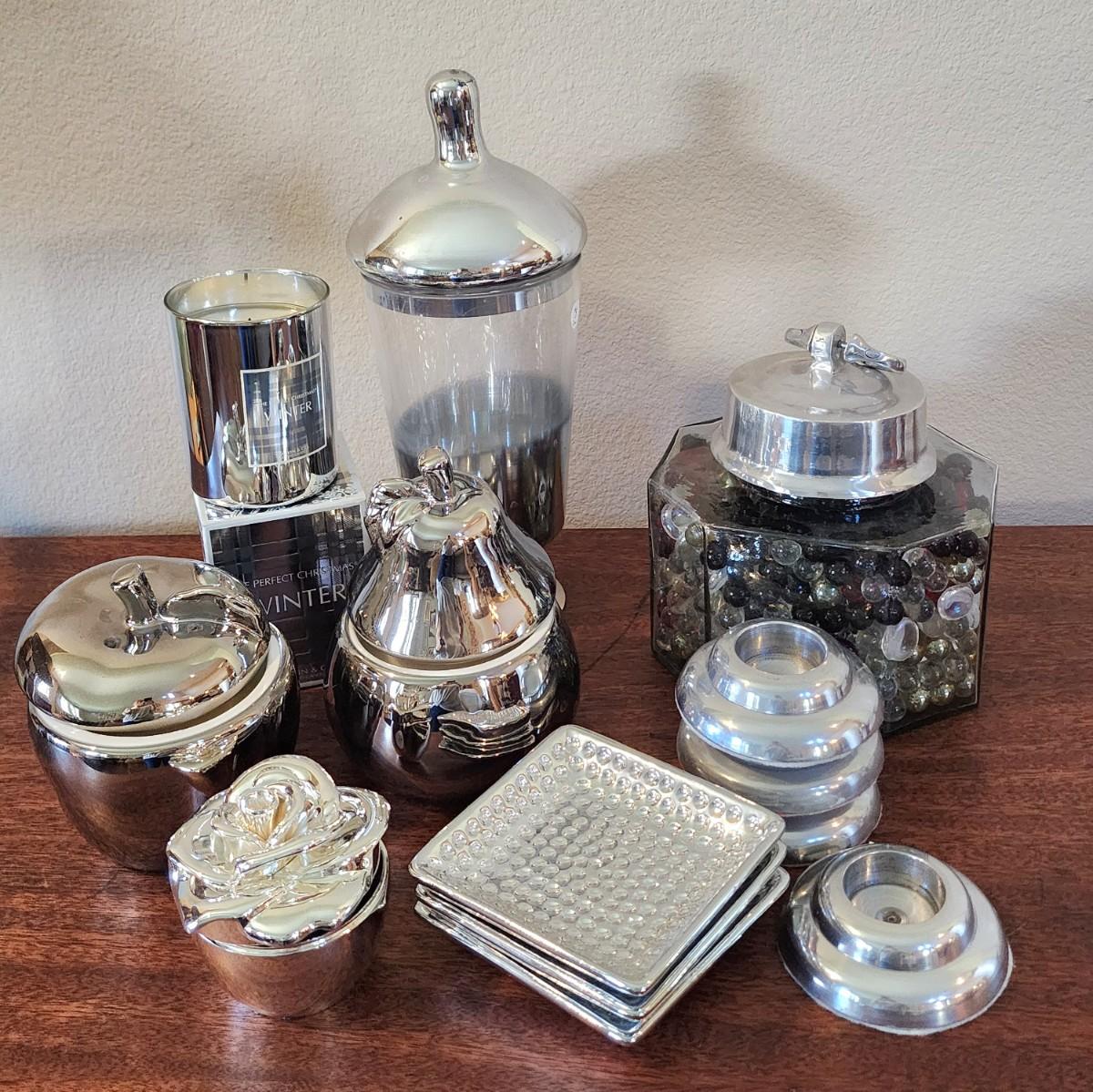 Shiny Silver Lot- 13 pieces - Candles, deco jars, trinket dish & more