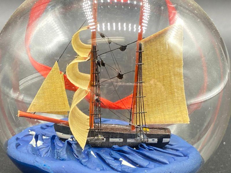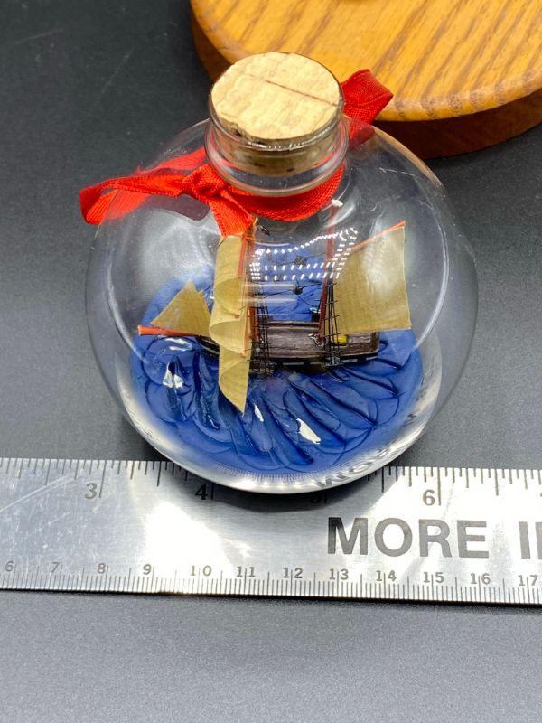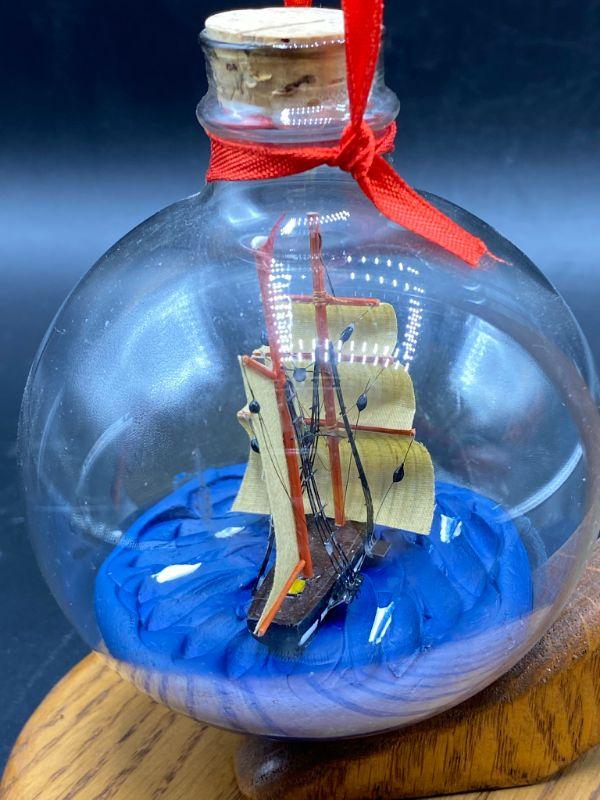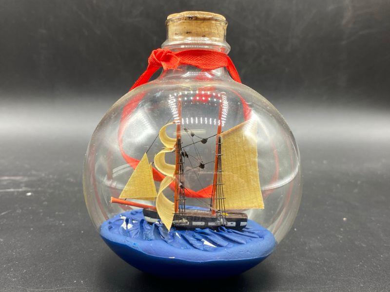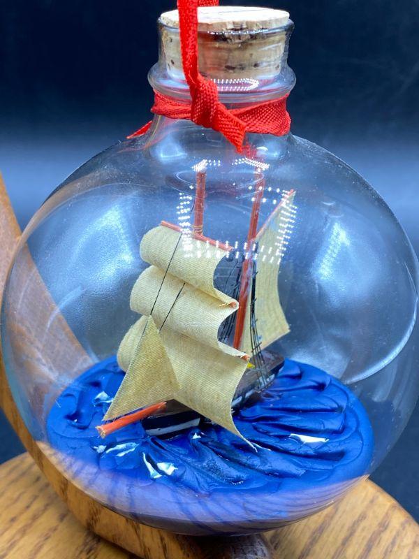 Ship in a Bottle nautical themed Christmas ornament. Has a flat bottom, can easily sit on a shelf. Good condition.