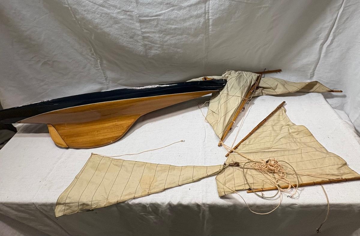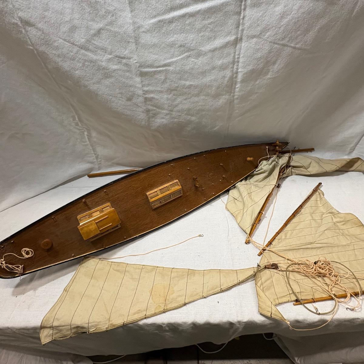 Ship body is 36” x 7.5” x 7.5”H and has wood and metal components. Four fabric sails with metal parts and wooden masts/booms. Longest mast is 33”H. It will need some work getting the sails up.