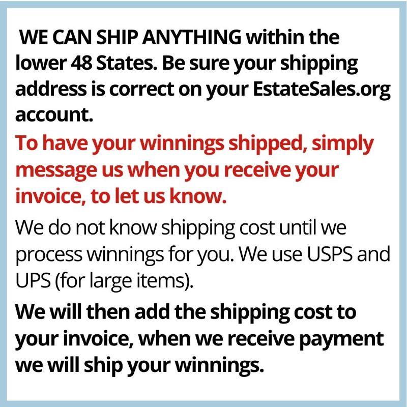 Shipping: We ship throughout lower 48 states. Items are not shipped until the week after the auction. We typically ship items that are under 25 lbs. and approx. 20" in diameter (see the items eligible for shipping in the auction). But anything is shippable if you can cover the cost. We keep the costs as low as possible. If you request shipping we will add shipping costs to your invoice by the Monday following the auction.