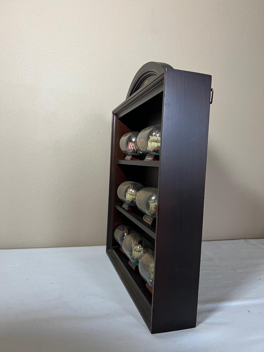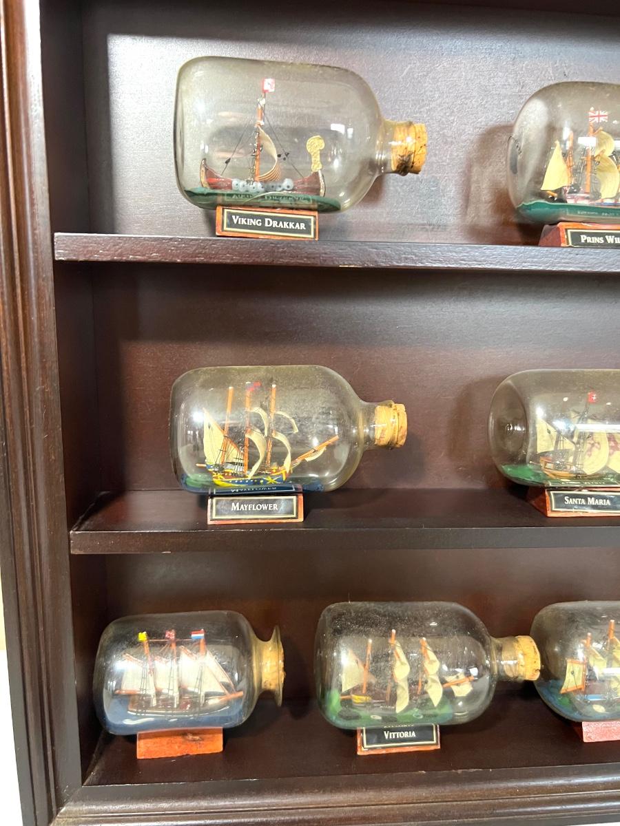 Wooden display Set Ships of Discovery with 7 ships in a bottle VIKING DRAKKAR, PRINS WILLEM, MAYFLOWER, SANTA MARIA, VICTORIA, 2 additional ships. Display measures 15 inches tall 12 inches wide 3 inches deep. Ships in a bottle measures approximately 3 1/2 inches long.