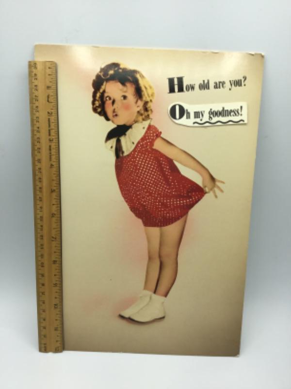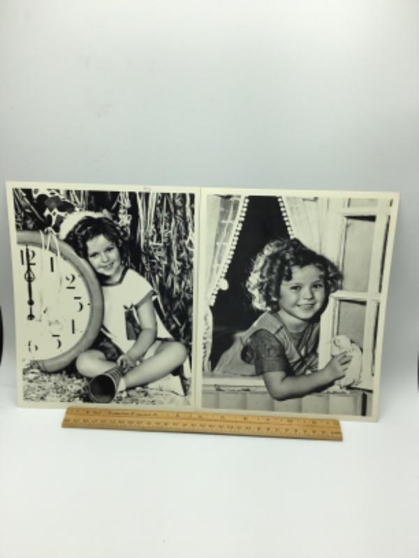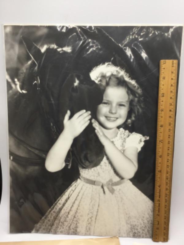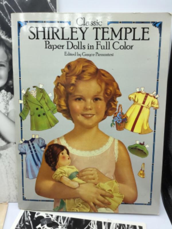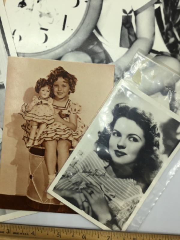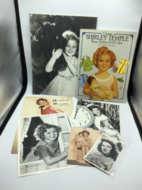 Seven (7) piece lot for the Shirley Temple lover. Lot includes 11” x 14” card stock picture with horse, Two (2) 8” x 10” studio pics, two postcards, a birthday card and a Paper Doll book.