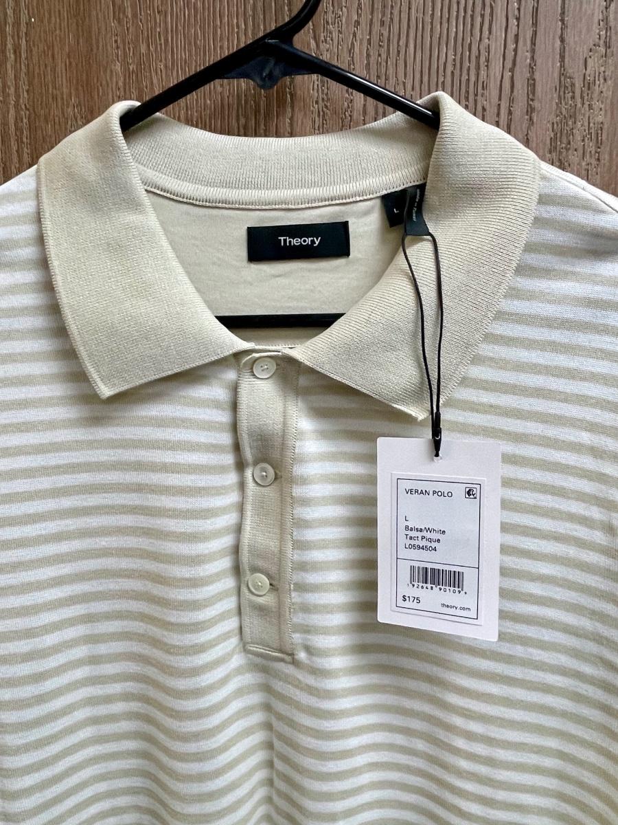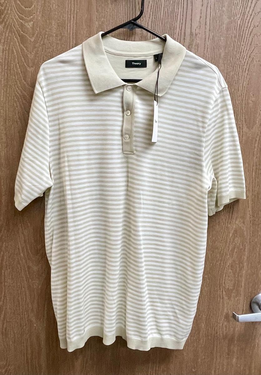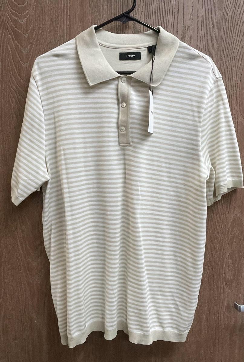 New with Tag Theory Tan and White striped Polo Shirt men's size L