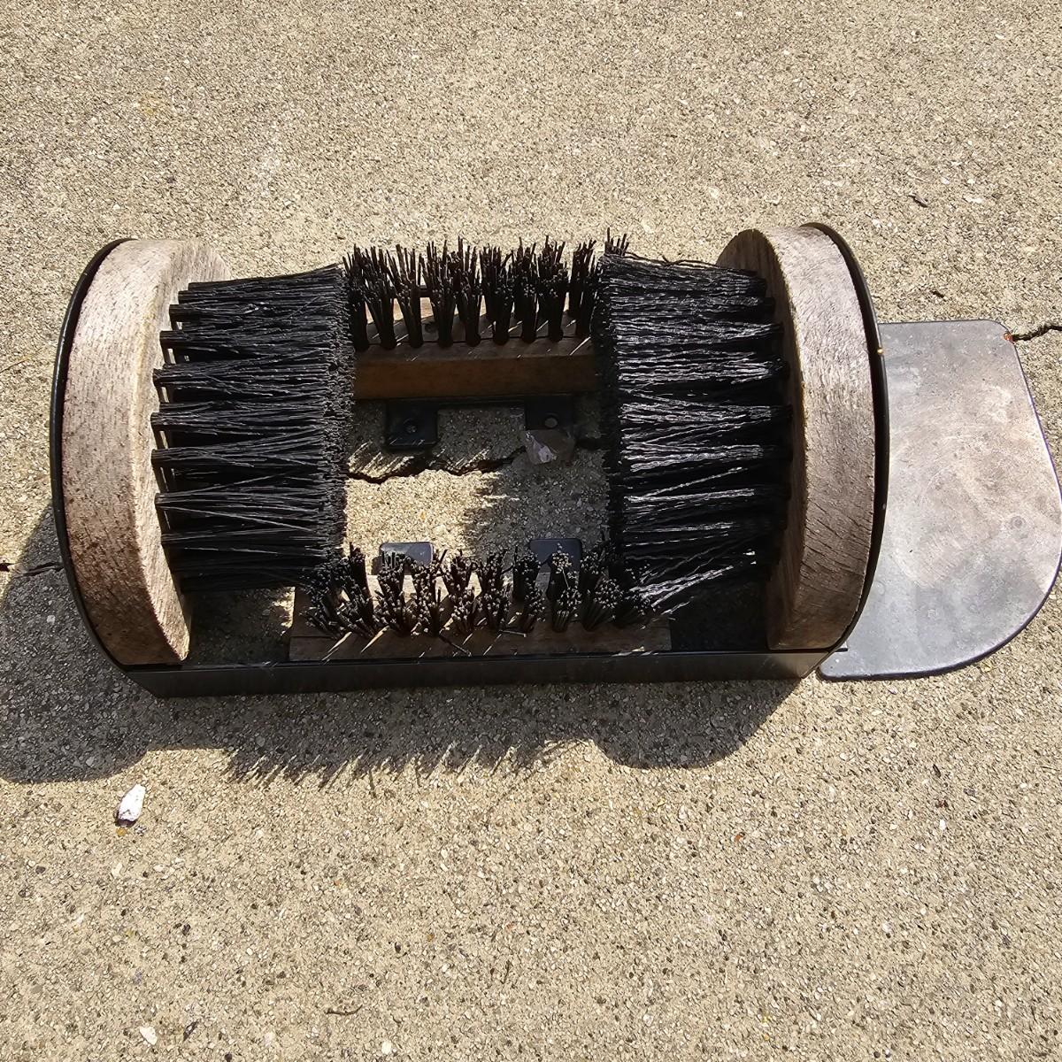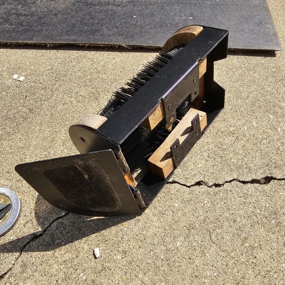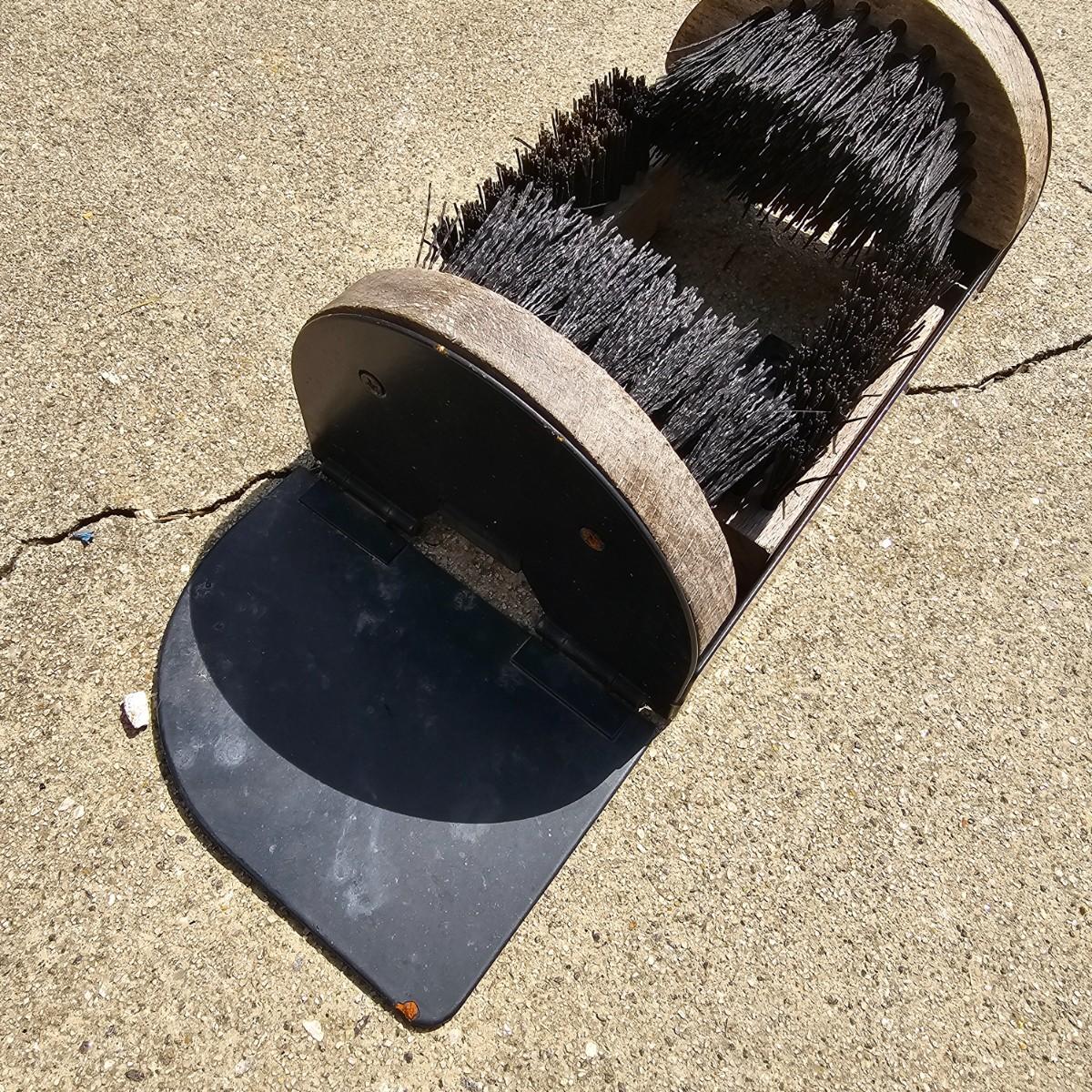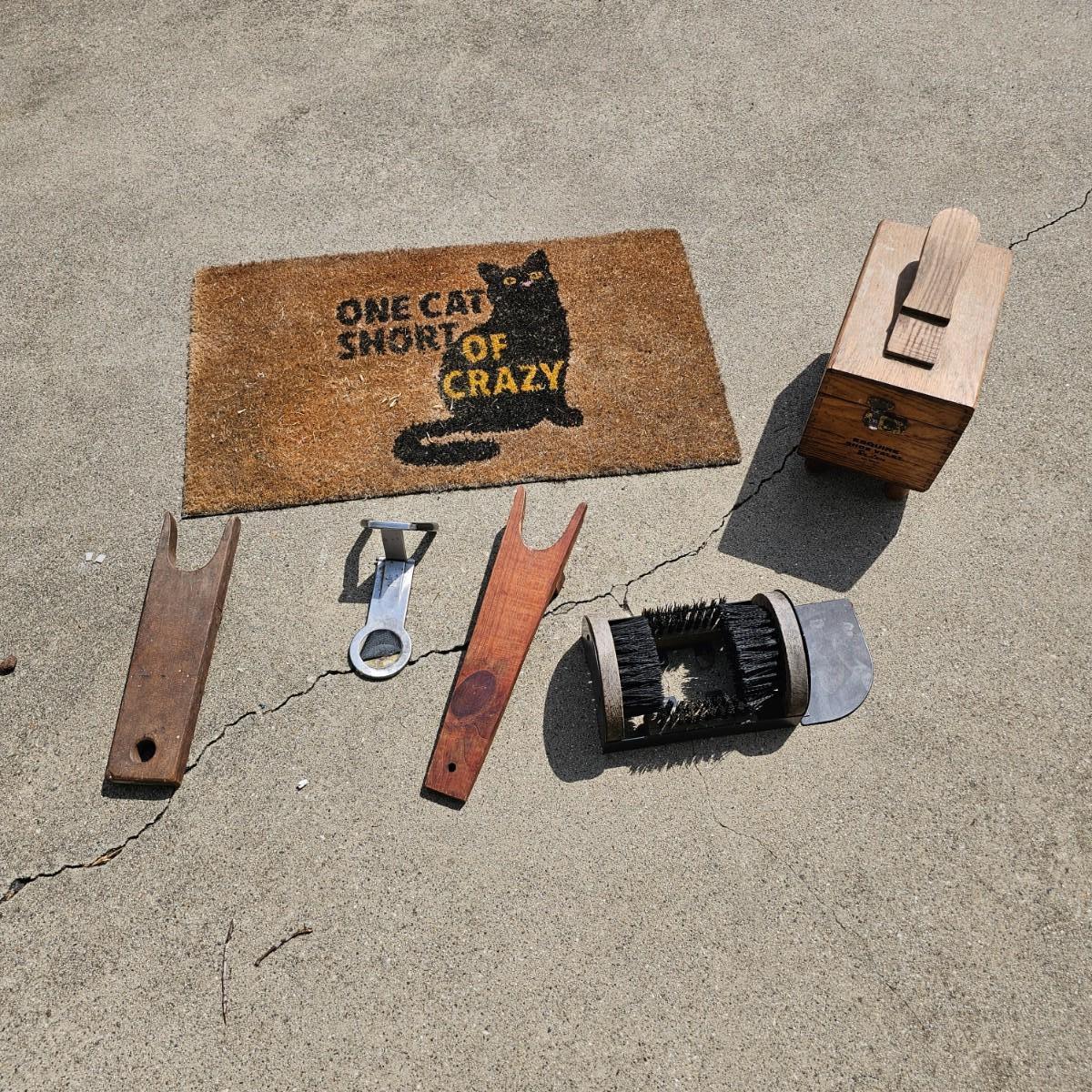 Lot includes a wooden shoe shine box, a door mat, some boot jacks and an outdoor boot scraping brush to help keep you shoes and boots in order. Cat door mat measures 18" x 30". Shoeshine box is 7" x 11" x 11"H, has no polish or brushes. Three boot jacks, two wooden handmade and a metal piece. One scrubber to remove mud/dirt from soles and sides. See photos for details. Shipping available.
