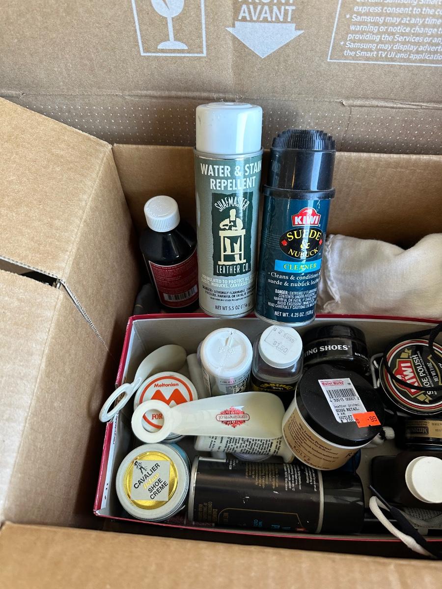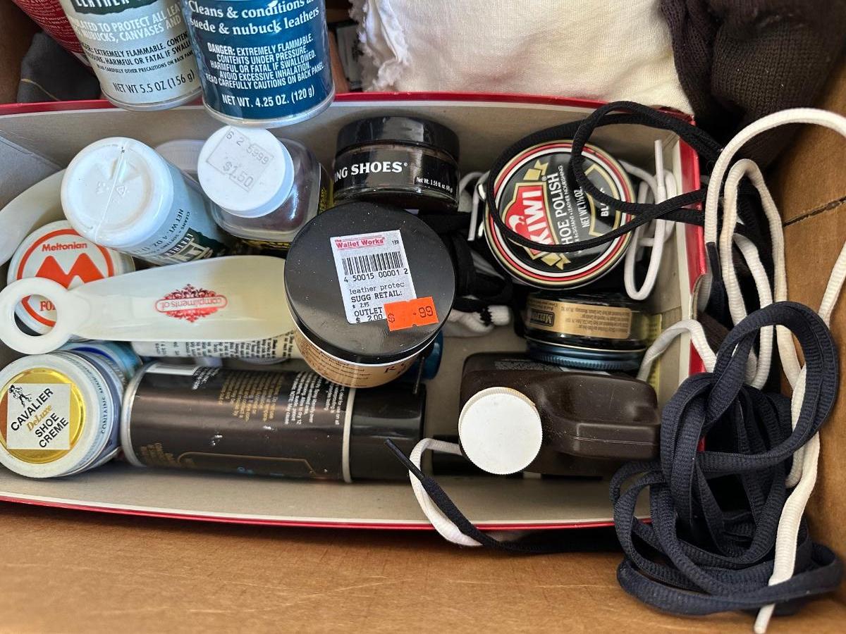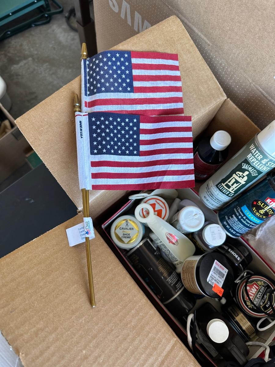 Box of shoe cleaning and polishing supplies and 2 small USA flags.