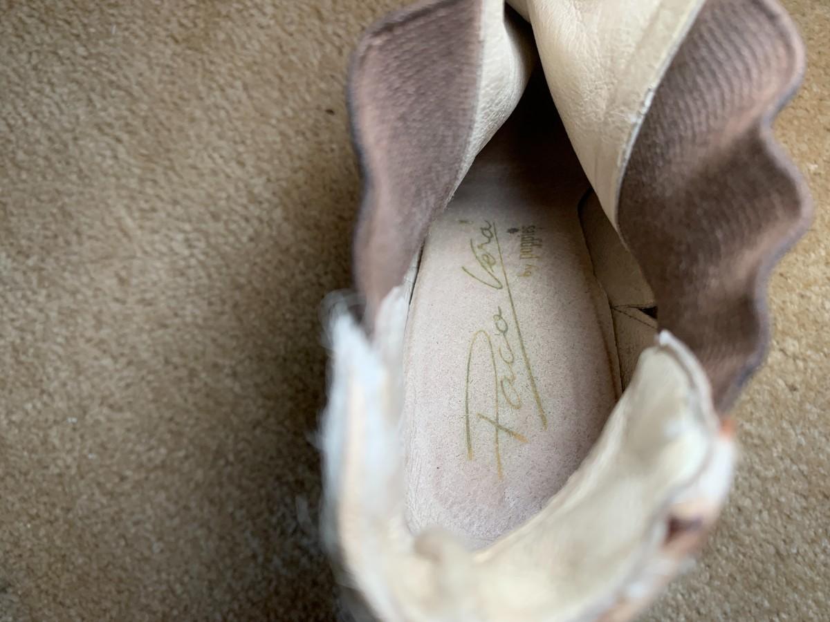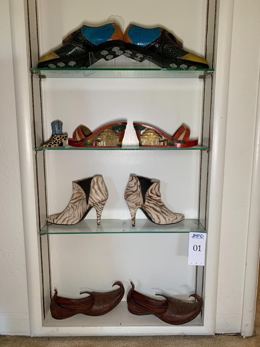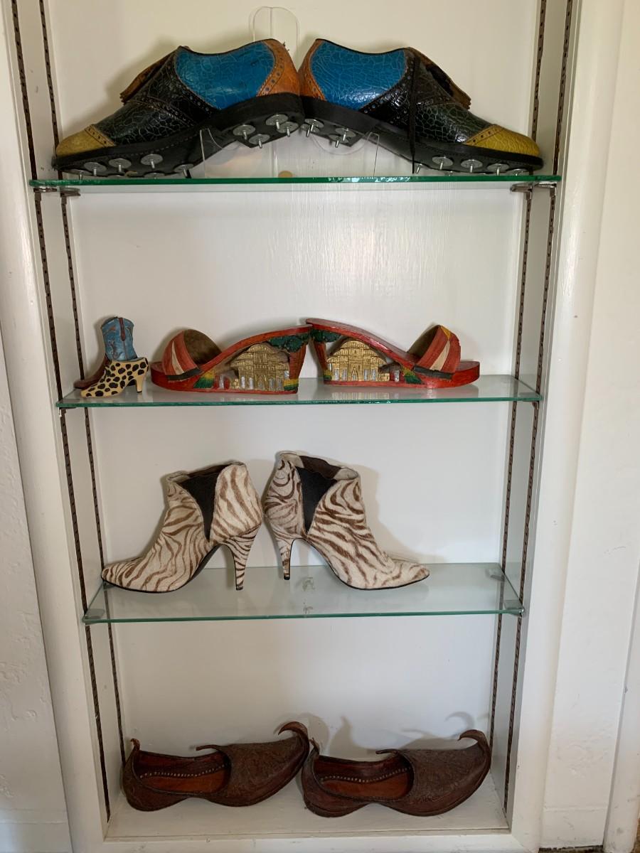 Golf shoes. Arabian curled toe leather. Carved wood and handpainted wedge sandals. 4 pairs plus mini shoe décor.