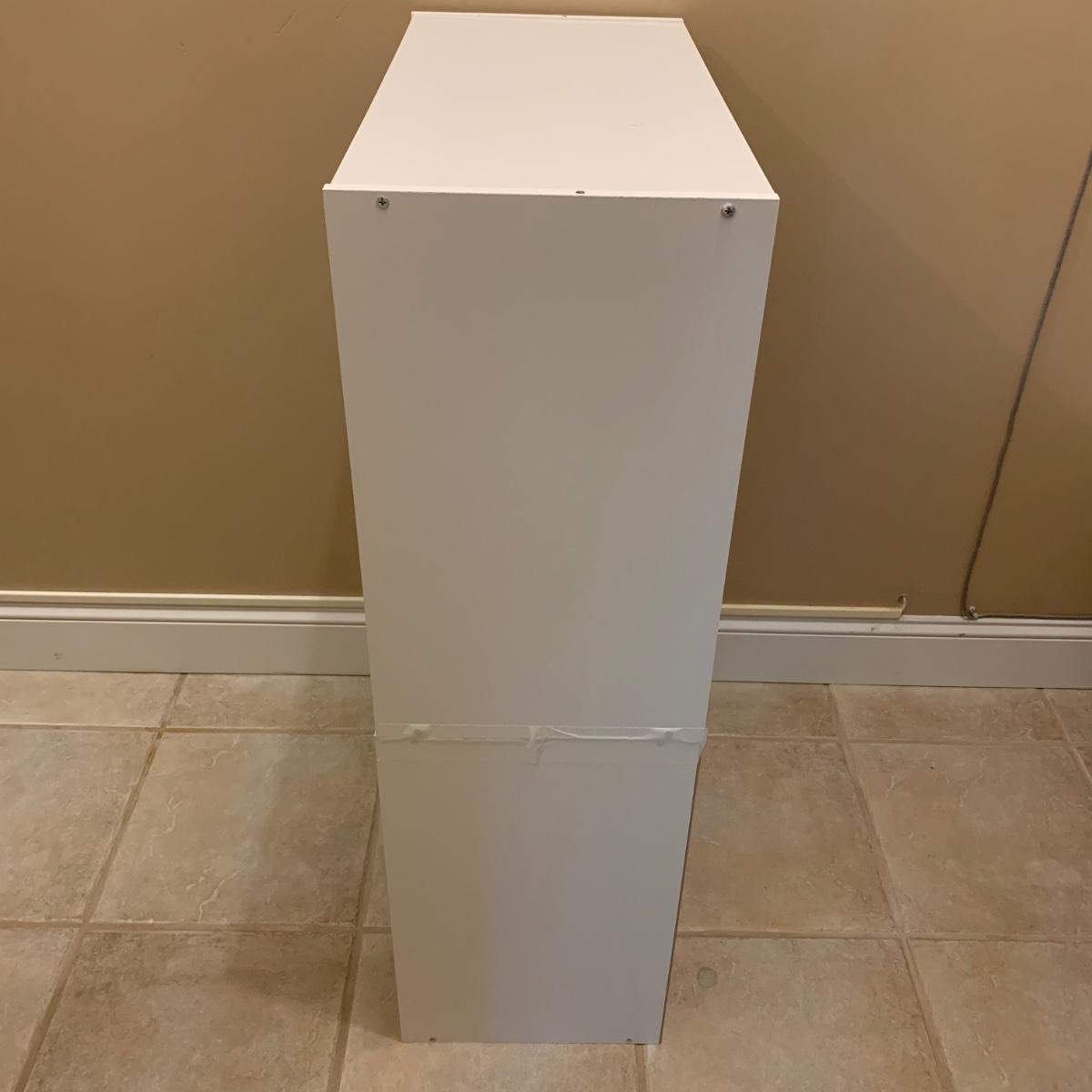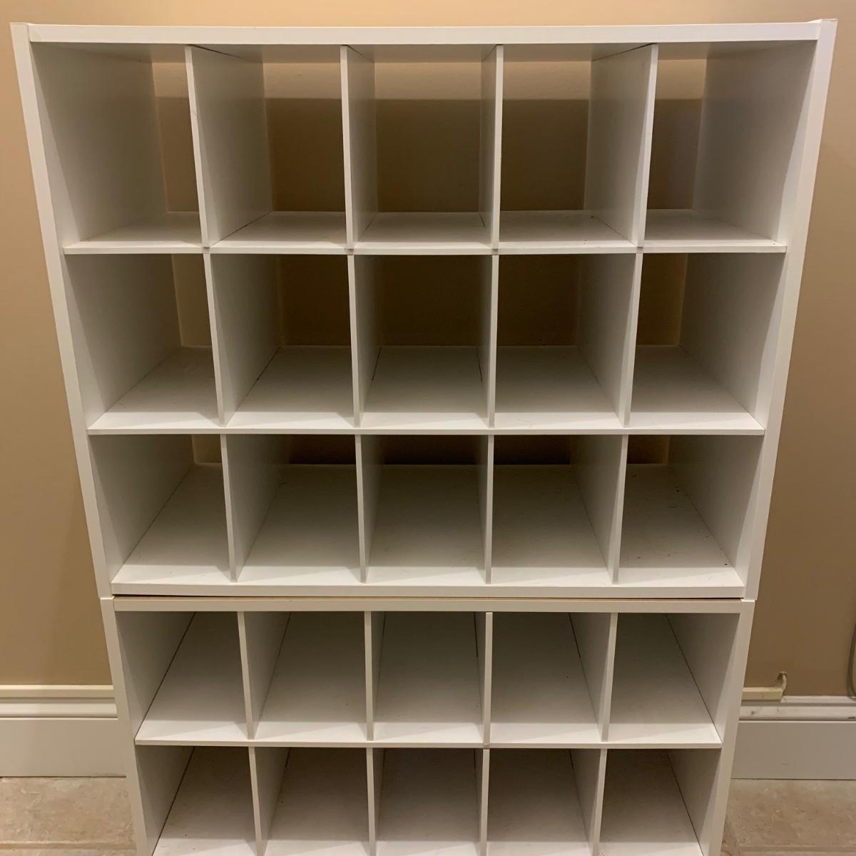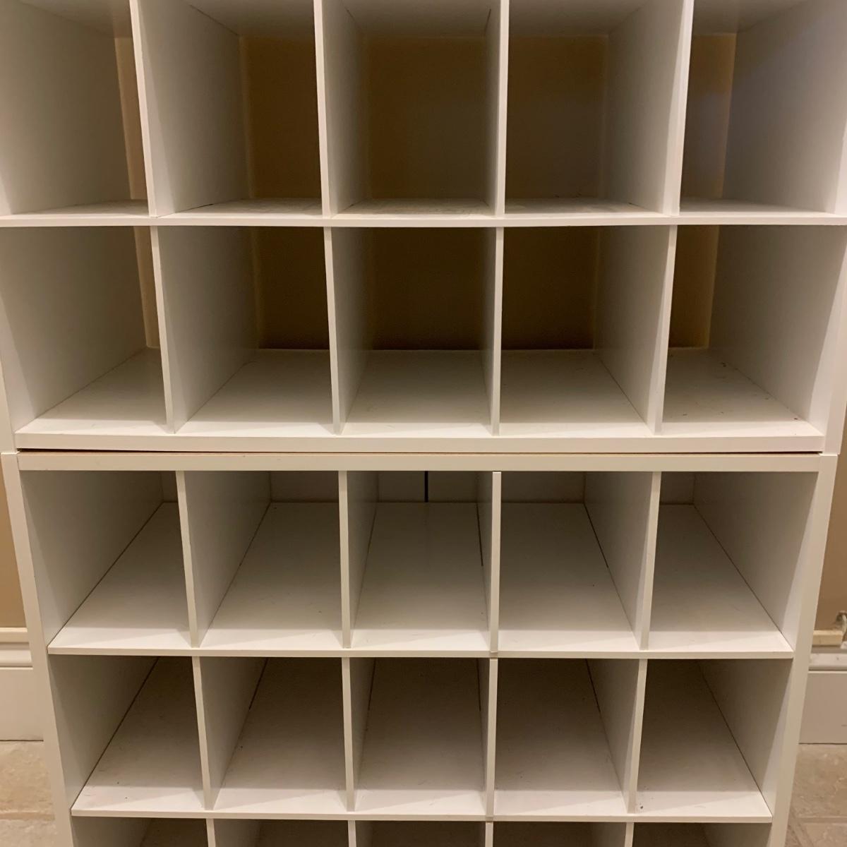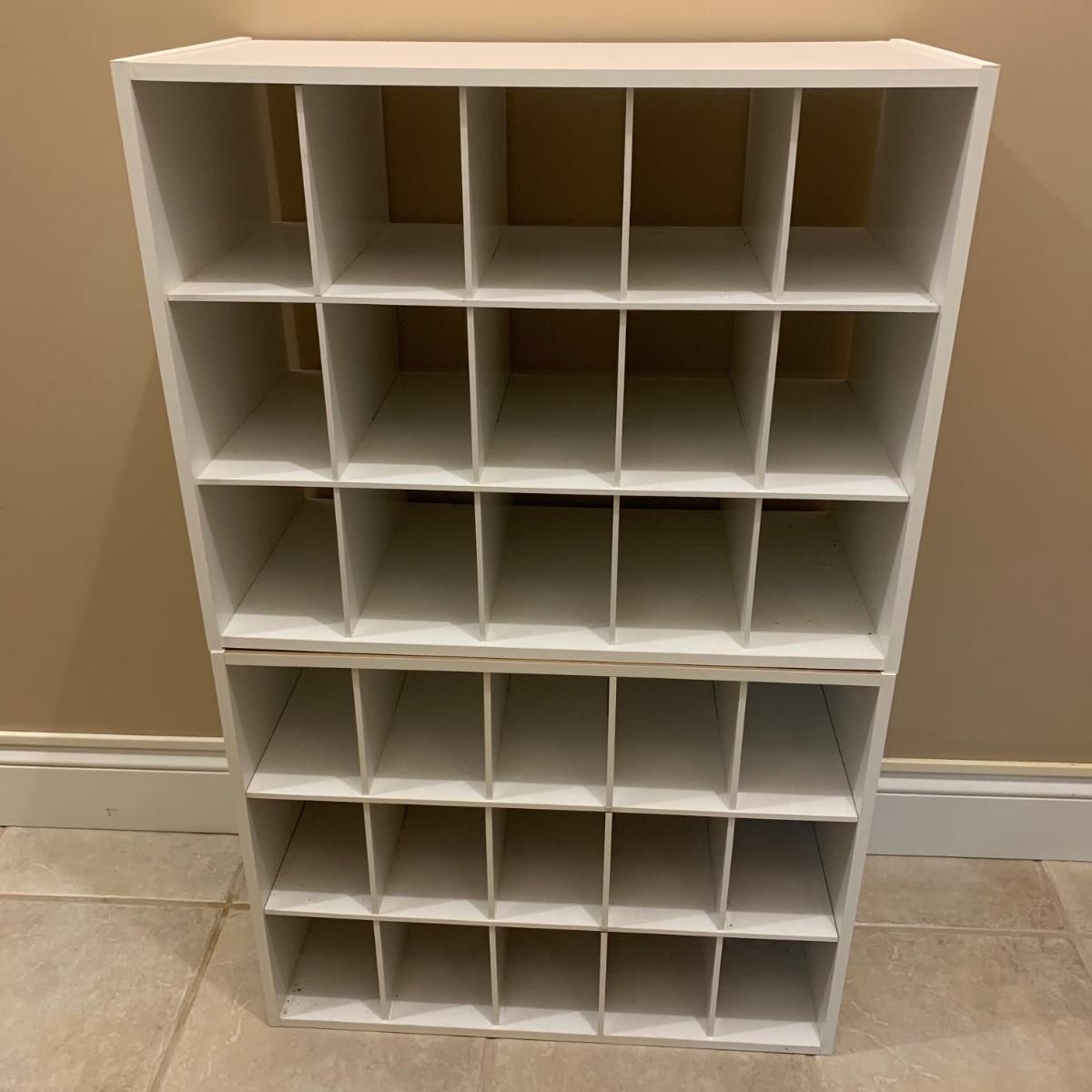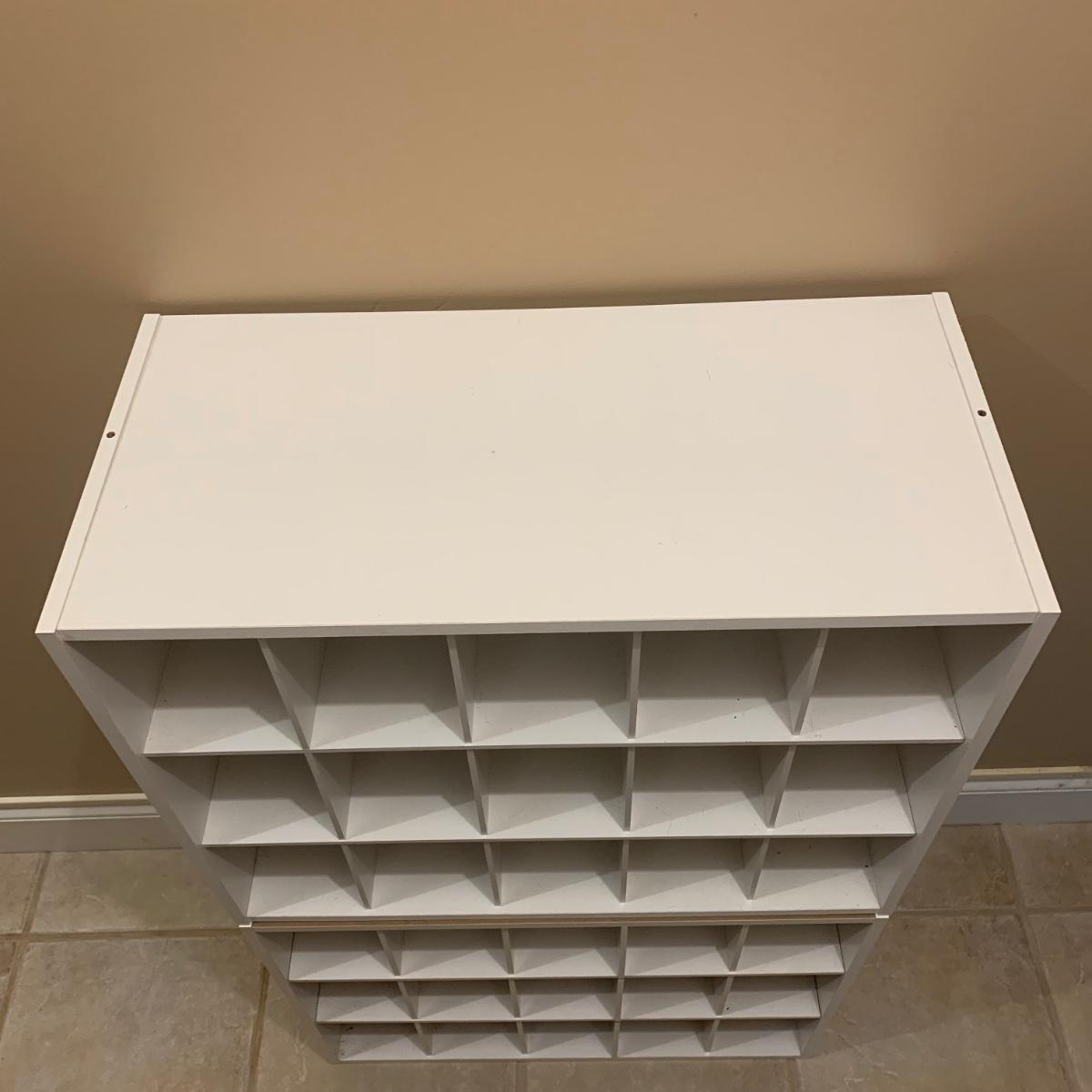 Shoe organizer made of engineered wood with white finish. Appears to be two shoe organizers connected by flex seal tape to create one unit. Item measures 24” x 12” x 38.5”H.