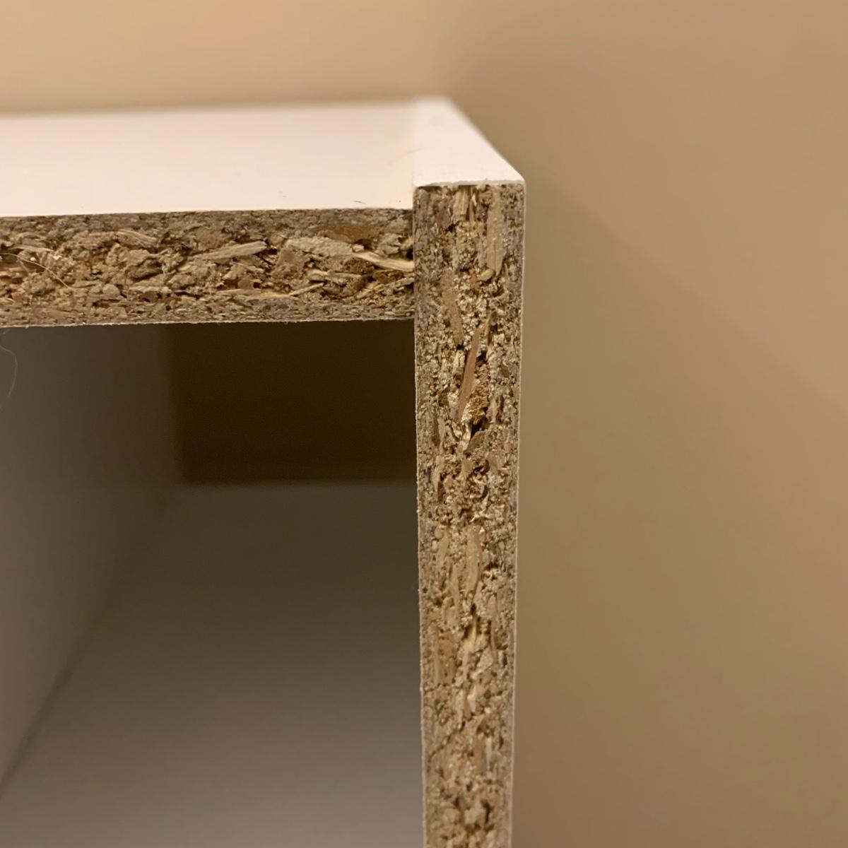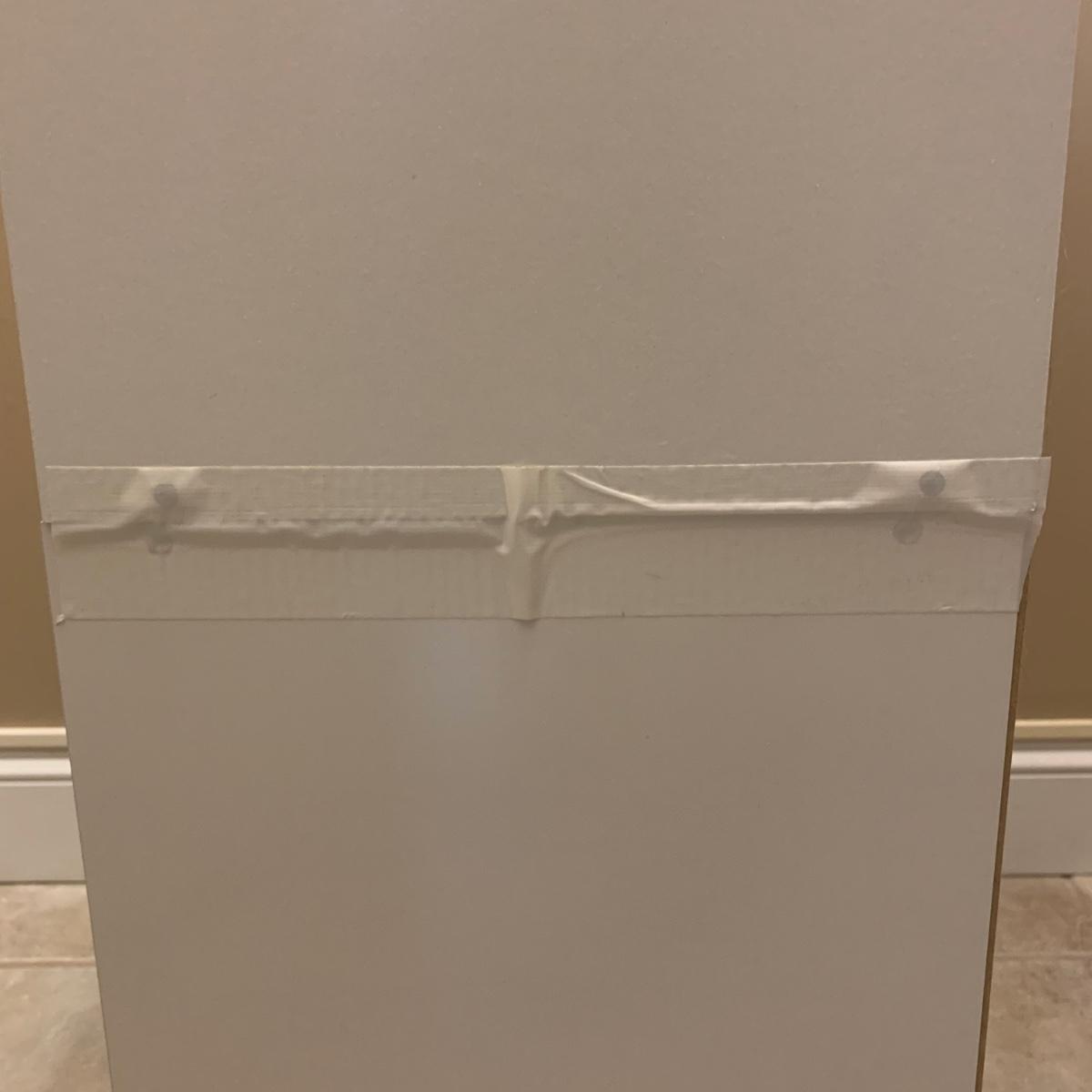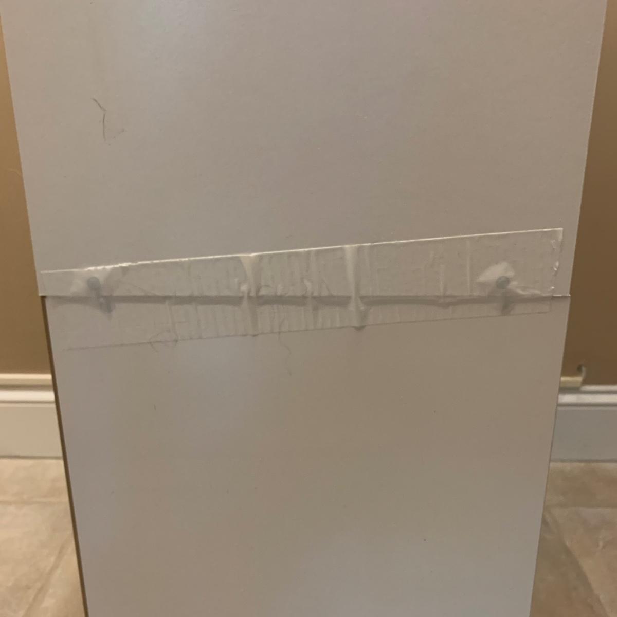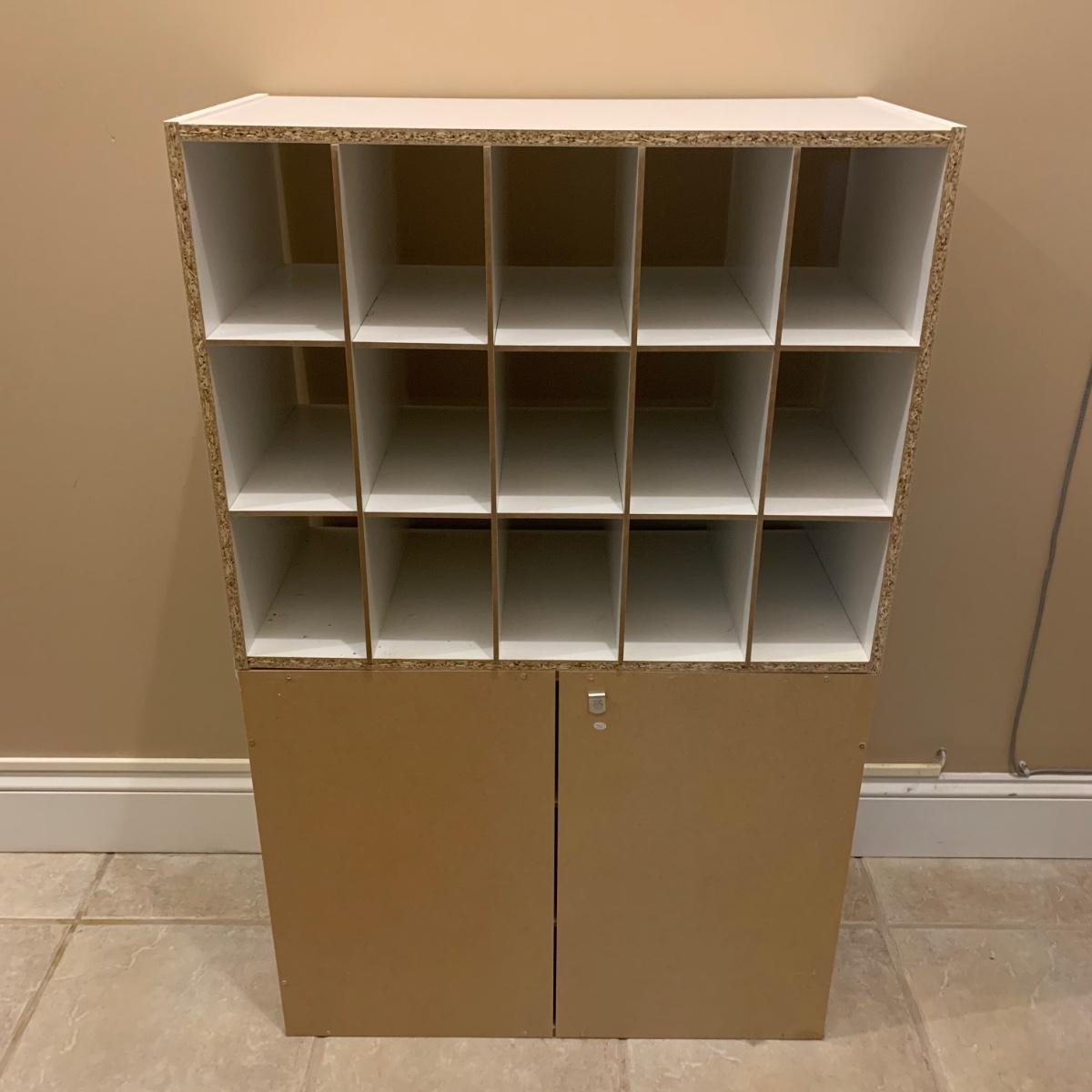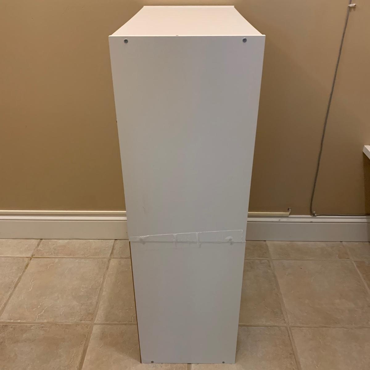 Shoe organizer made of engineered wood with white finish. Appears to be two shoe organizers connected by flex seal tape to create one unit. Item measures 24” x 12” x 38.5”H.