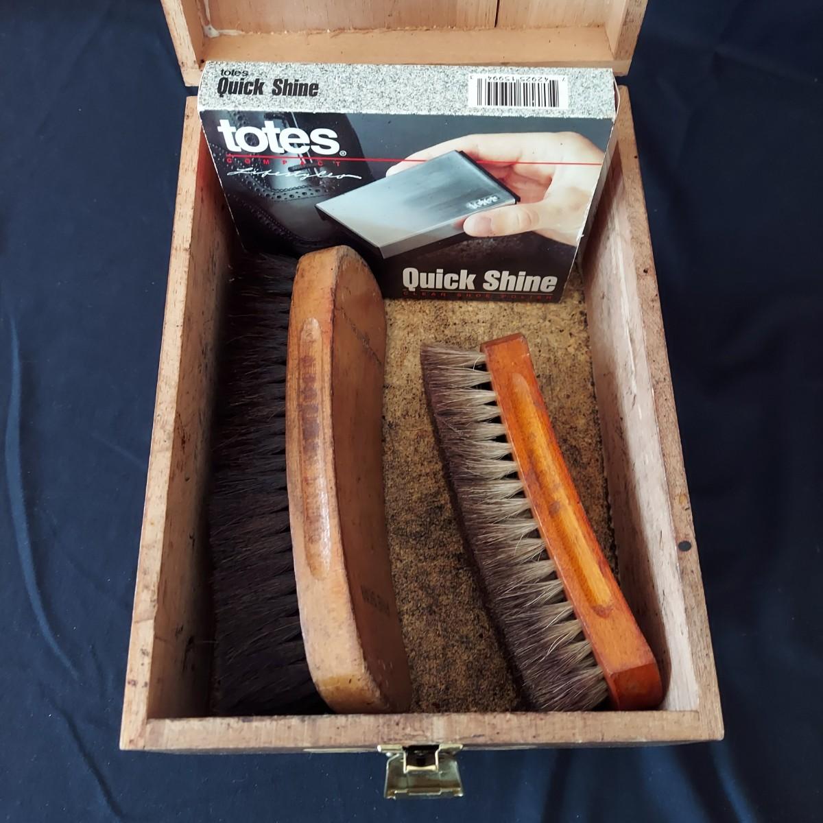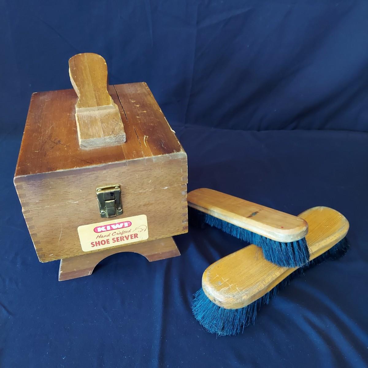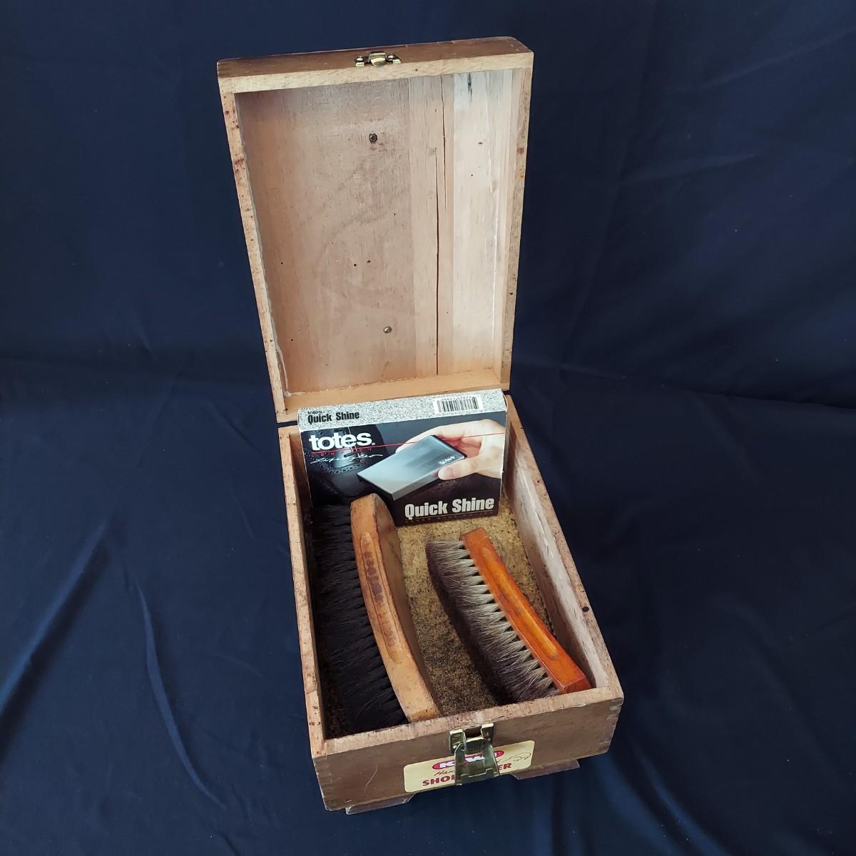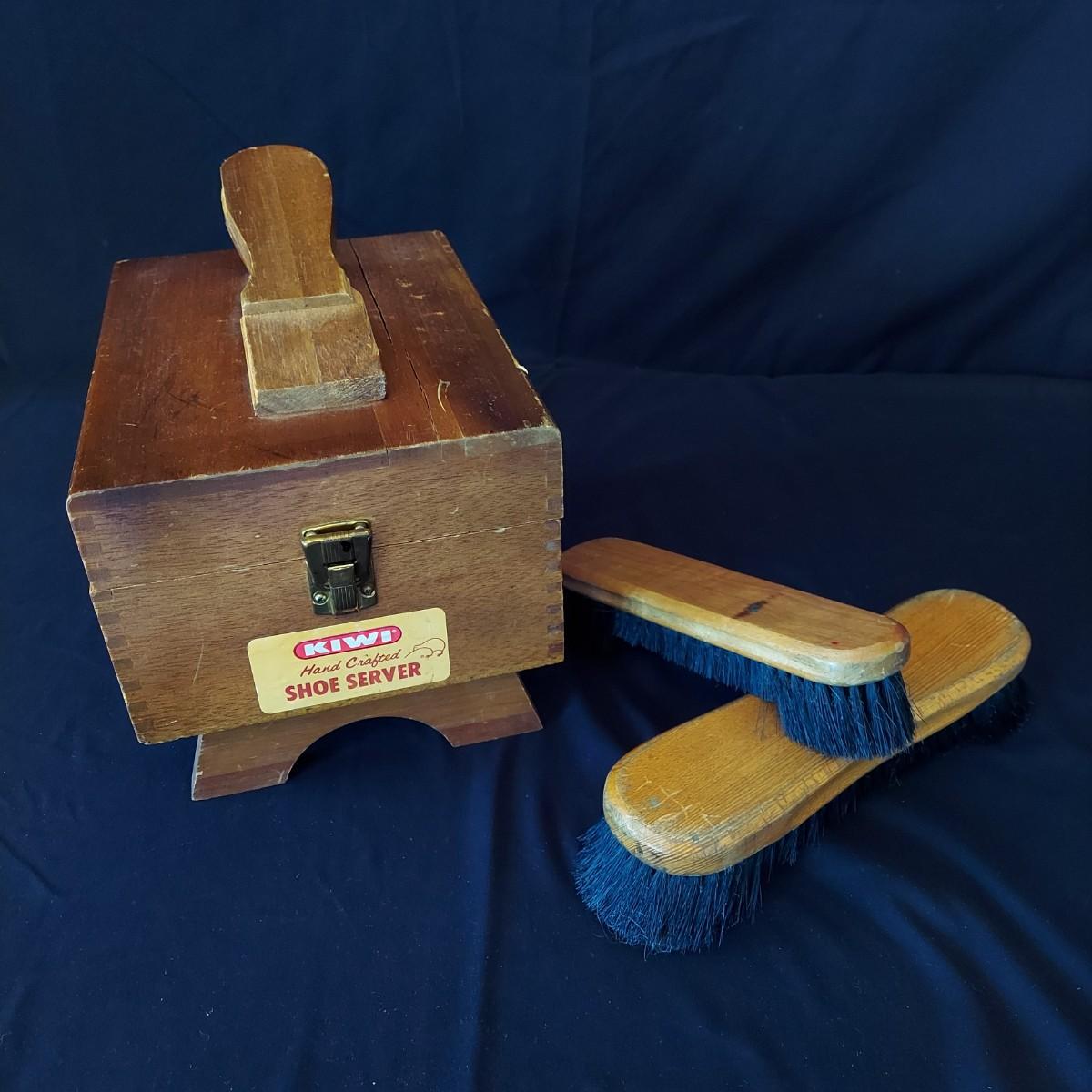 Wooden shoe shine kit and several boar bristle brushes. Also includes electronic shoe shine tool with attachments and other items. This piece was plugged in and turned on. Shipping available. Shipping can be costly. We suggest contacting our preferred local shipping provider, Postage Express, with dimensions and getting an estimate before bidding: (828) 670-5501or postageexpress@yahoo.com.