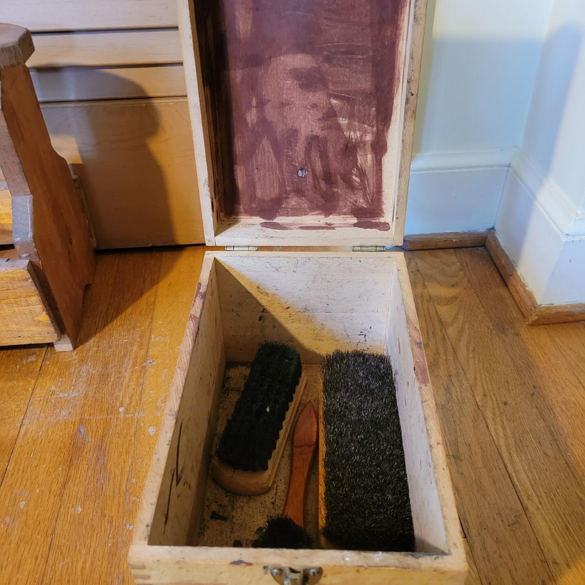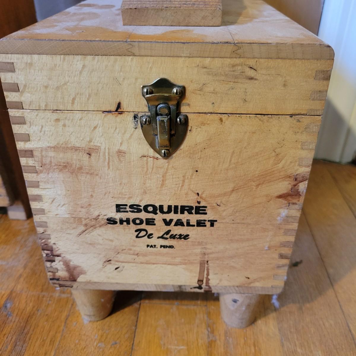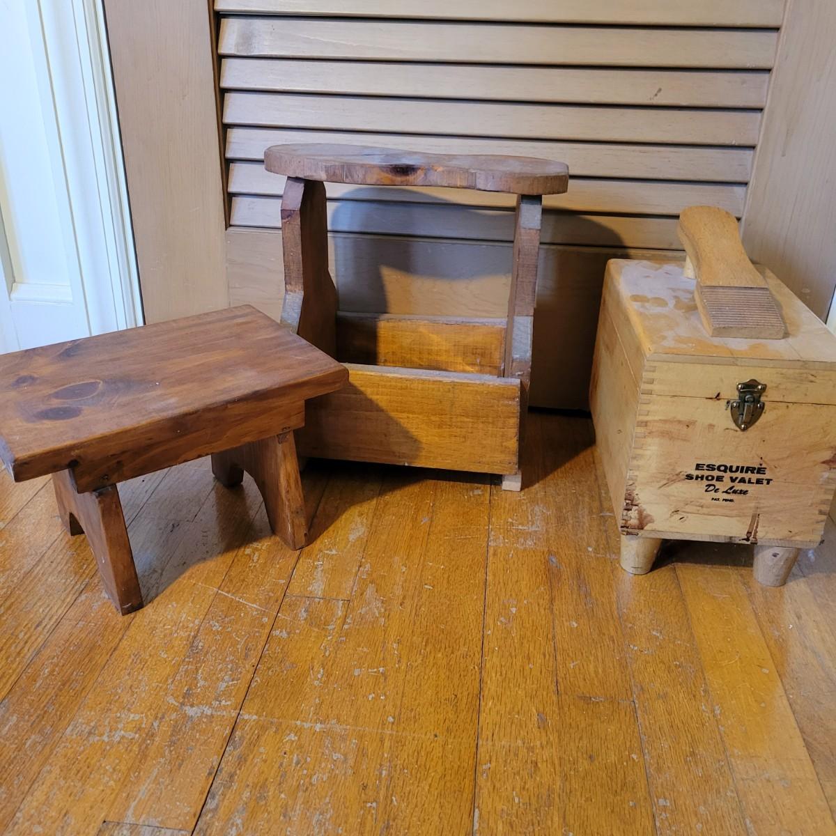 Two shoe valets and a small shoe stool in good condition. One shoe Valet is made by Esquire, is wooden and includes three brushes. Measures approximately 10.5" x 6.5" x 12". Also includes another shoe Valet with a shoe horn and a small stool for tying ones shoes. Local pickup only