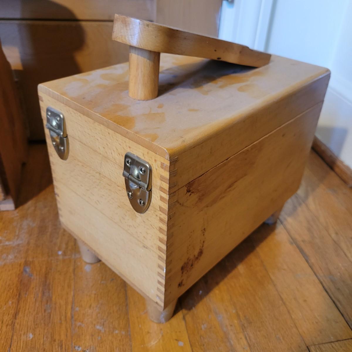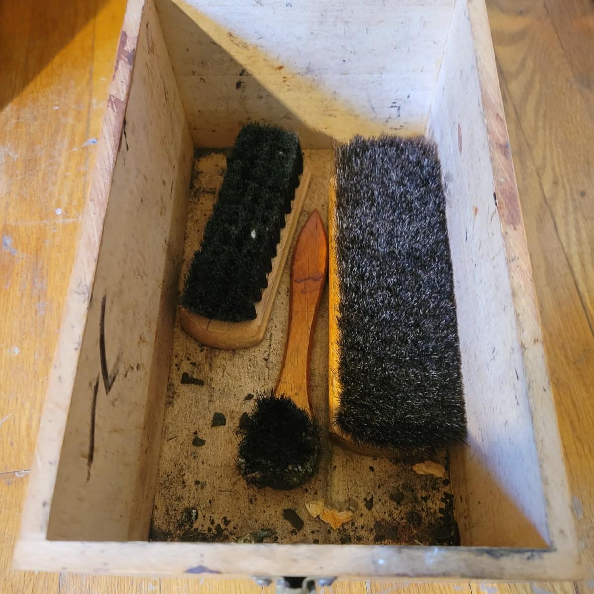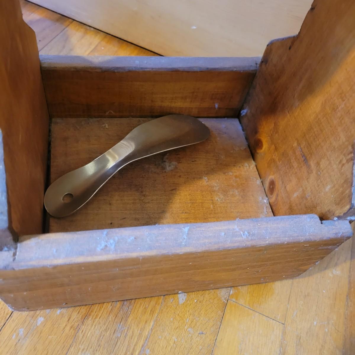 Two shoe valets and a small shoe stool in good condition. One shoe Valet is made by Esquire, is wooden and includes three brushes. Measures approximately 10.5" x 6.5" x 12". Also includes another shoe Valet with a shoe horn and a small stool for tying ones shoes. Local pickup only