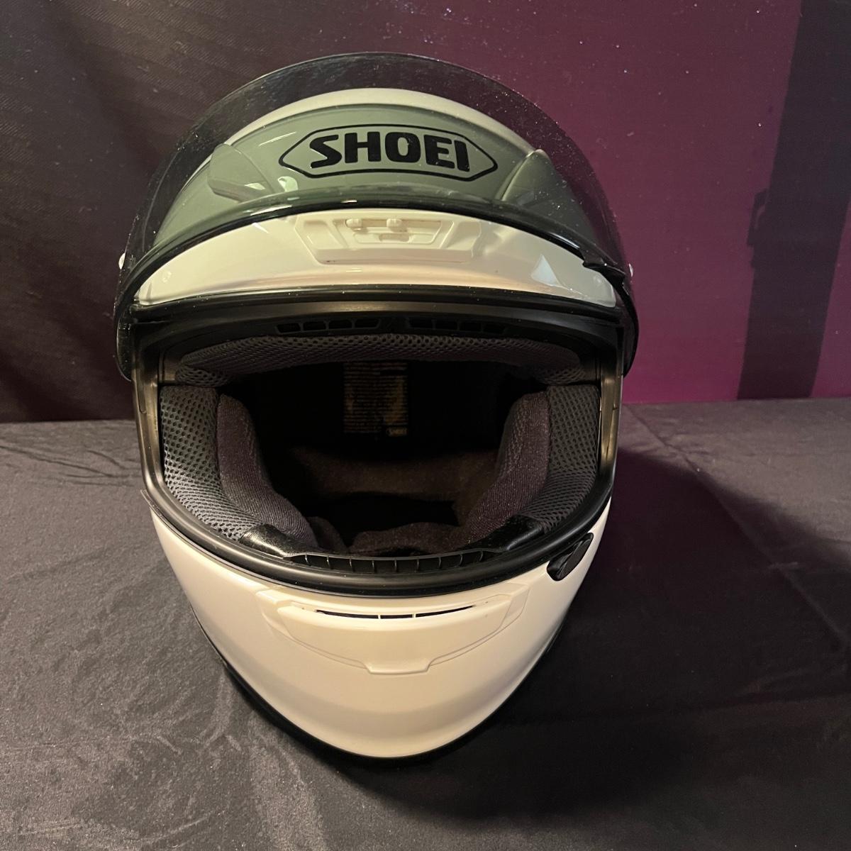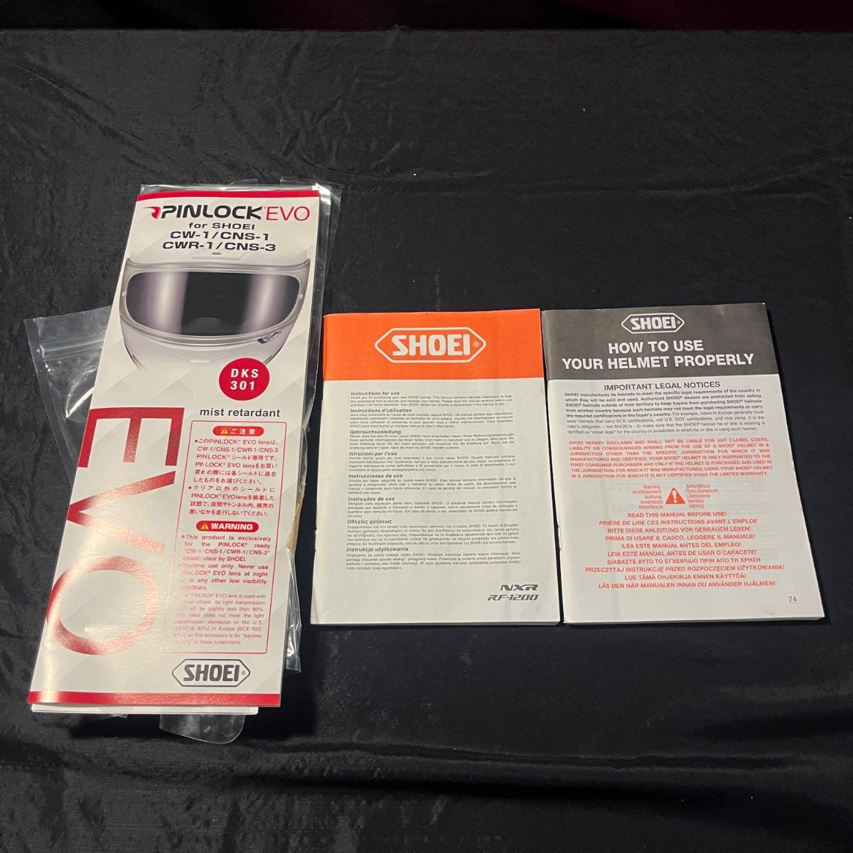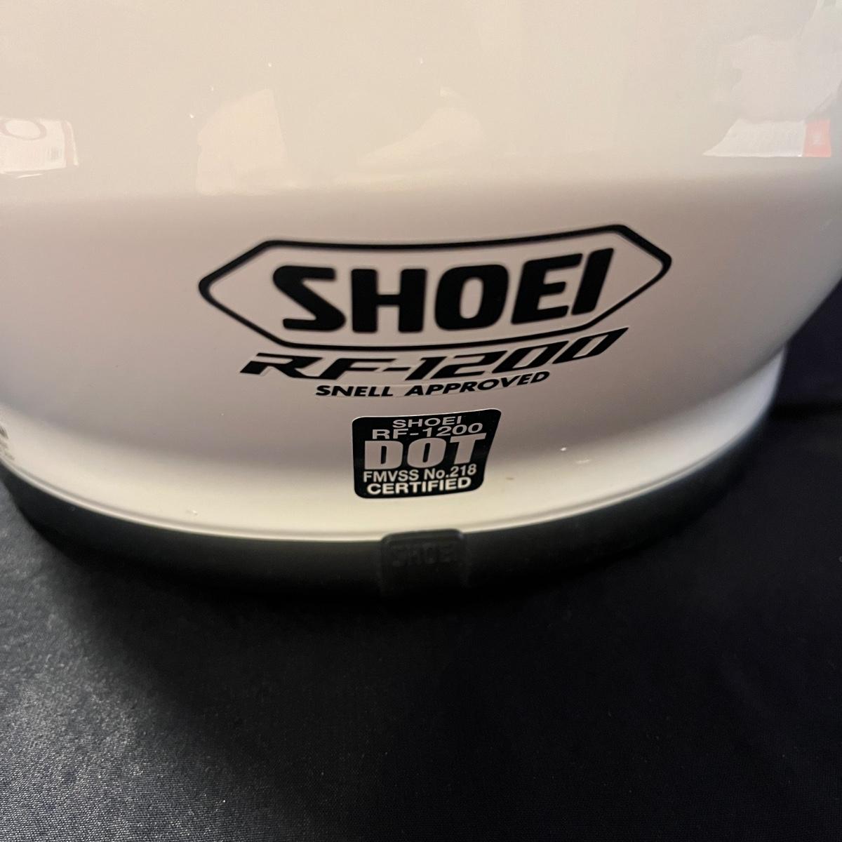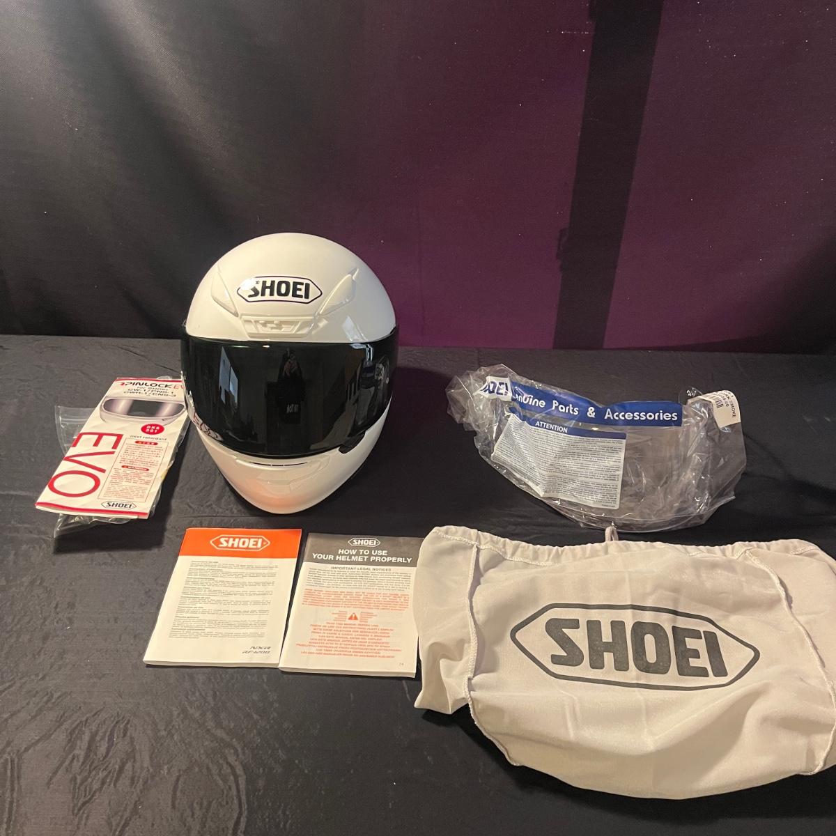 Lot includes a Shoei helmet model RF-1200 with with extra clear shield, bag and owners manual. Helmet size is 7 1/8-7 1/4.