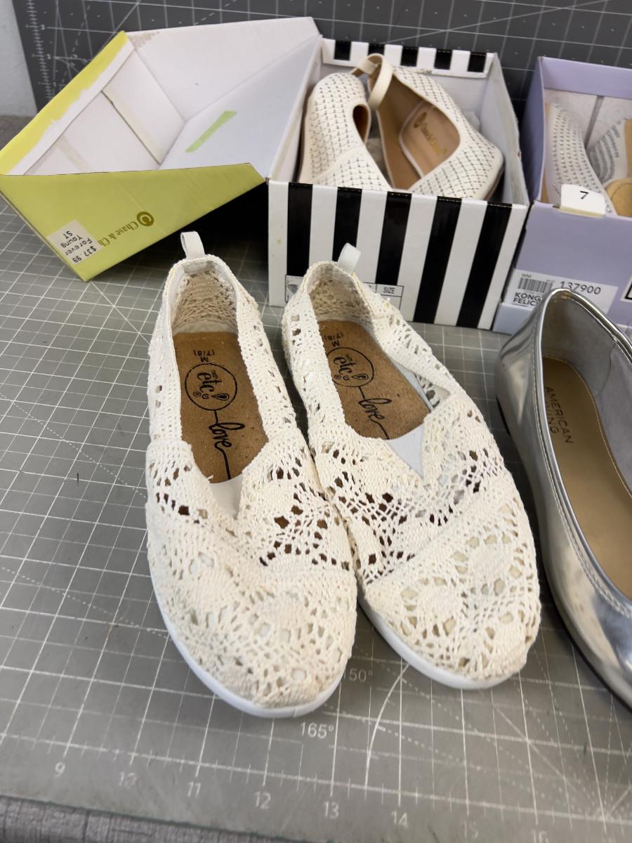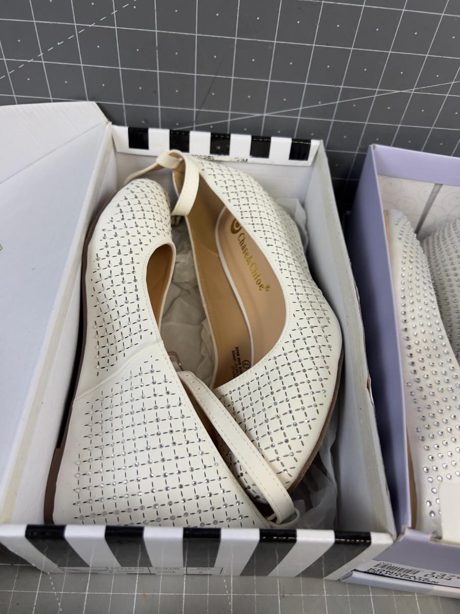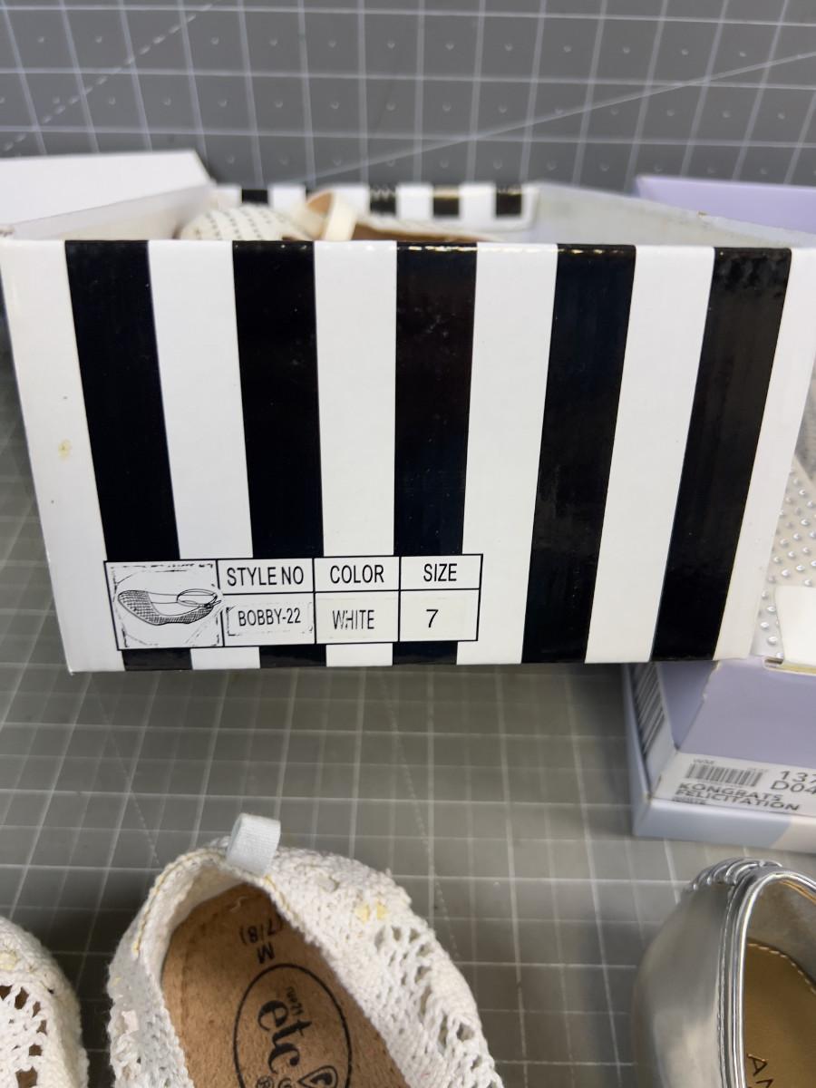 Mostly Flats 7- to 7-1/2 White and Silver. 2 pair no box. All Seem new