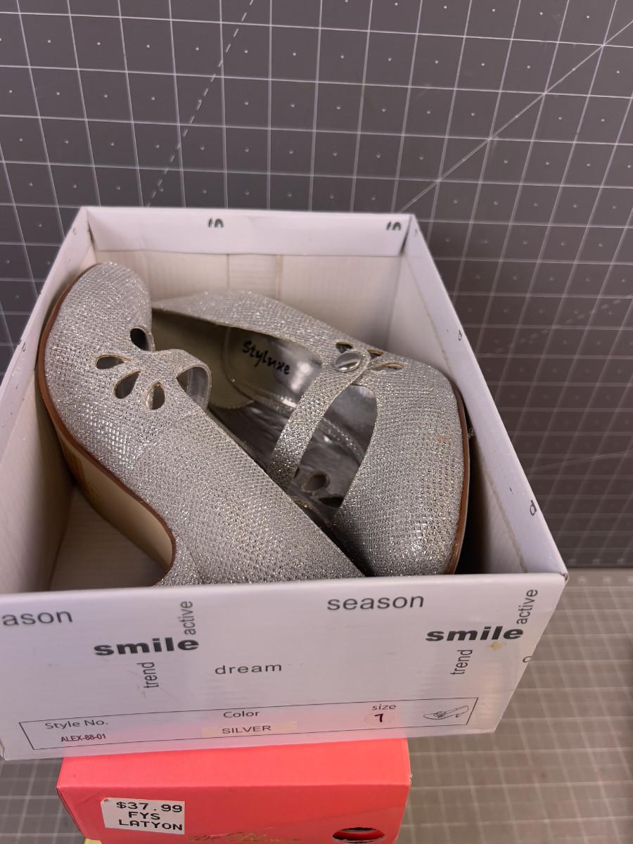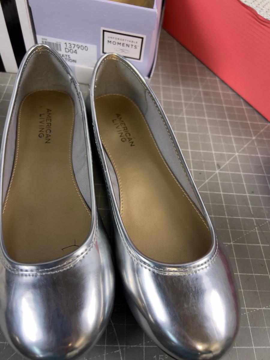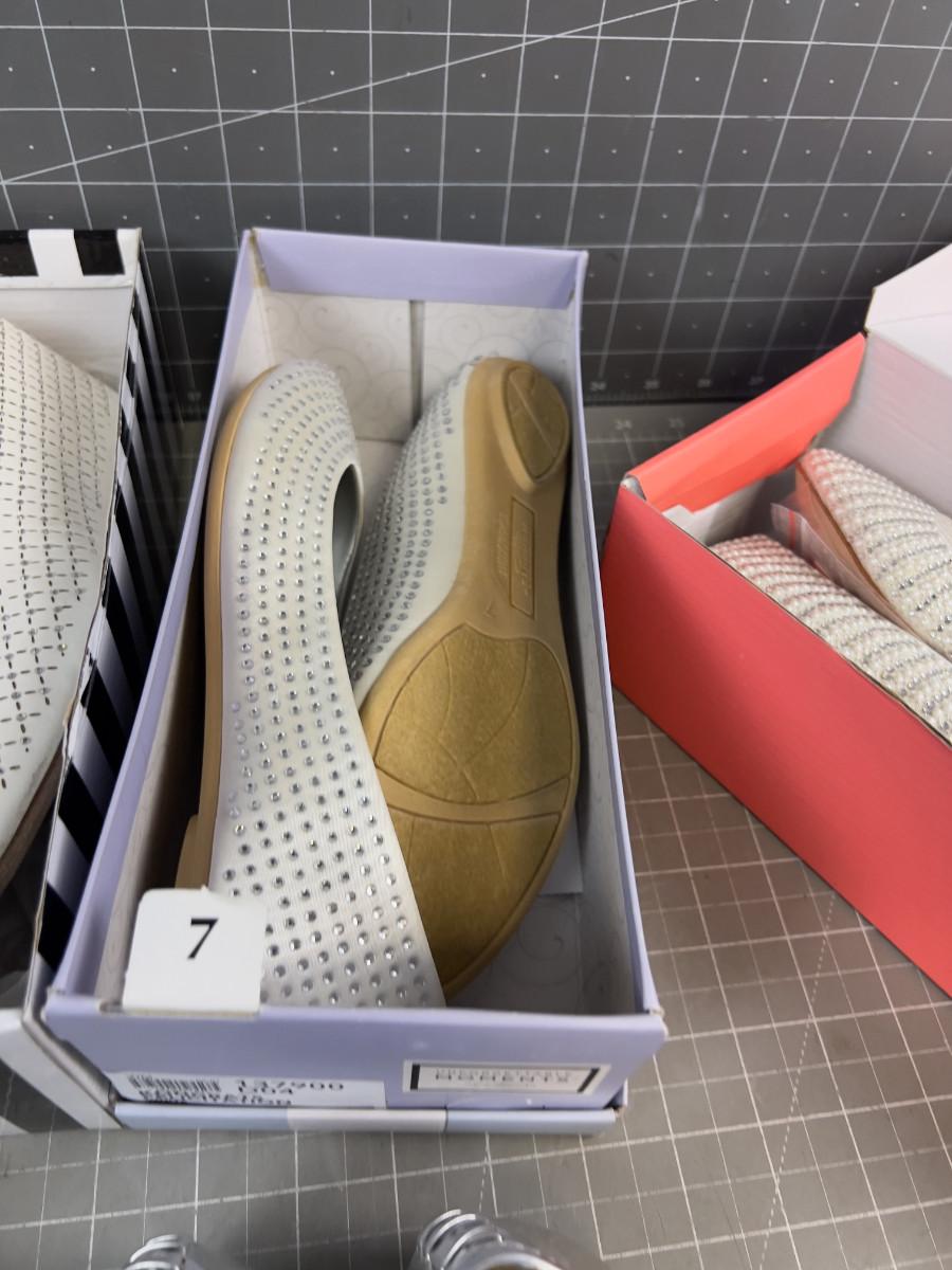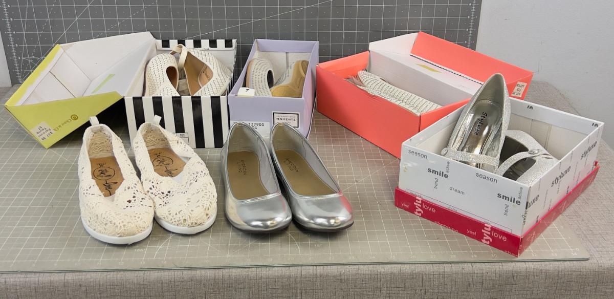 Mostly Flats 7- to 7-1/2 White and Silver. 2 pair no box. All Seem new