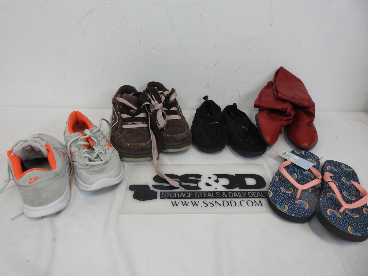 Shoes 6 pairs: sizes 6-8: Nike, Oxide water shoes, flip flops NEW, boots