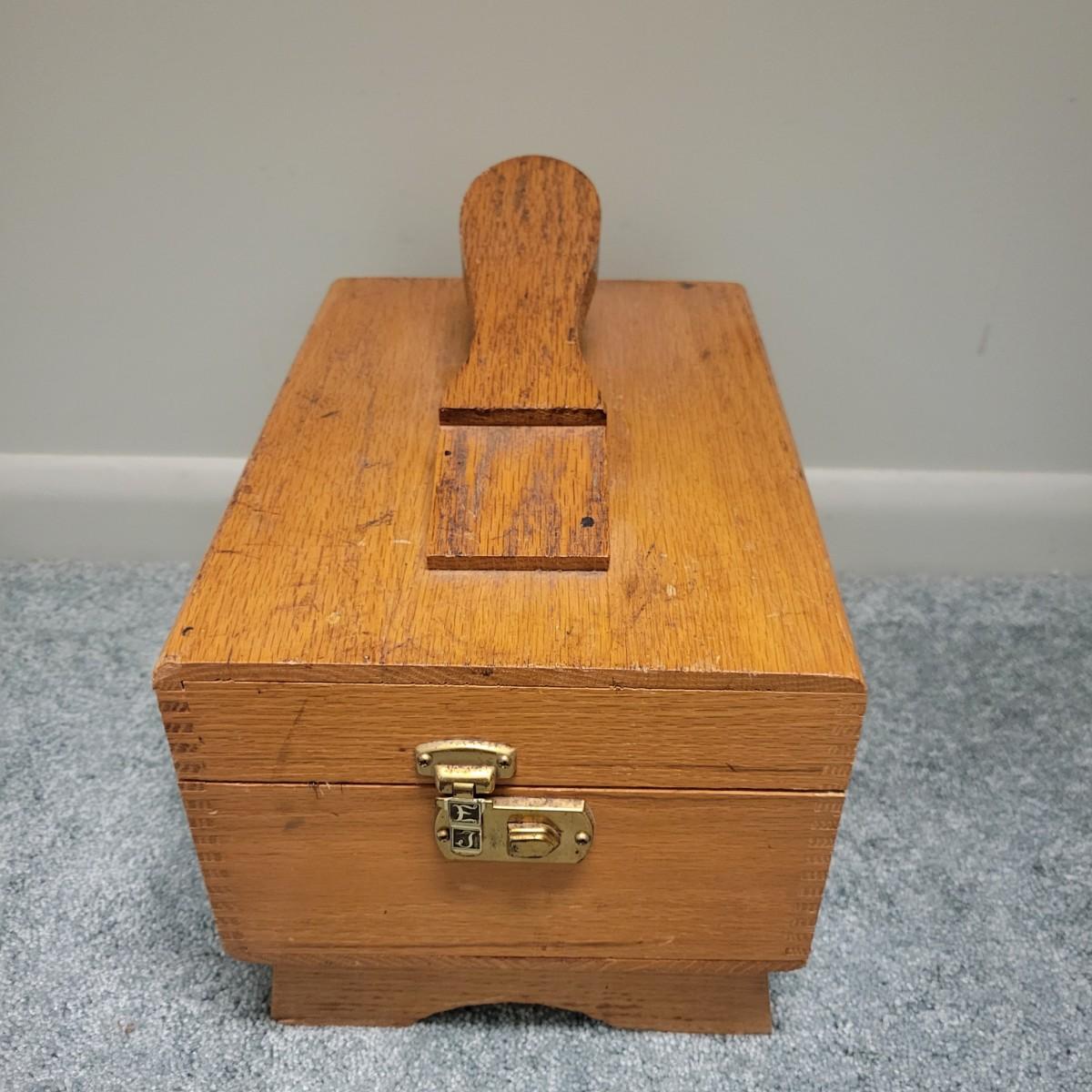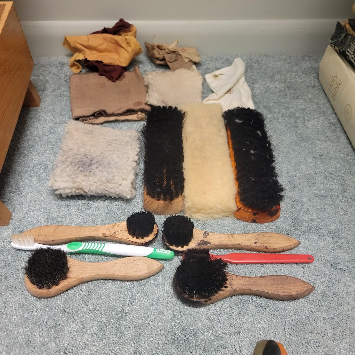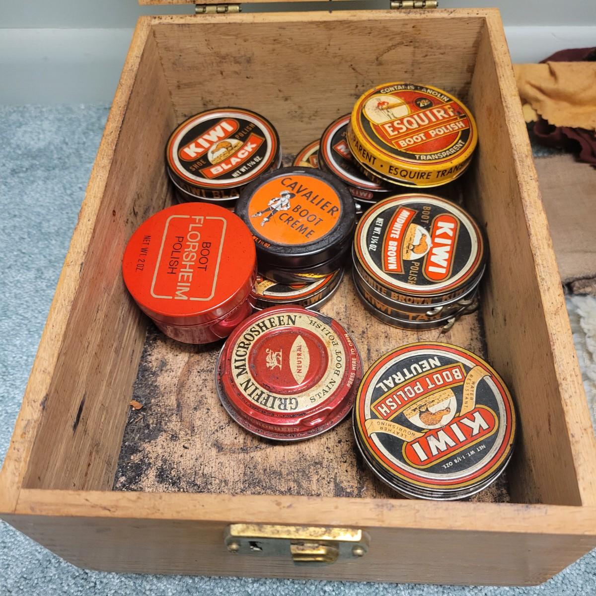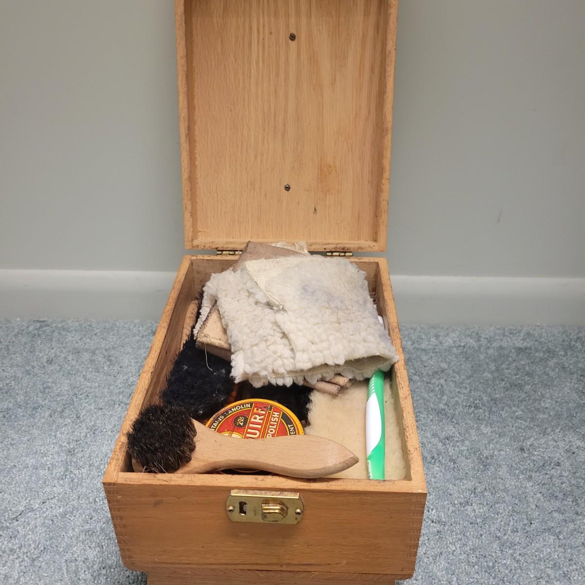 A shoeshine box that has storage inside of it to hold all of your shoeshining needs. Lot includes a multitude of brushes, cloths and a variety of polishes and shoe creams. Items are used and the box itself is in good condition with some minor blemishes. Box measures approximately 8" x 11" x 12" Shipping available