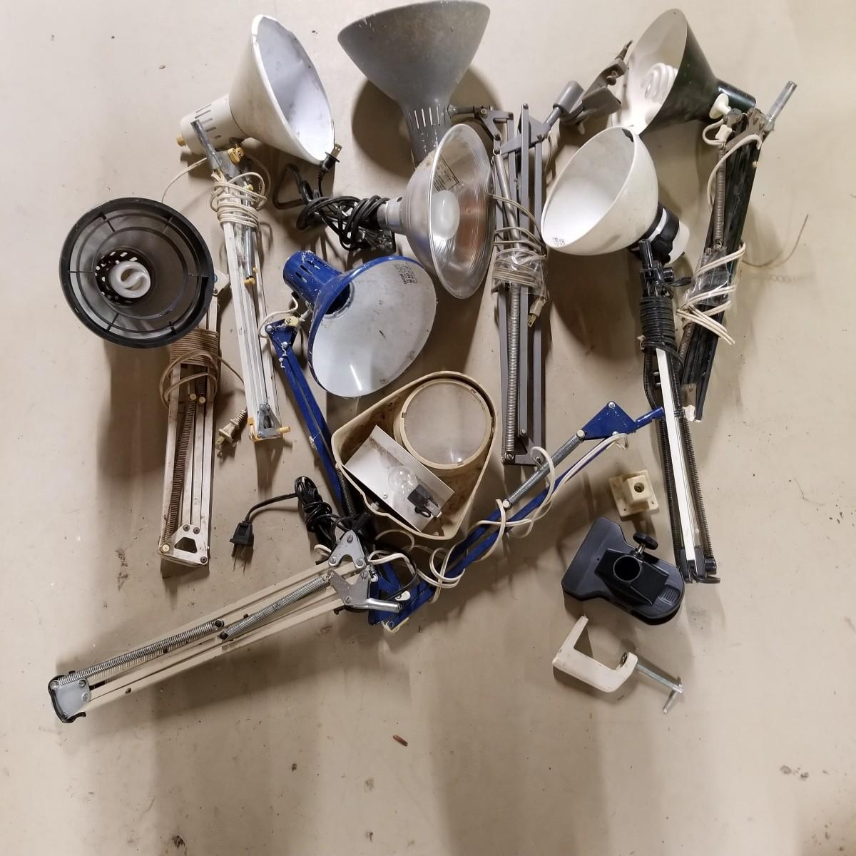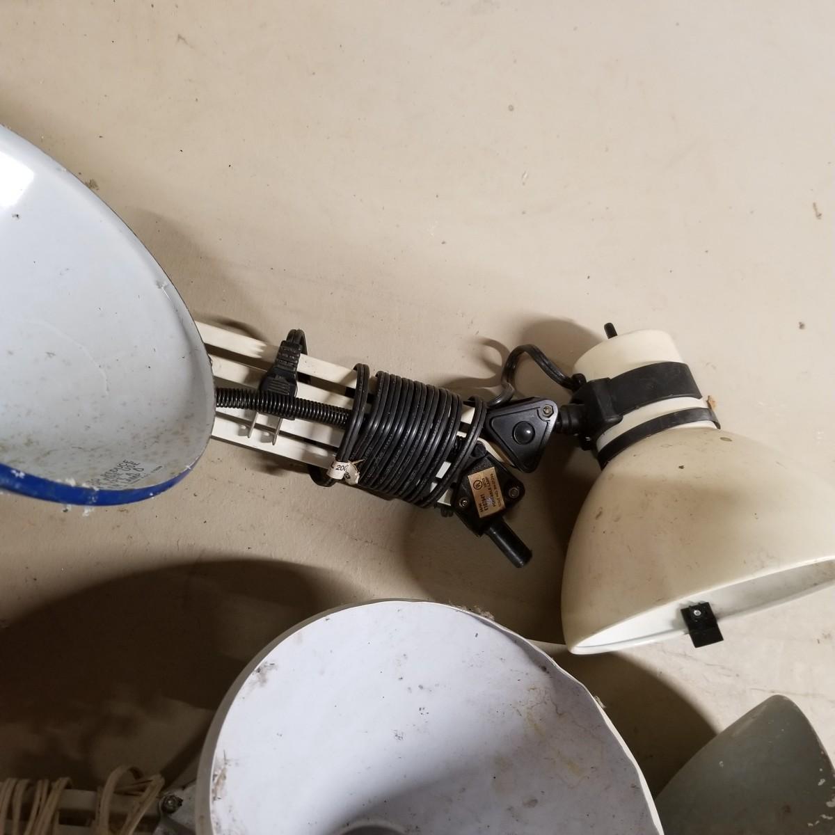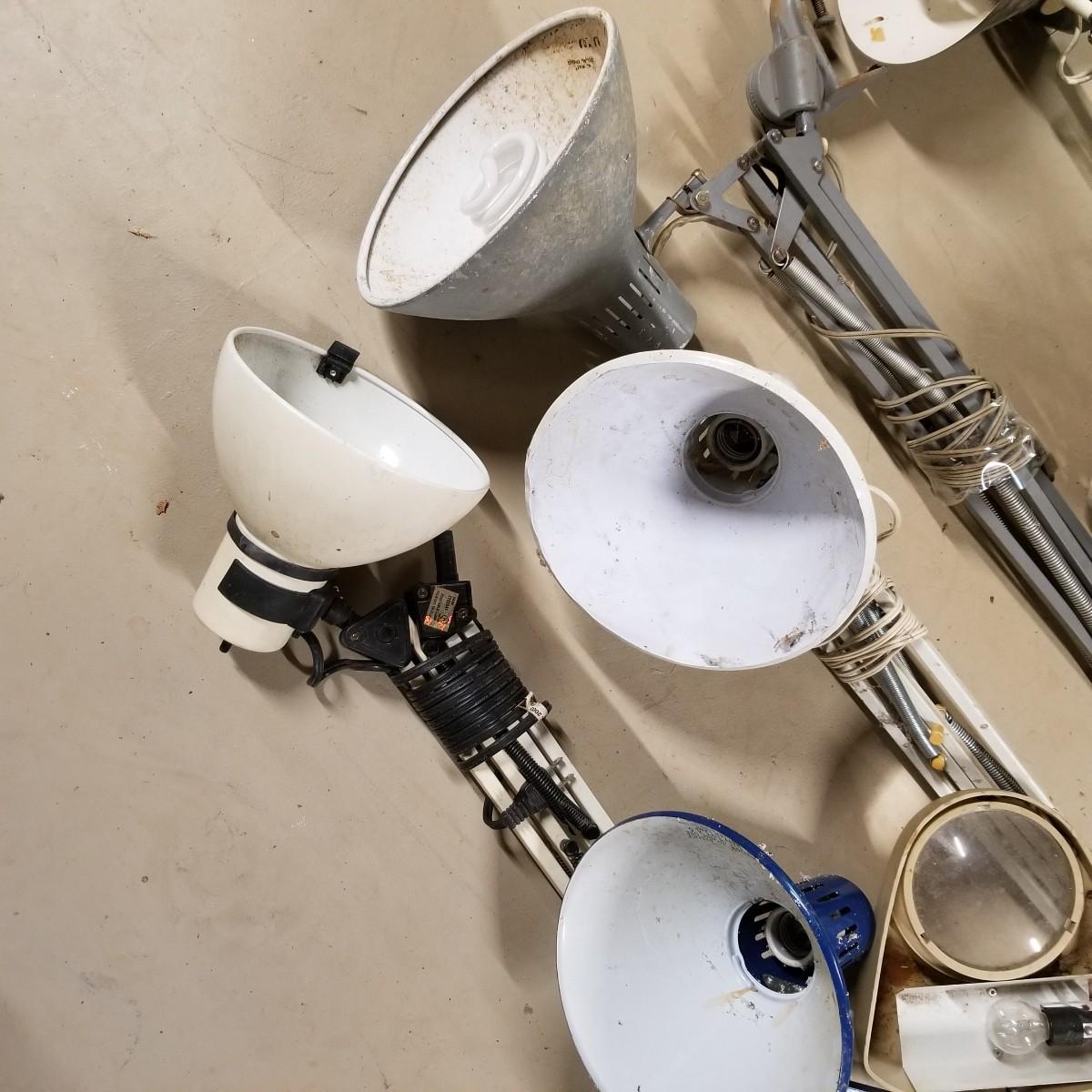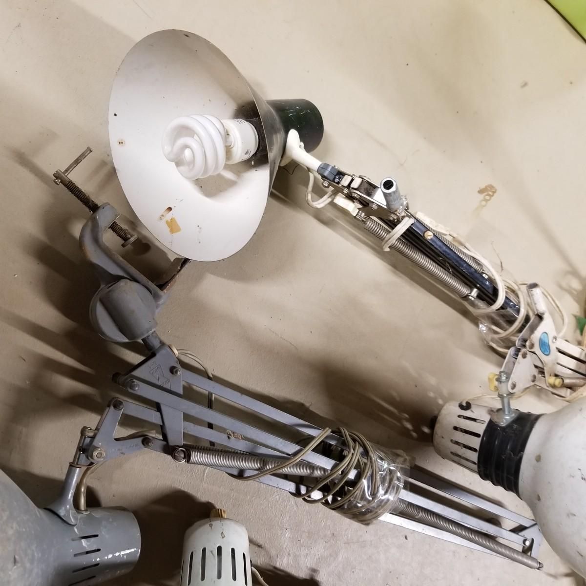 Group of eight shop lamps.   All in working condition.   Seven extendable arm lamps, one which has a magnifier lens.  One standard clip on light.  Please note that not all lamps have attachment bases or bulbs.  Blue lamp needs arm reattached.  Local pickup only.