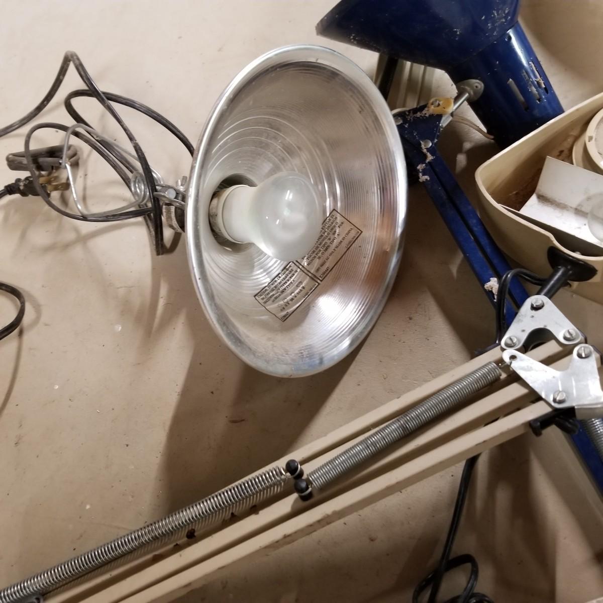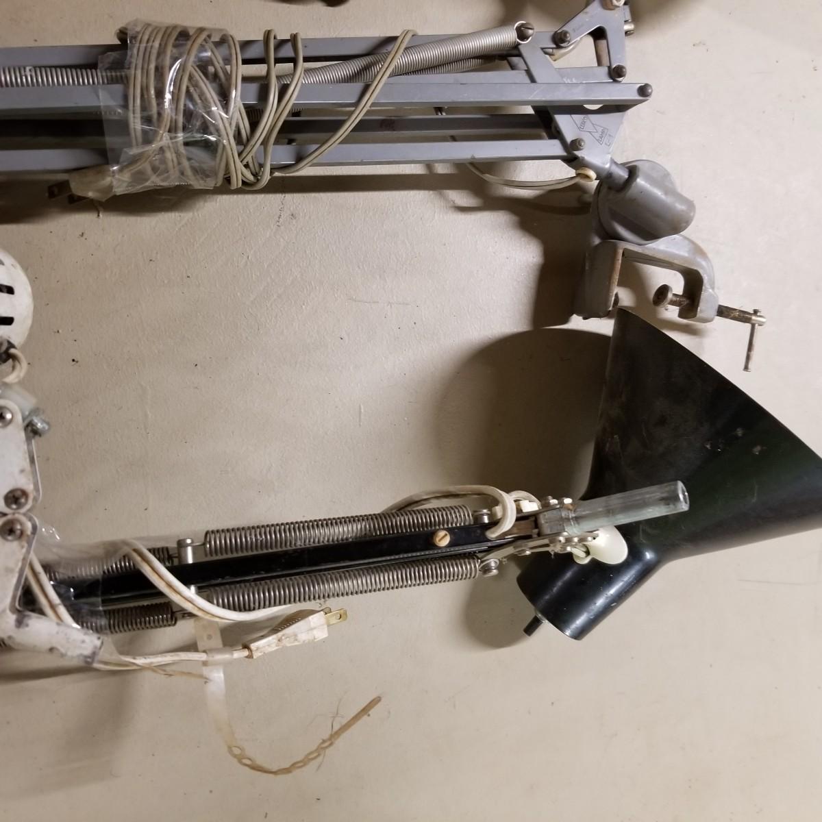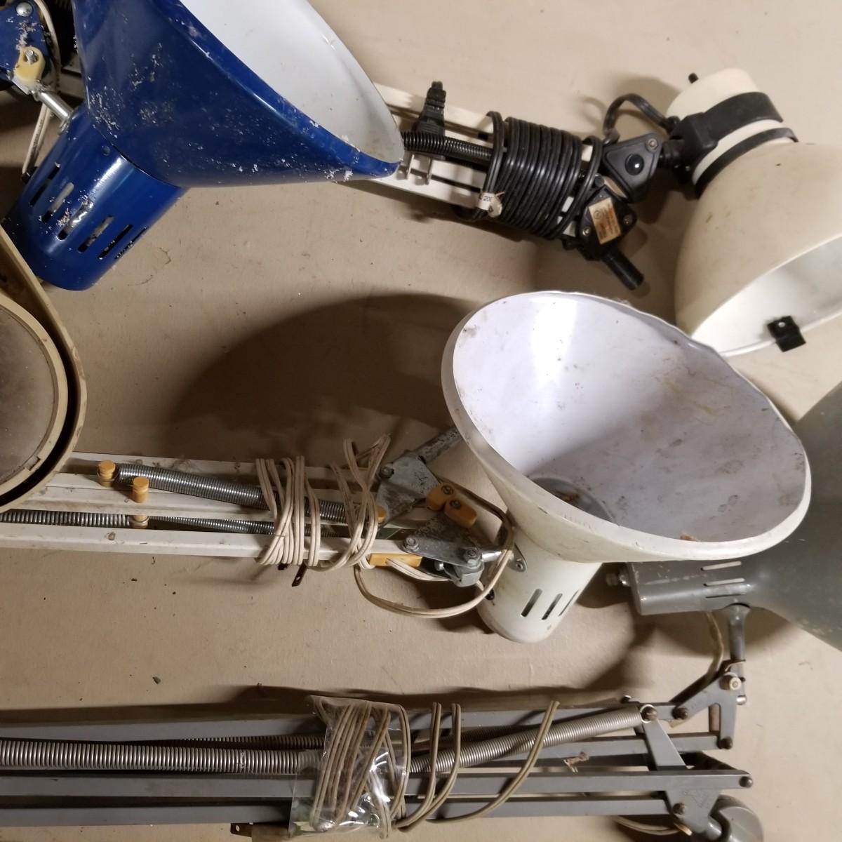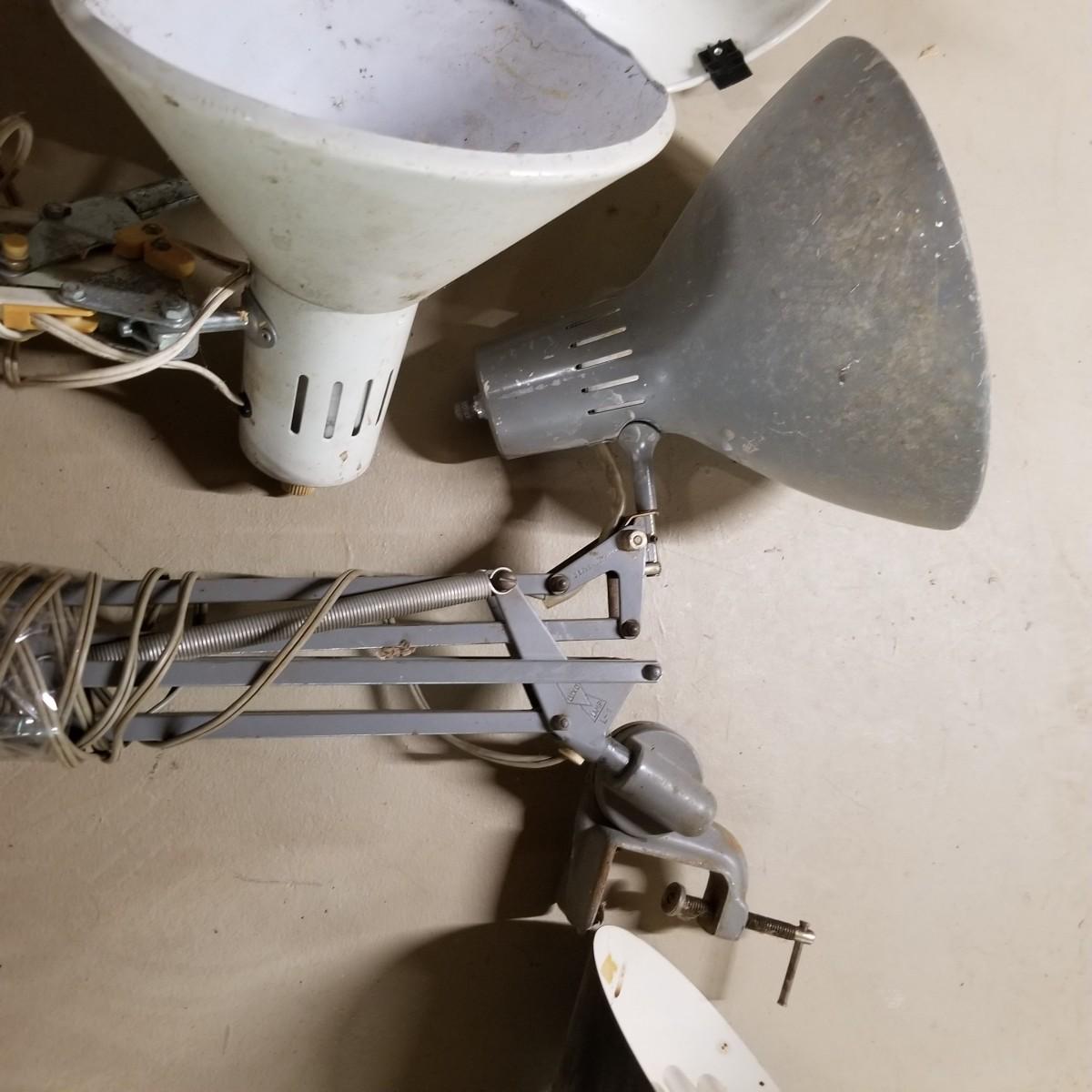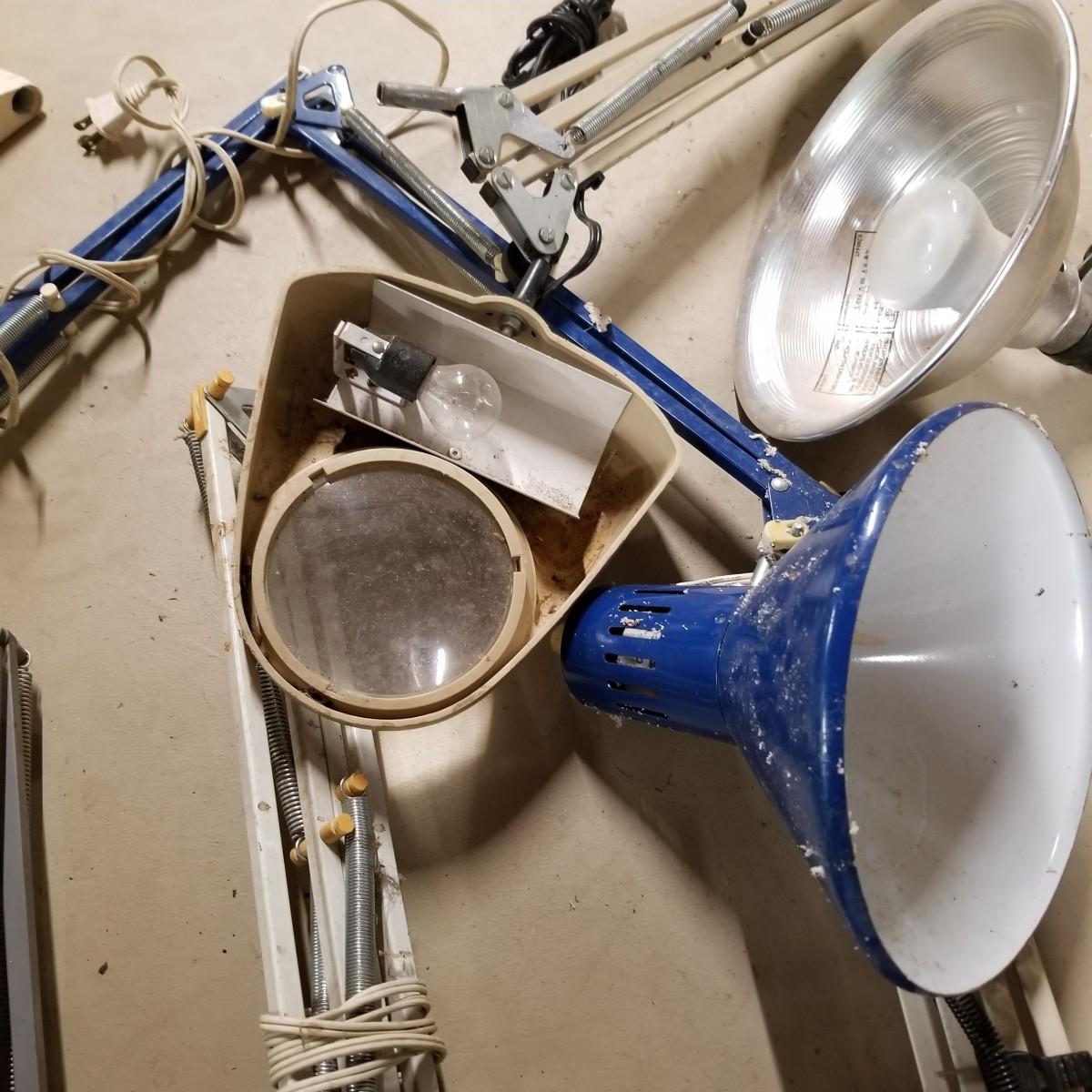 Group of eight shop lamps.   All in working condition.   Seven extendable arm lamps, one which has a magnifier lens.  One standard clip on light.  Please note that not all lamps have attachment bases or bulbs.  Blue lamp needs arm reattached.  Local pickup only.