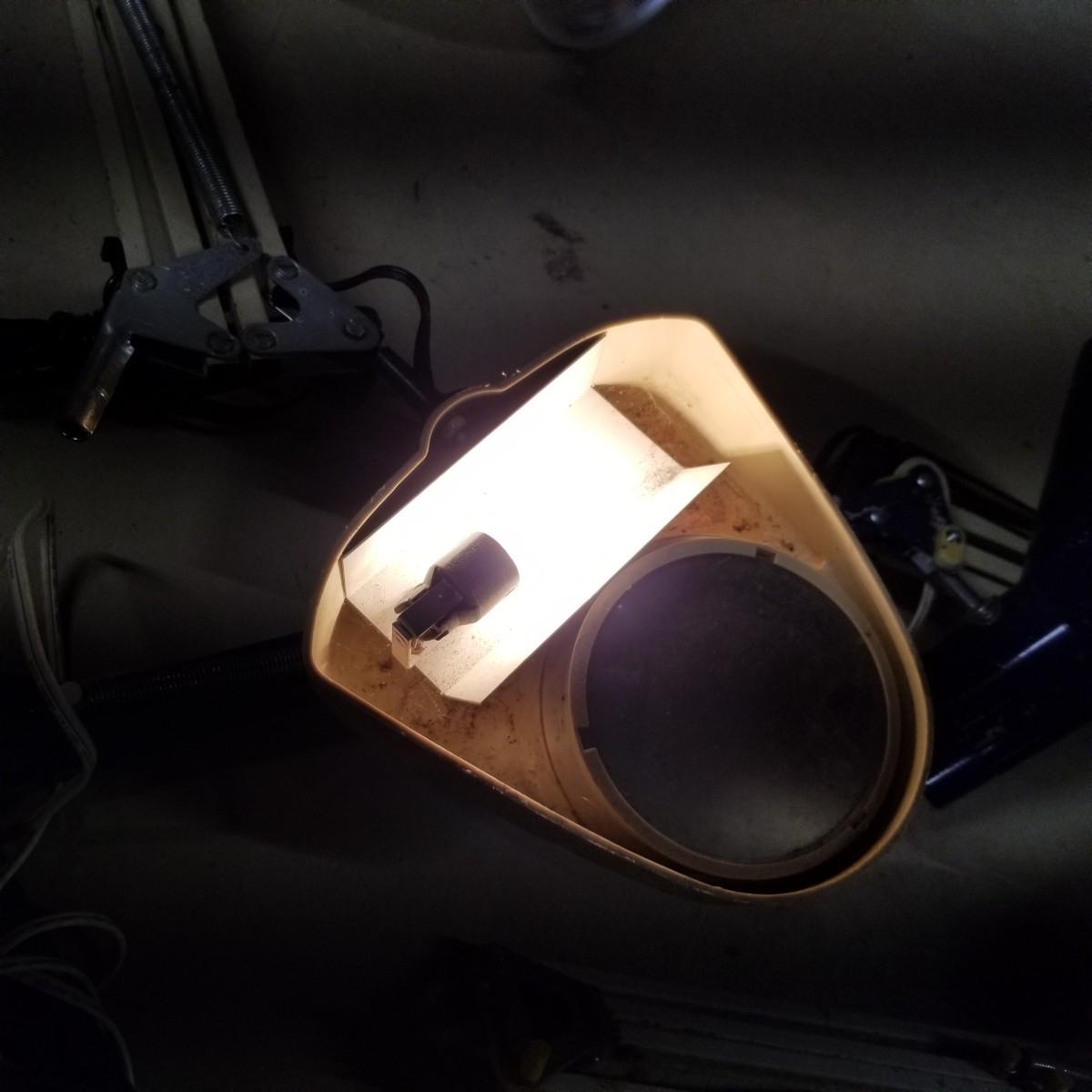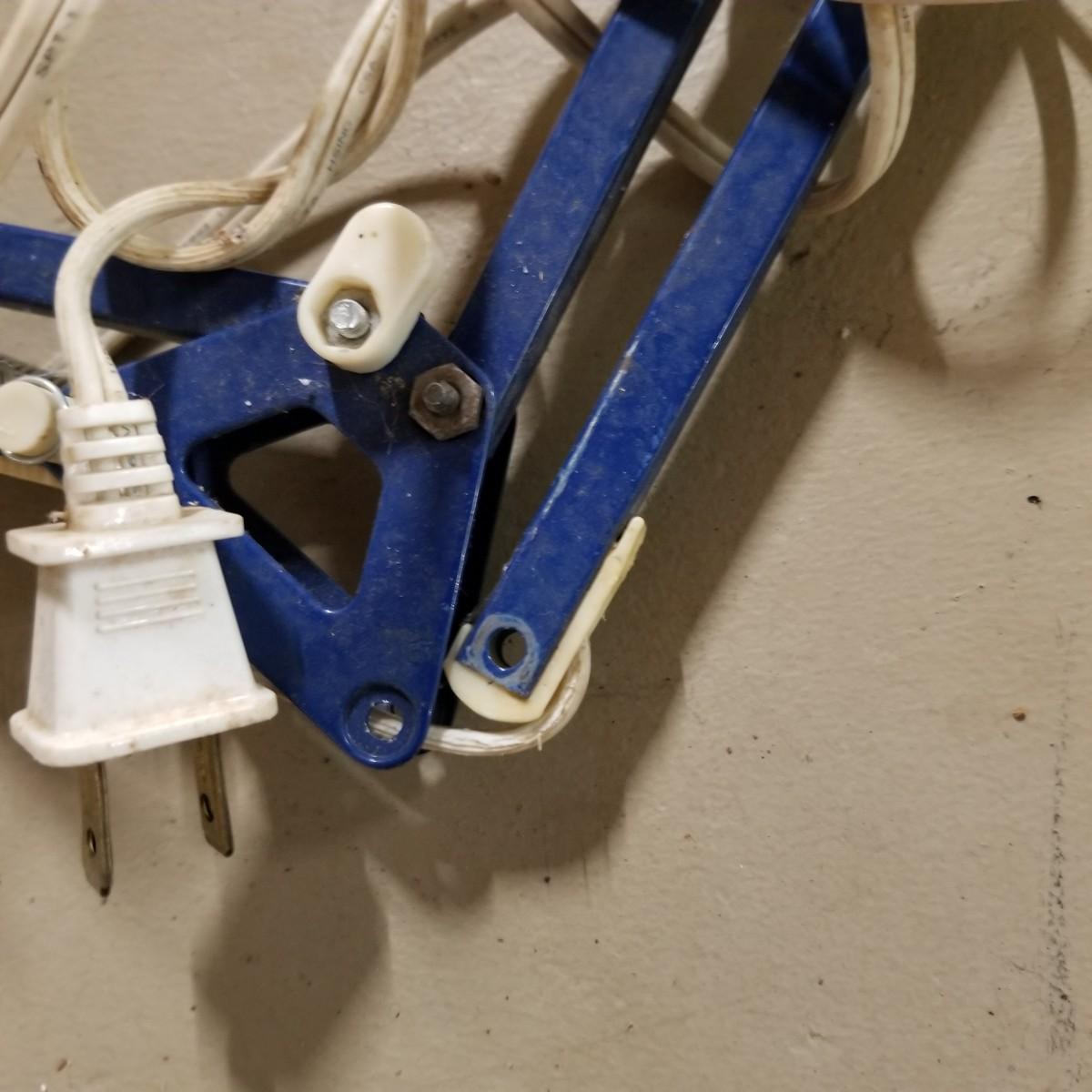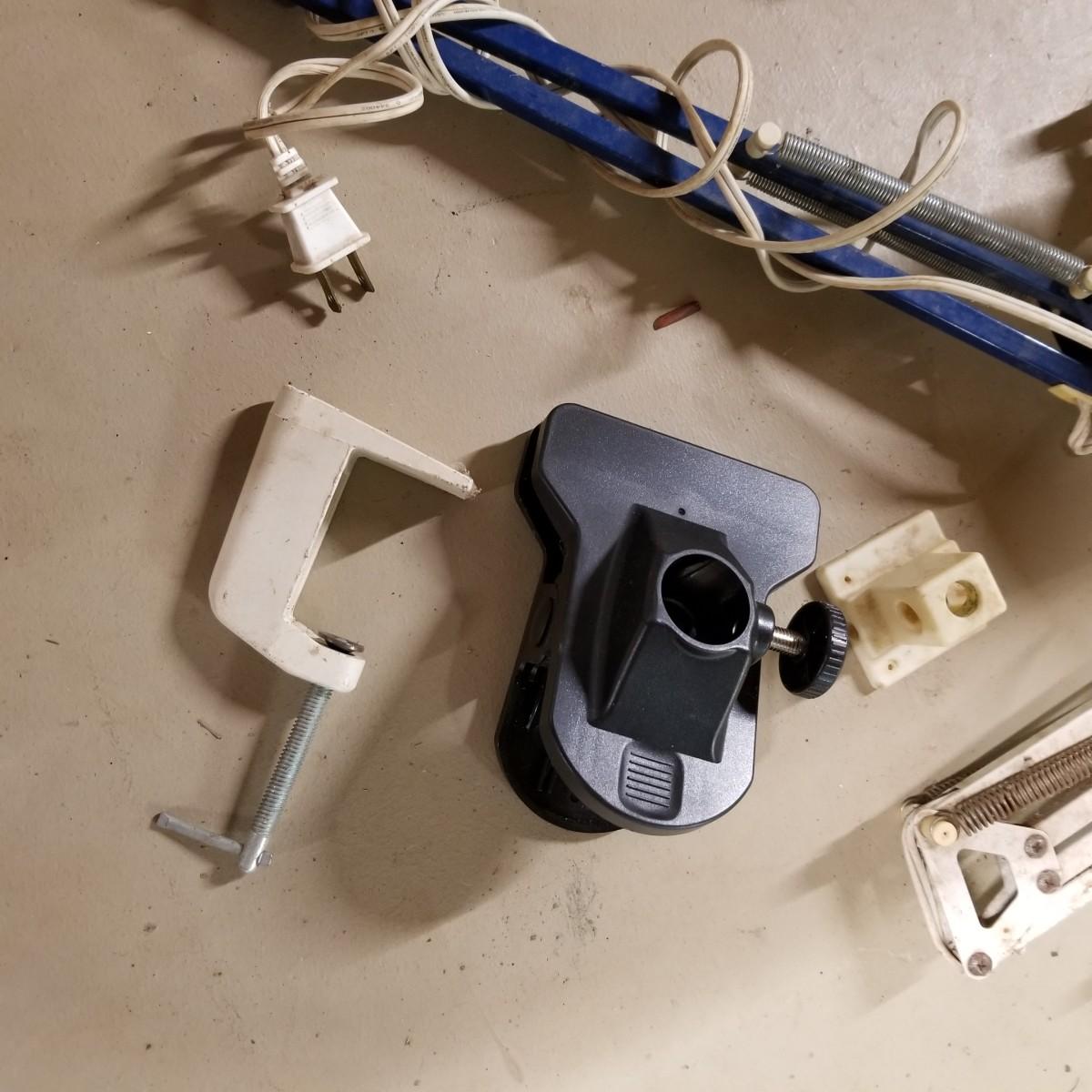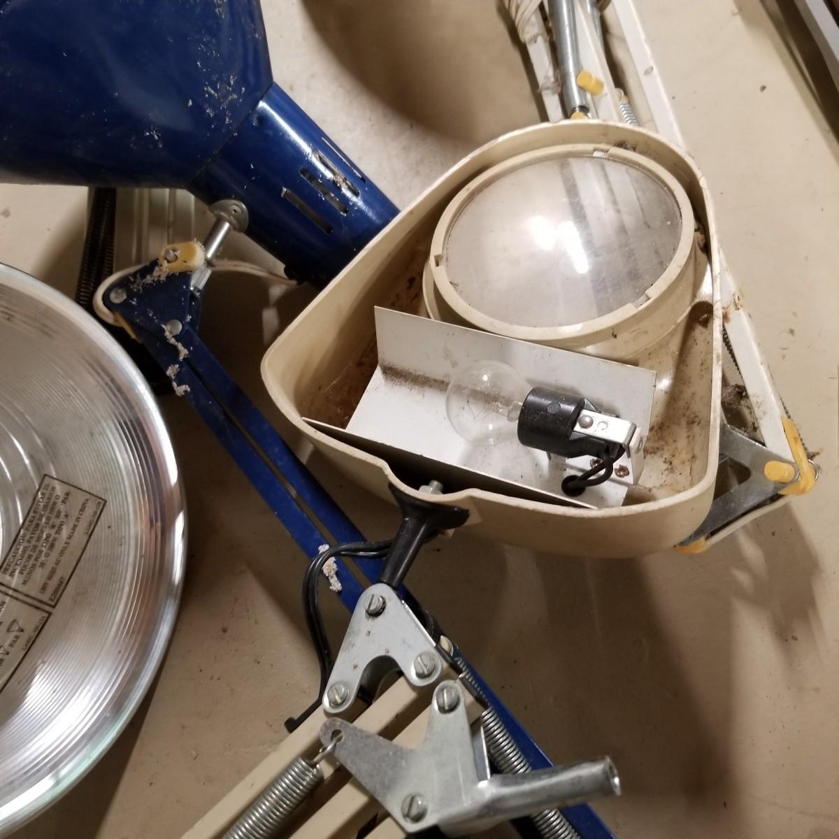 Group of eight shop lamps.   All in working condition.   Seven extendable arm lamps, one which has a magnifier lens.  One standard clip on light.  Please note that not all lamps have attachment bases or bulbs.  Blue lamp needs arm reattached.  Local pickup only.