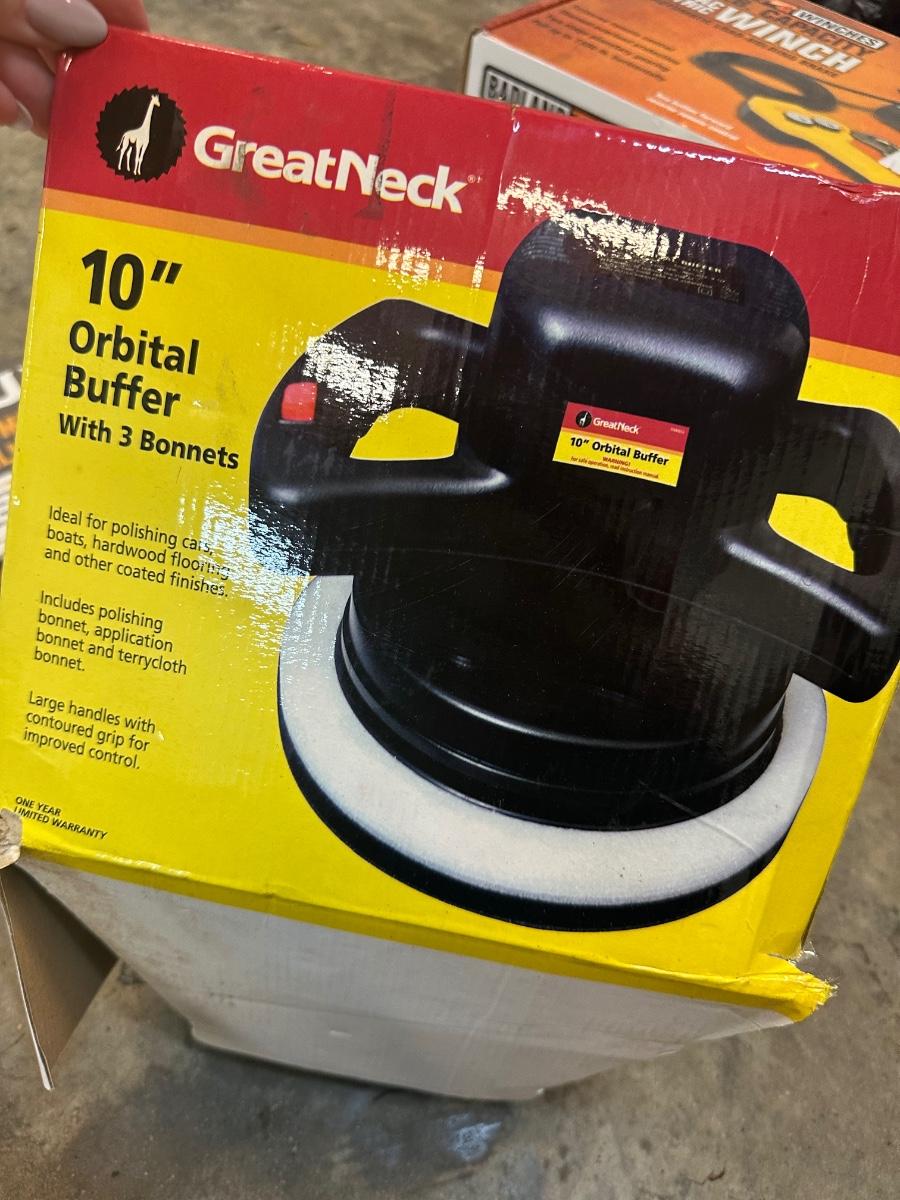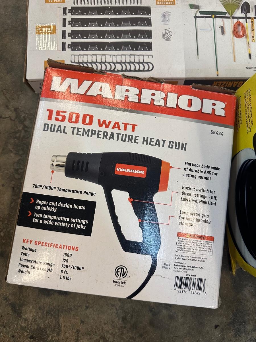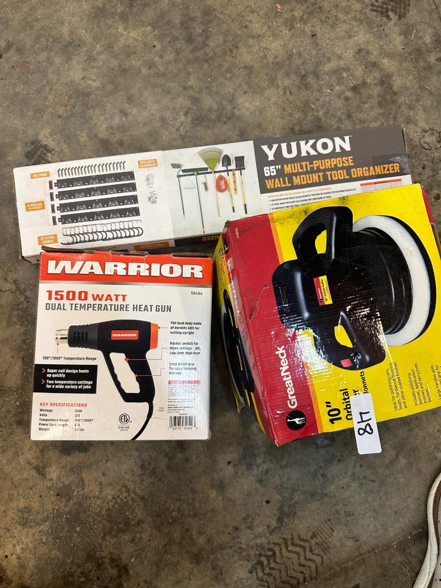 SHOP TOOL LOT INCLUDES YUKON TOOL ORGANIZER WARRIOR 1500 WATT HEAT GUN, GREATNECK 10 IN ORBITAL BUFFER NEW IN BOXES