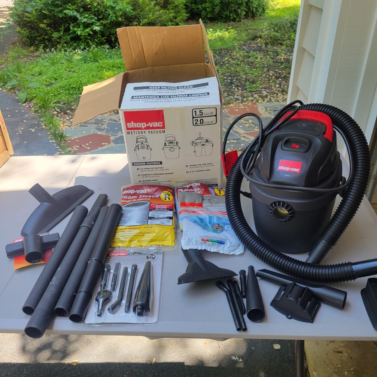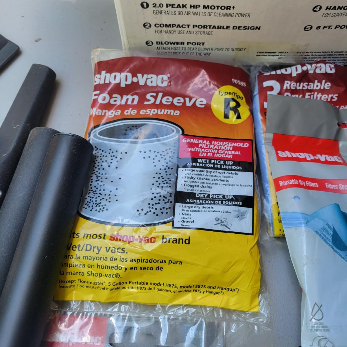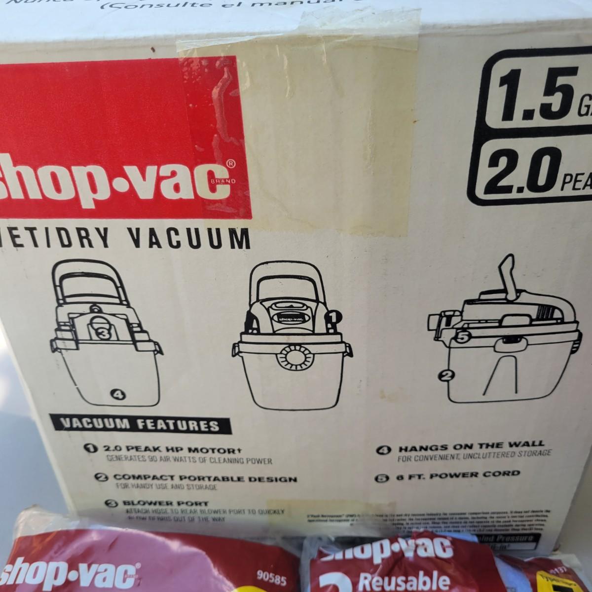 1.5 gal, 2hp Shop Vac in New condition. Includes many Shop vac brand accessories. Extra filters, foam sleeve, micro cleaning kit and more. Local pickup only