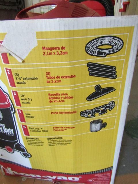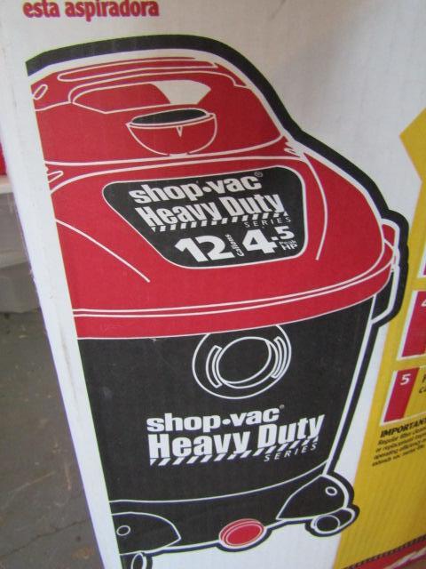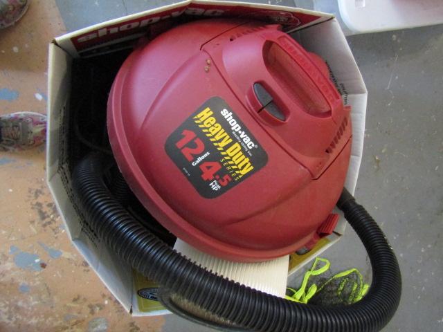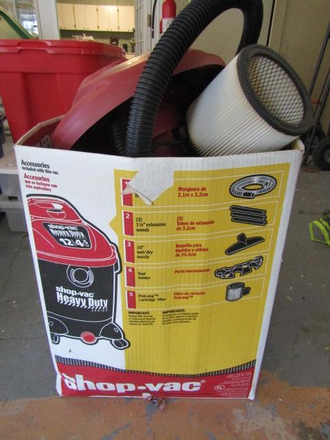 Shop-Vac Heavy Duty 12 Gallon. Pieces all appear to be present. Unit powers on.