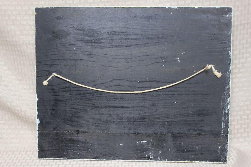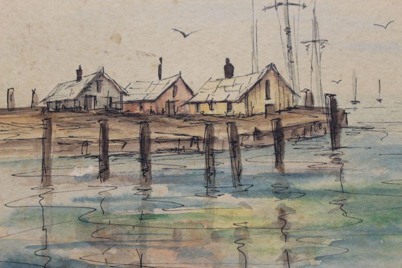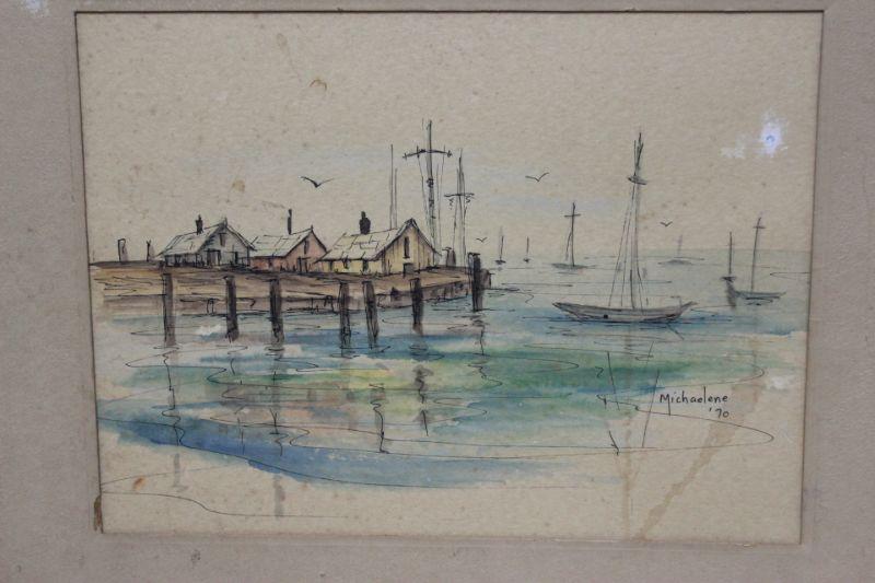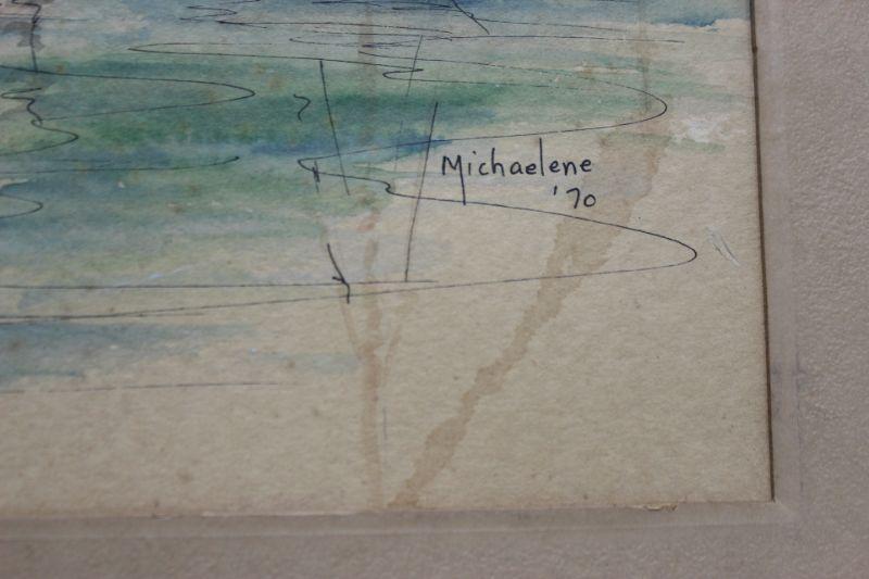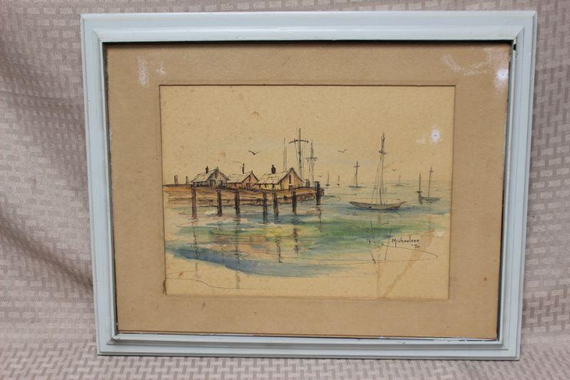 Vintage 1970 watercolor artwork by Michaelene. Painting of a shoreline fishing village with boats in the water. Has some discoloration/ spots. Frame seems to be homemade, no glass. Could be reframed to a smaller size to conceal some of the spots.