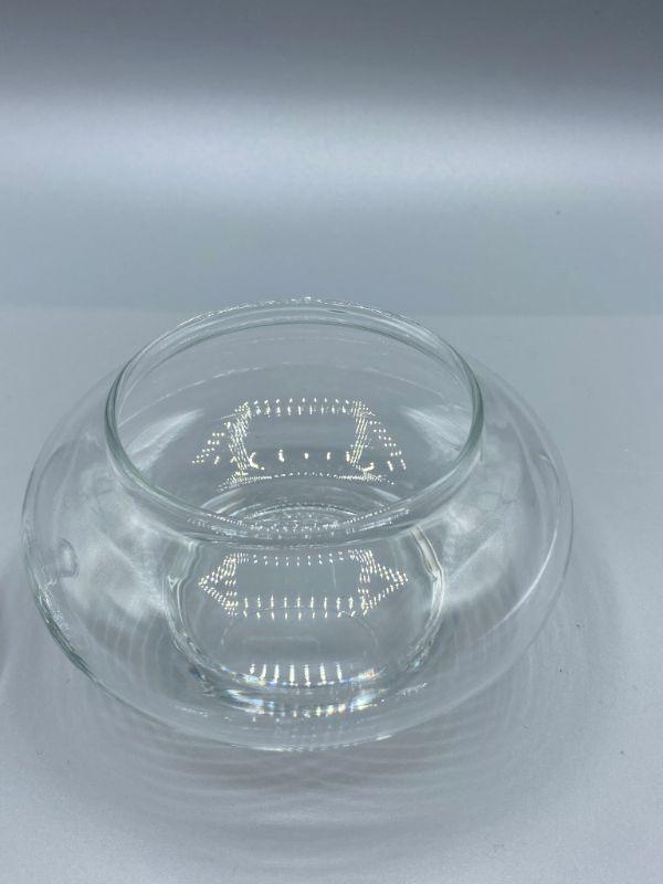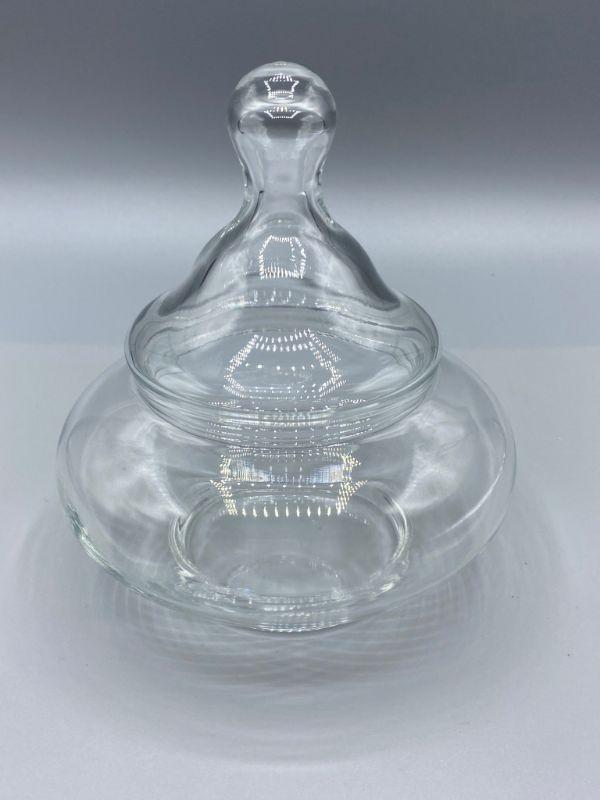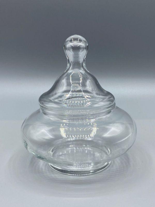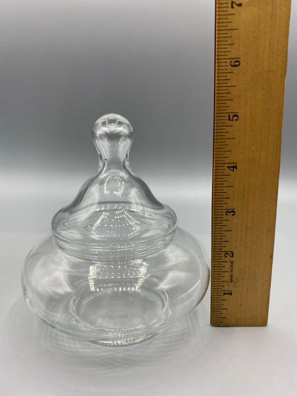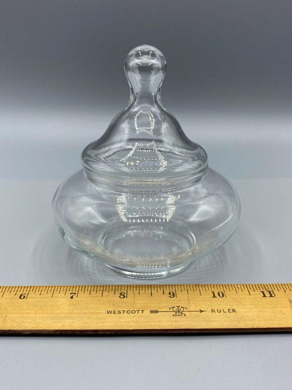 Short apothecary jar. Clear glass. Measures roughly 4" wide by 5" tall. Good condition, no chips.
