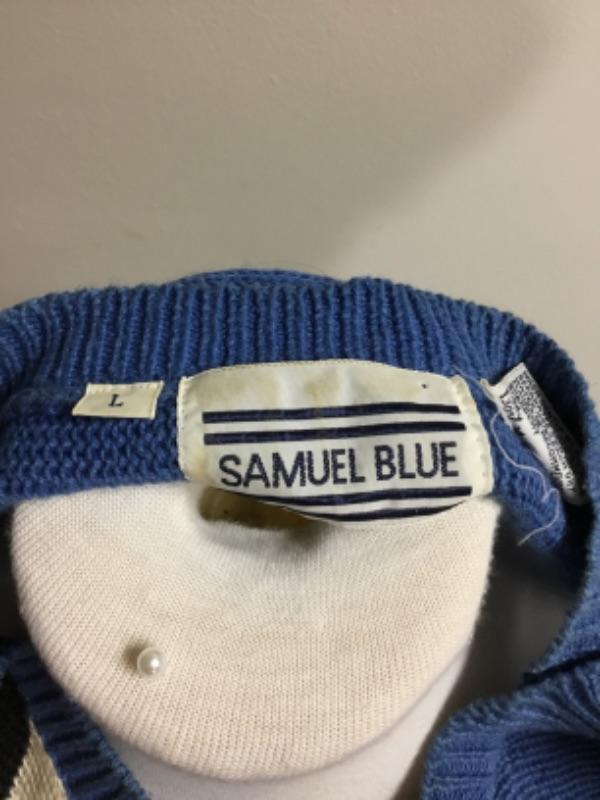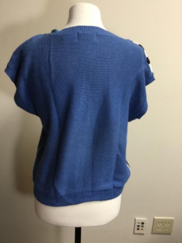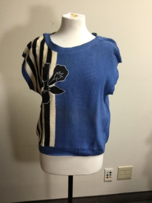 Blue, black and white short sleeve sweater top by Samuel Blue, size L large. Some light staining - see photos