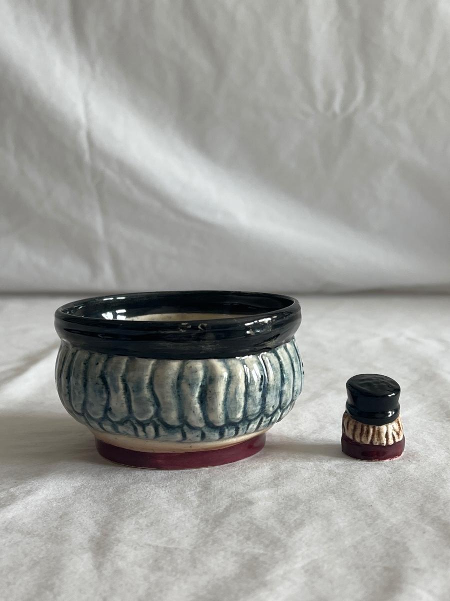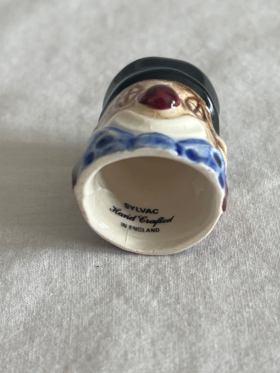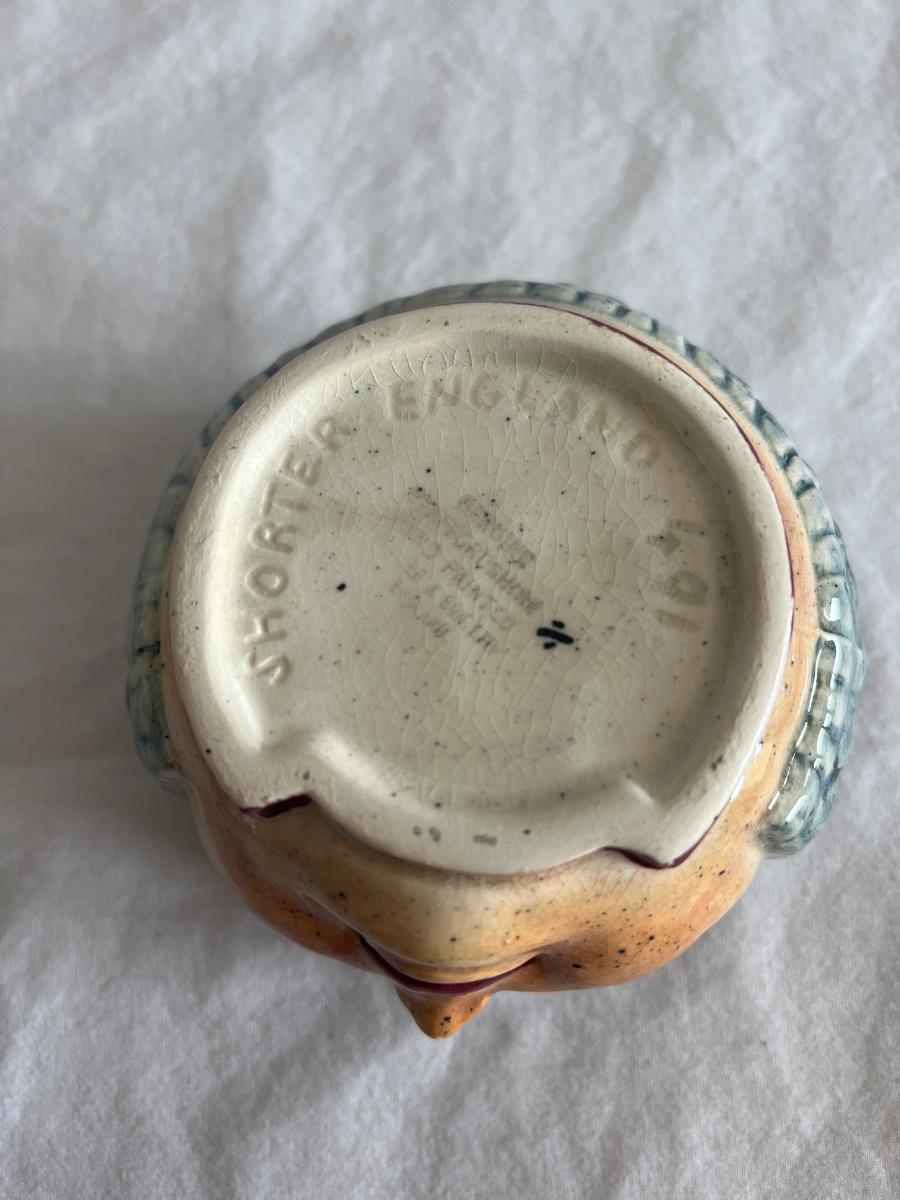This lot includes a Shorter pottery sugar bowl that measures 4”D x 2.5”H. It also includes a hand crafted Sylvac clown thimble that measures 0.75” x 1.25”H. Shipping available.
