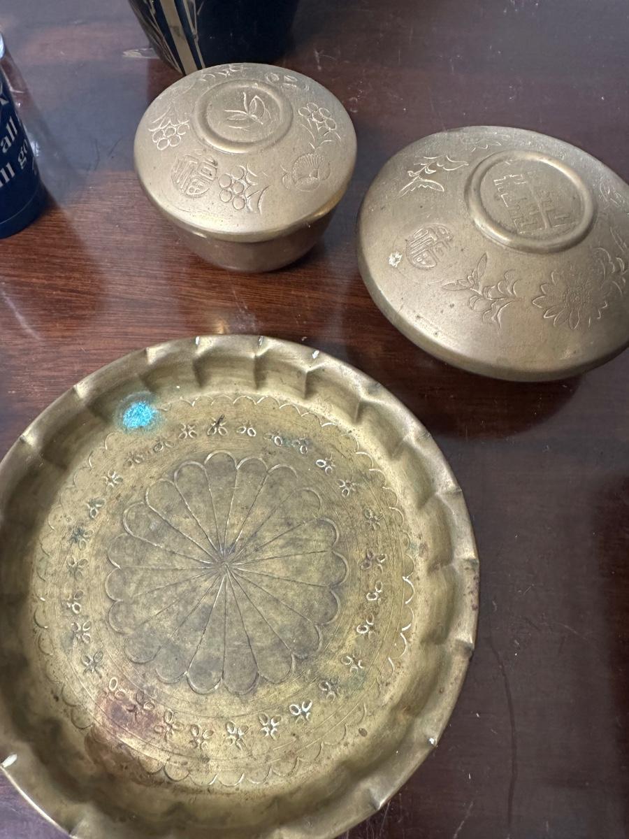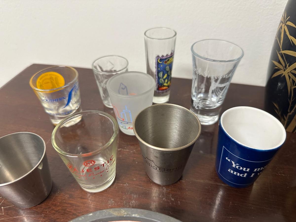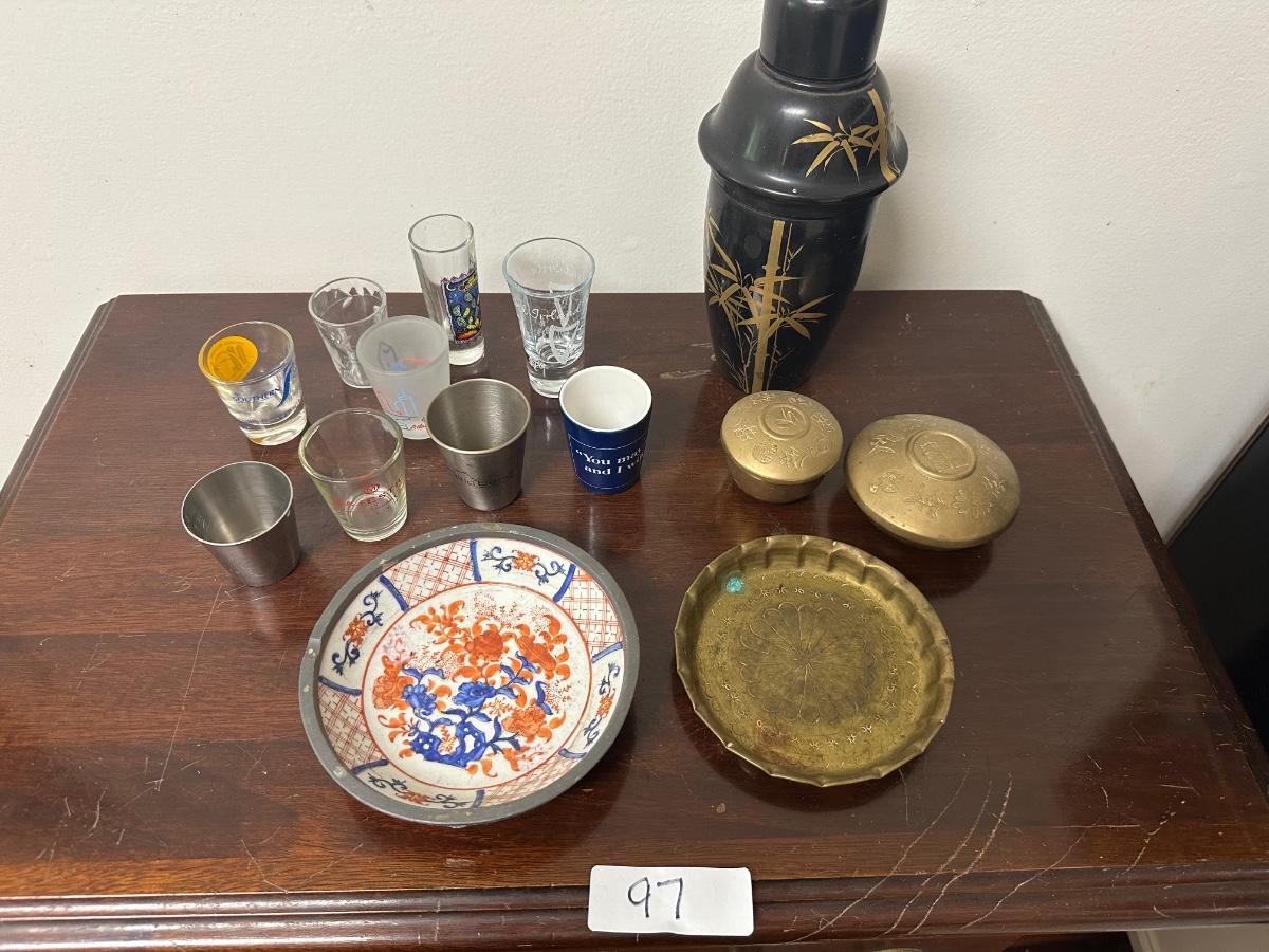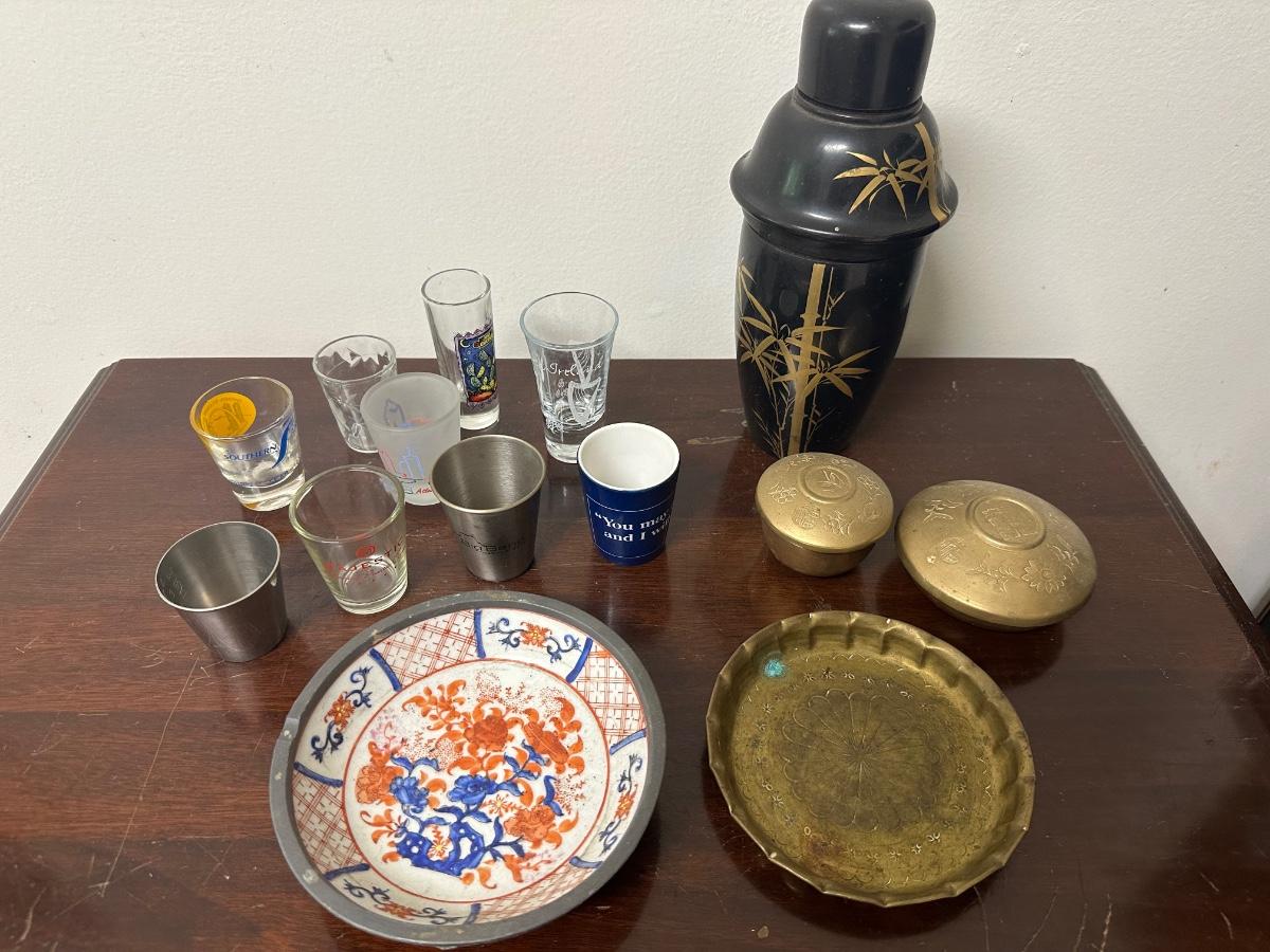 SHOT GLASSES, SHAKER, BRASS & MORE AS PICTURED