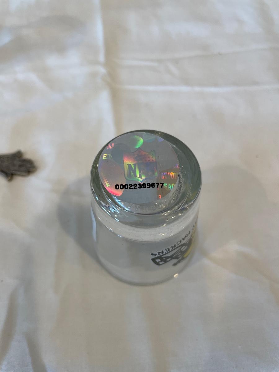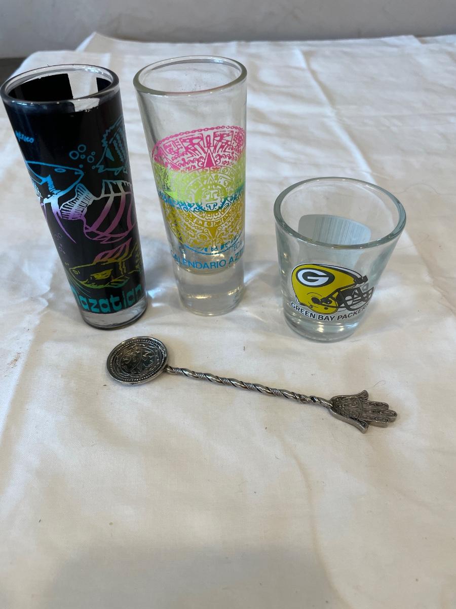 Green Bay shot glass, tall shot glasses and vintage spoon