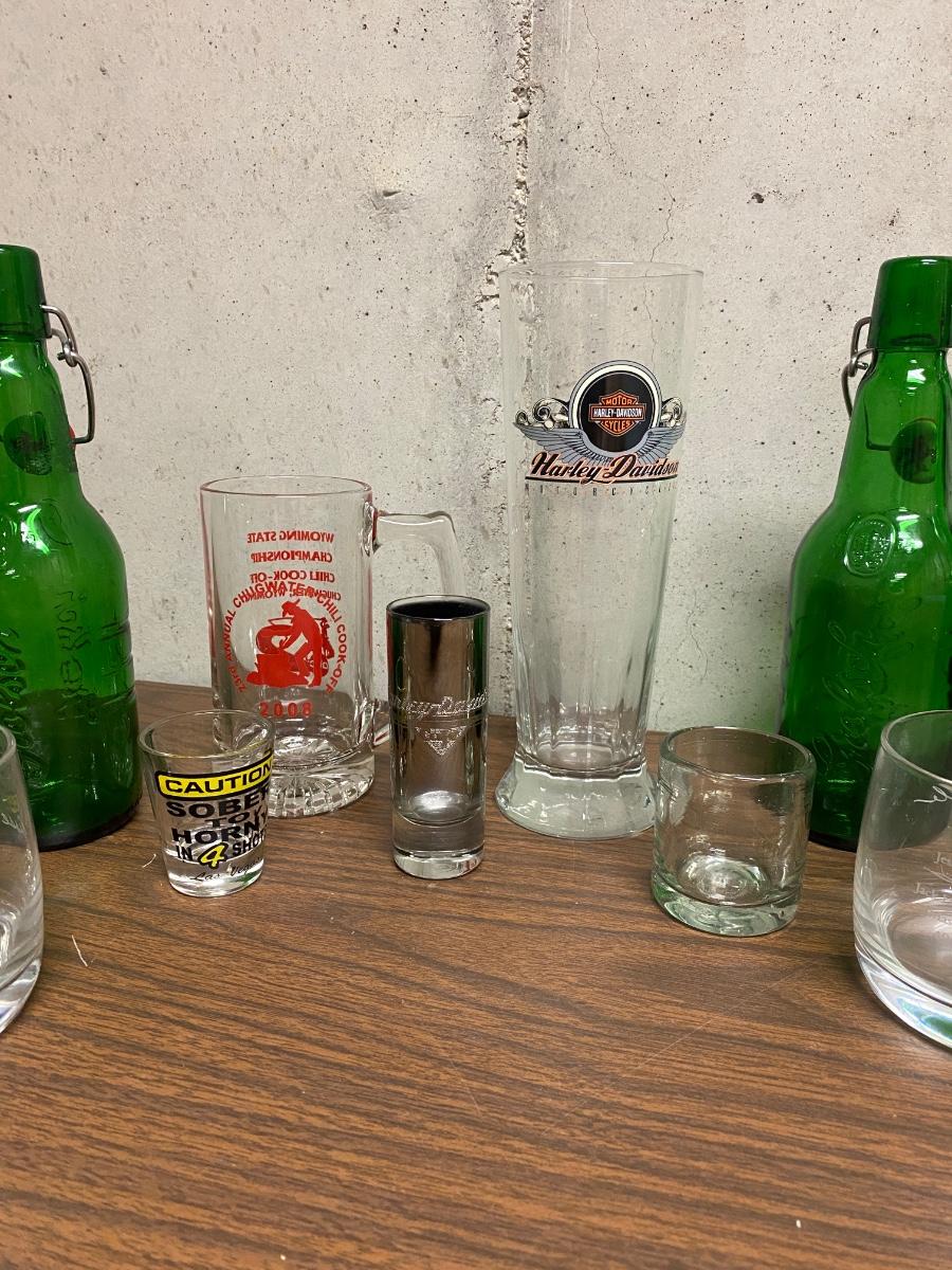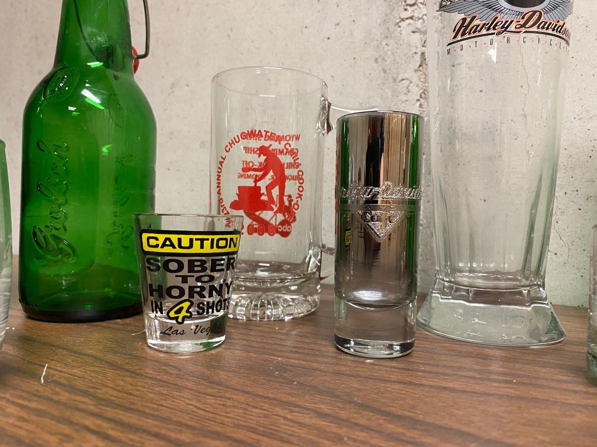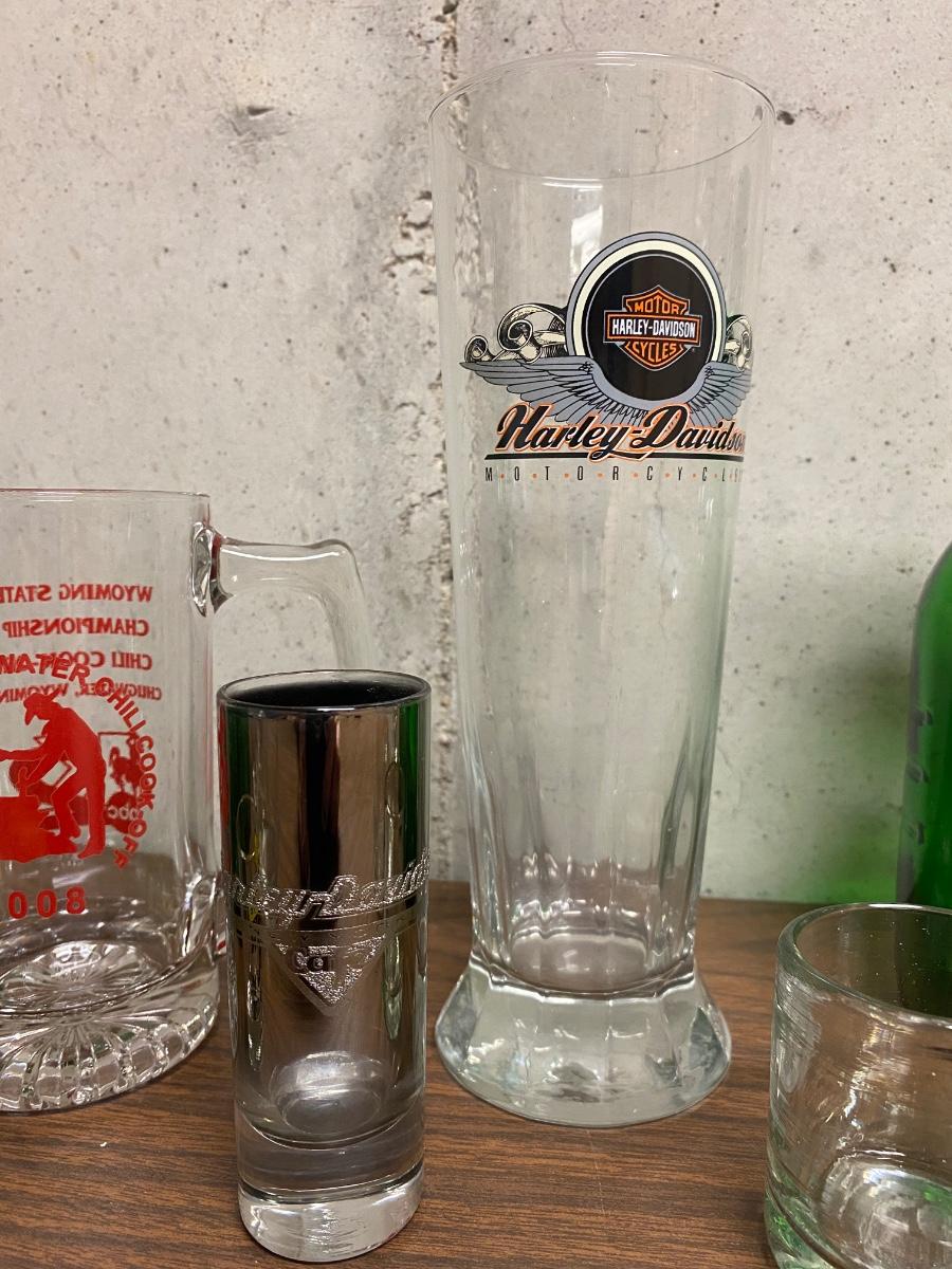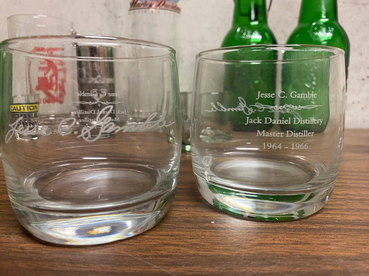 SHOT GLASSES, HARLEY DAVIDSON COLLECTABLE GLASS, JACK DANIEL’S GLASSES AND MORE